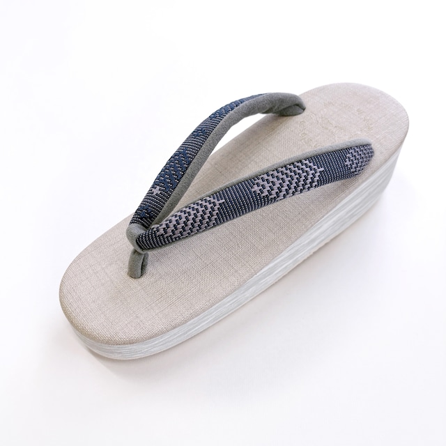 鼻緒素材:絹 鼻緒裏:エクセーヌ(ポリエステル・ポリウレタン) 天素材:PVC(塩化ビニル) 台/底:EVA/合成ゴム サイズ:M(23.0~24.5㎝) 高さ 5.5㎝ スニーカーのように歩きやすい履き心地で人気の、菱屋カレンブロッソ・カフェ草履。 桐生の織物ブランド【OLN】の帯地を鼻緒に使用したコラボモデルです。 うすグレー台にライトグレーの天、OLNの帯地「松菱」ネイビーの鼻緒。明るく上品で落ち着いた配色が、コーディネートしやすくベーシックに活躍する一足です。織りの立体感が特徴的な鼻緒が、シンプルながらもおしゃれな足元を演出してくれます。 天は汚れや水に強いPVC素材です。 紬から小紋まで、カジュアルな着物に合わせて軽やかな履き心地をお楽しみください。 ※ご覧いただいている環境によって、若干色味が違って見える場合がございます。 ご了承くださいませ。 ※送料は全国一律1000円です。