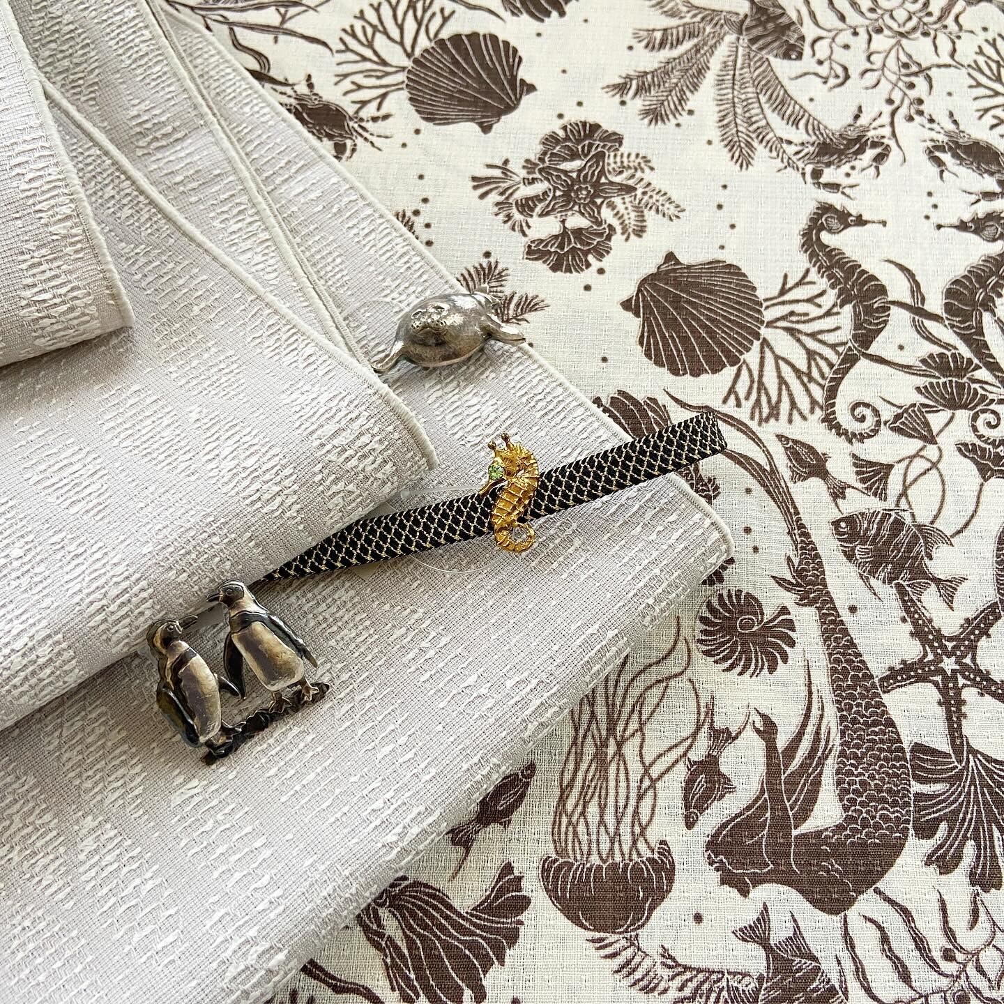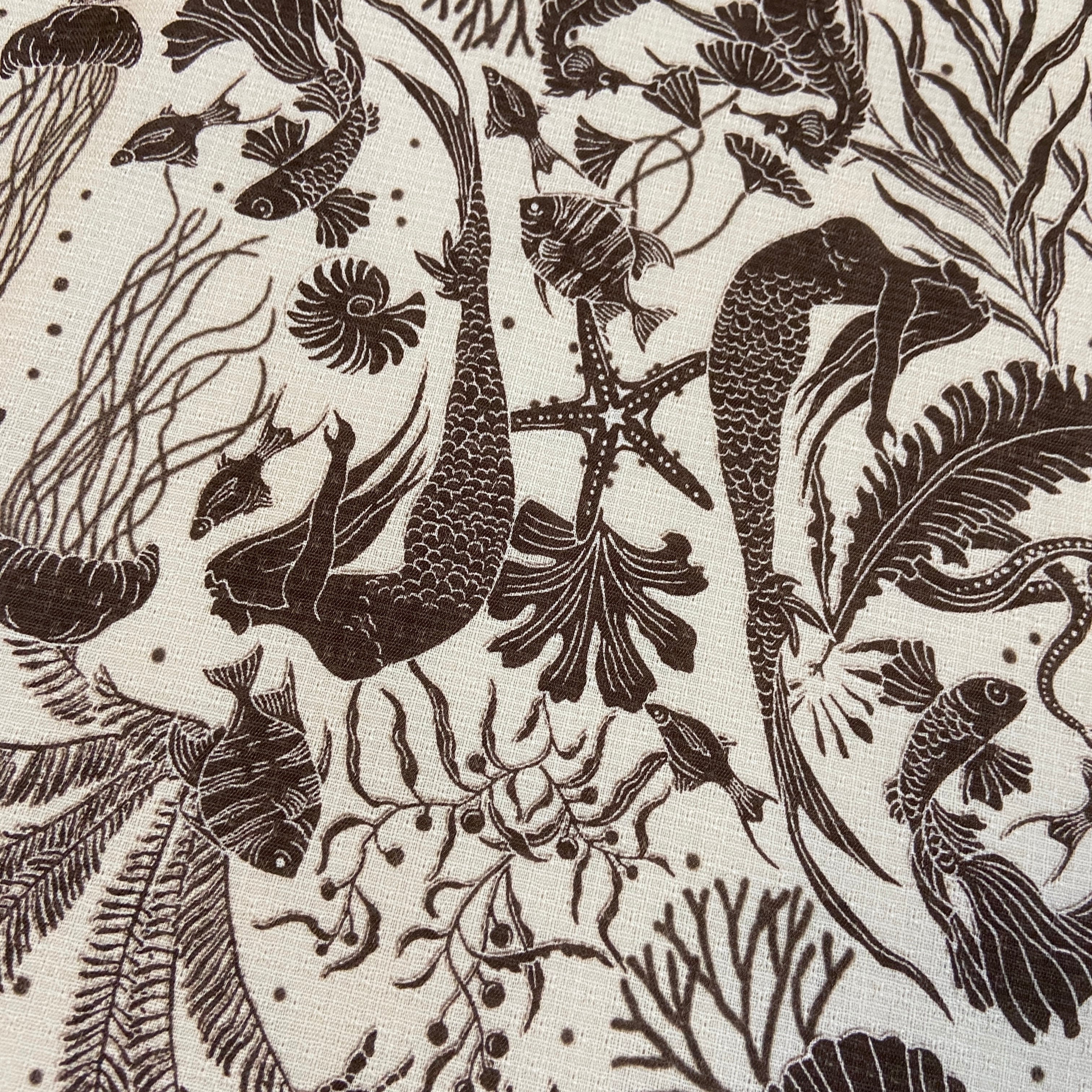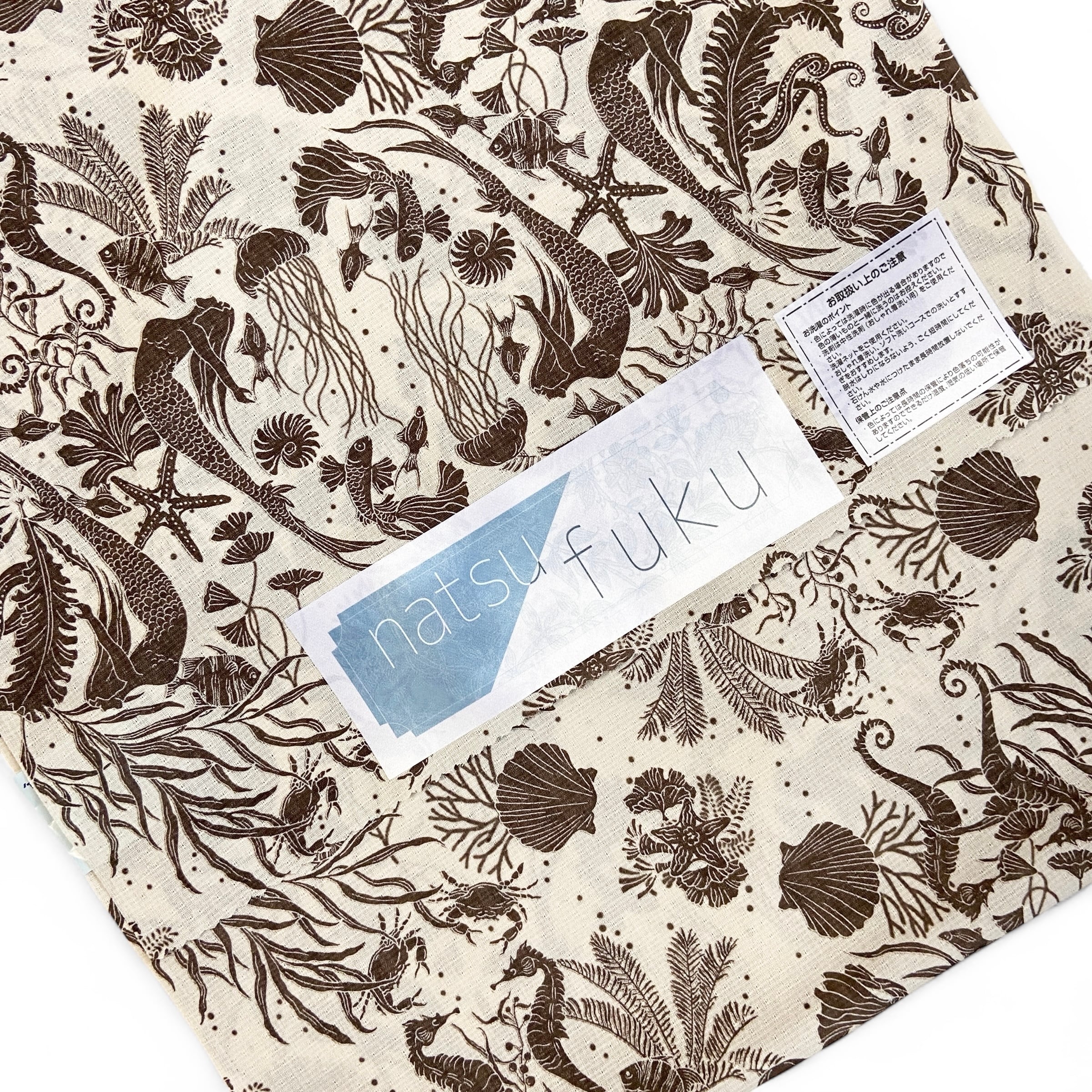 繊細なタッチで描かれたマーメイドや海の仲間たちは、アールヌーボーのようなクラシックさを感じる素敵なデザイン。オフホワイト地にブラウンの配色もおしゃれです。