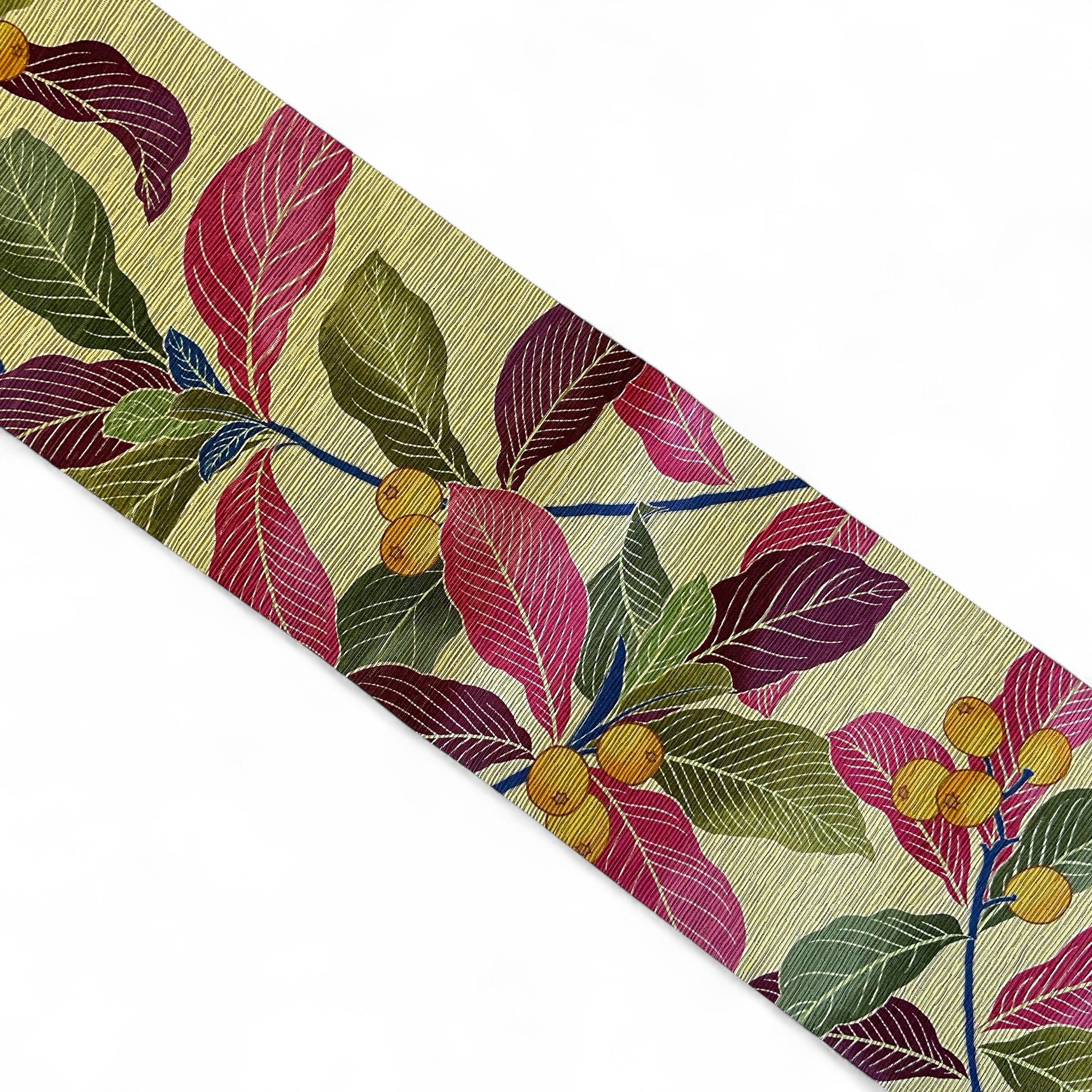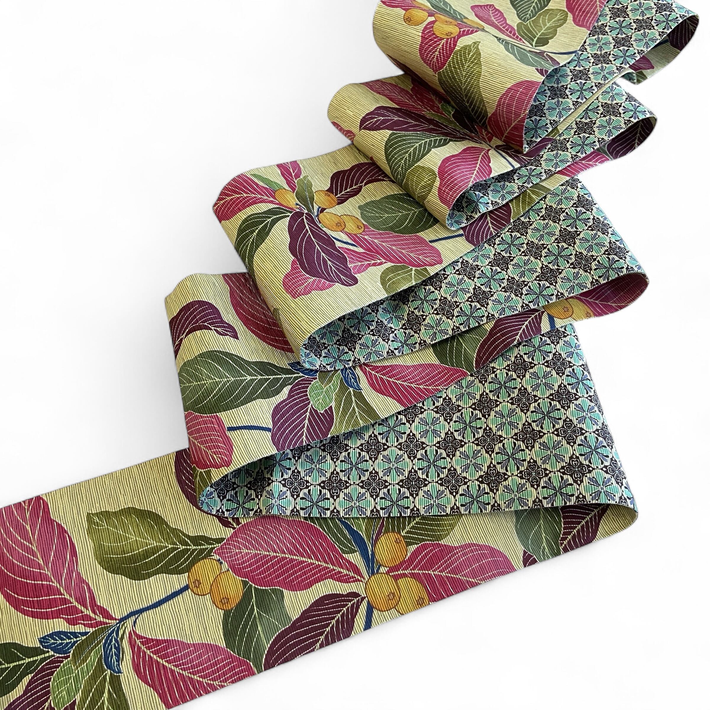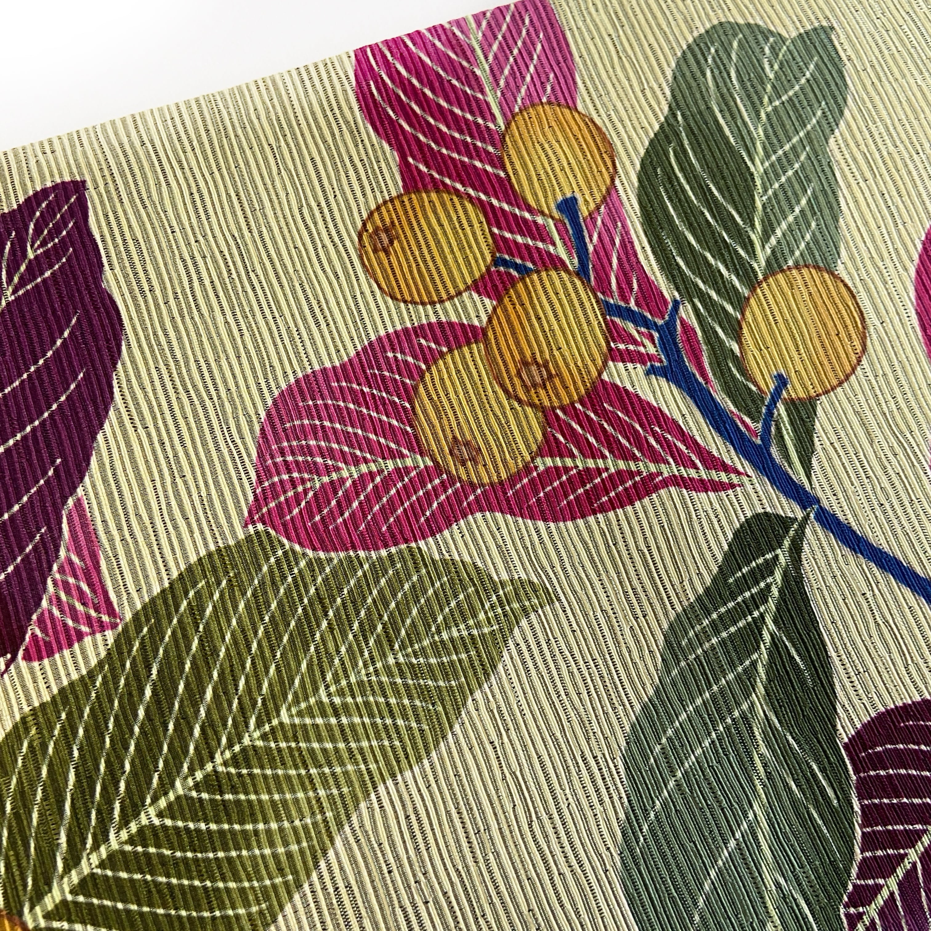 落ち着いたイエローベージュの地に、赤紫とグリーンの葉が印象的な配色。鮮やかな反対色の組み合わせながらも、深みのある大人のイメージです。