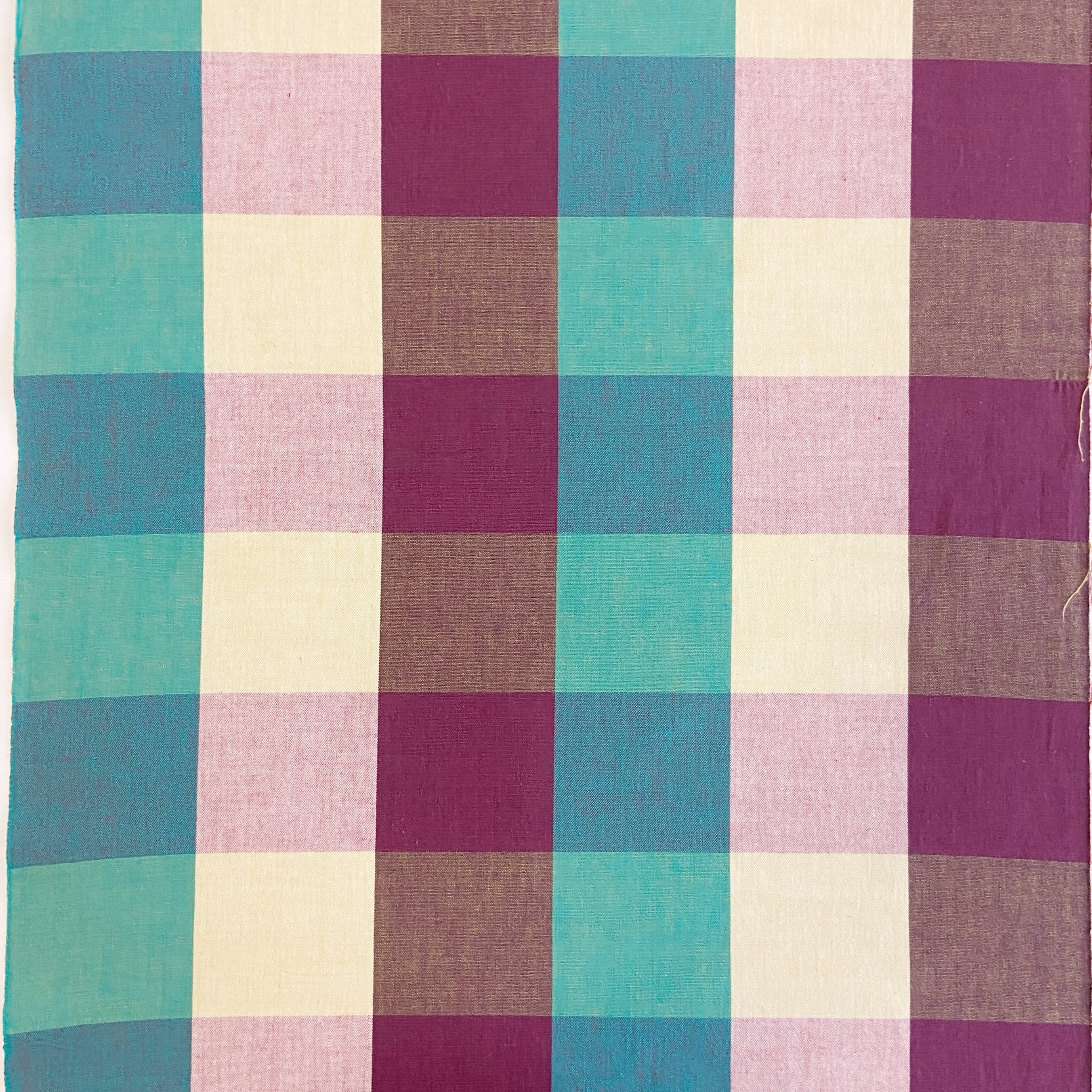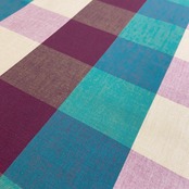 深みのある赤みの紫とターコイズの配色が、メリハリがきいて印象的なブロックチェック。