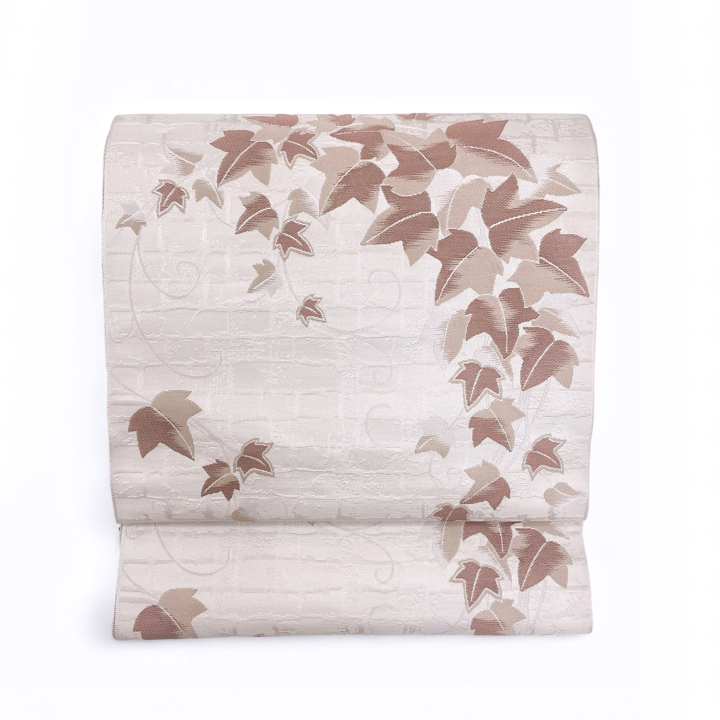 お太鼓柄ではなく前柄も同じ柄の繰り返しですので、柄出しに苦労せずに締めていただけます。葉が多い部分と少ない部分が繰り返し出てきますので、前に出す部分を調整して帯留などの組み合わせもお楽しみください。