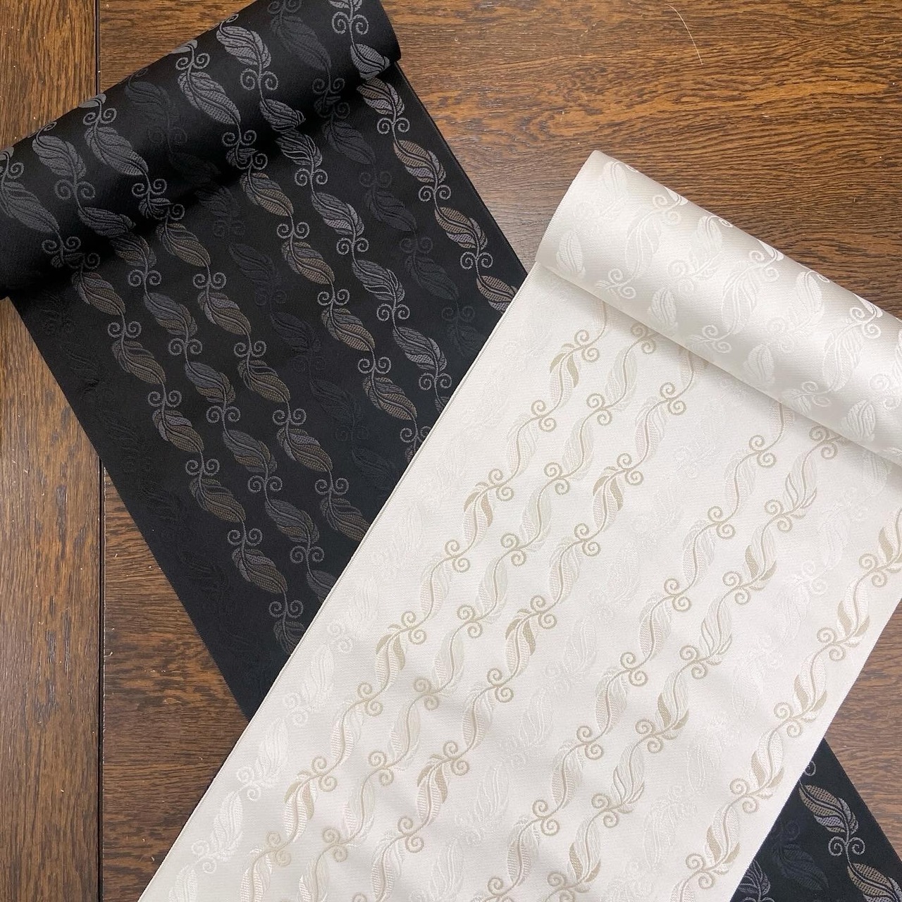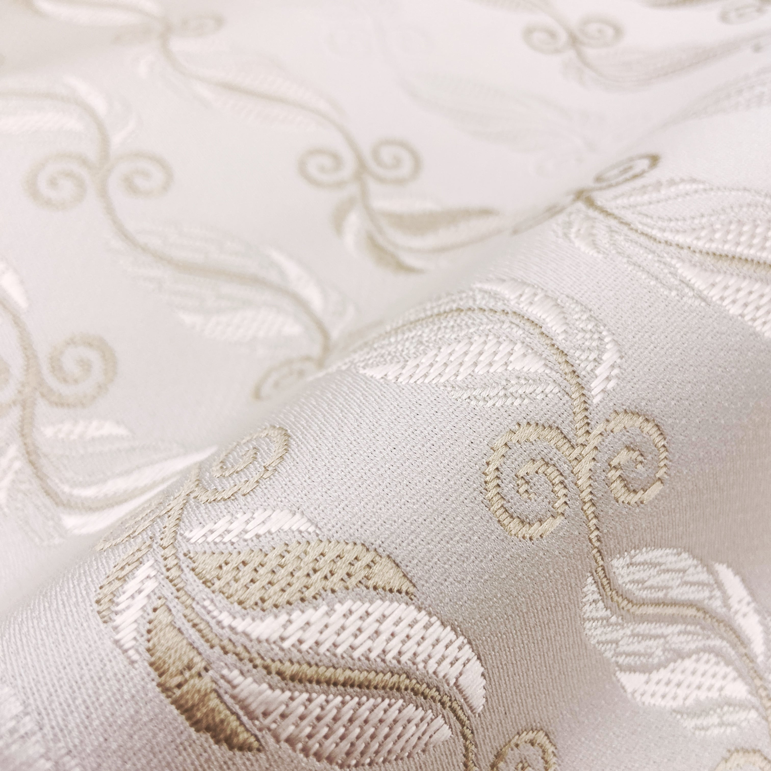 光沢のある生地感に織り模様の羽根柄の立体感が、高級感のある仕上がりになりました。見る角度によって柄が見え隠れする織りの味わいがあります。
