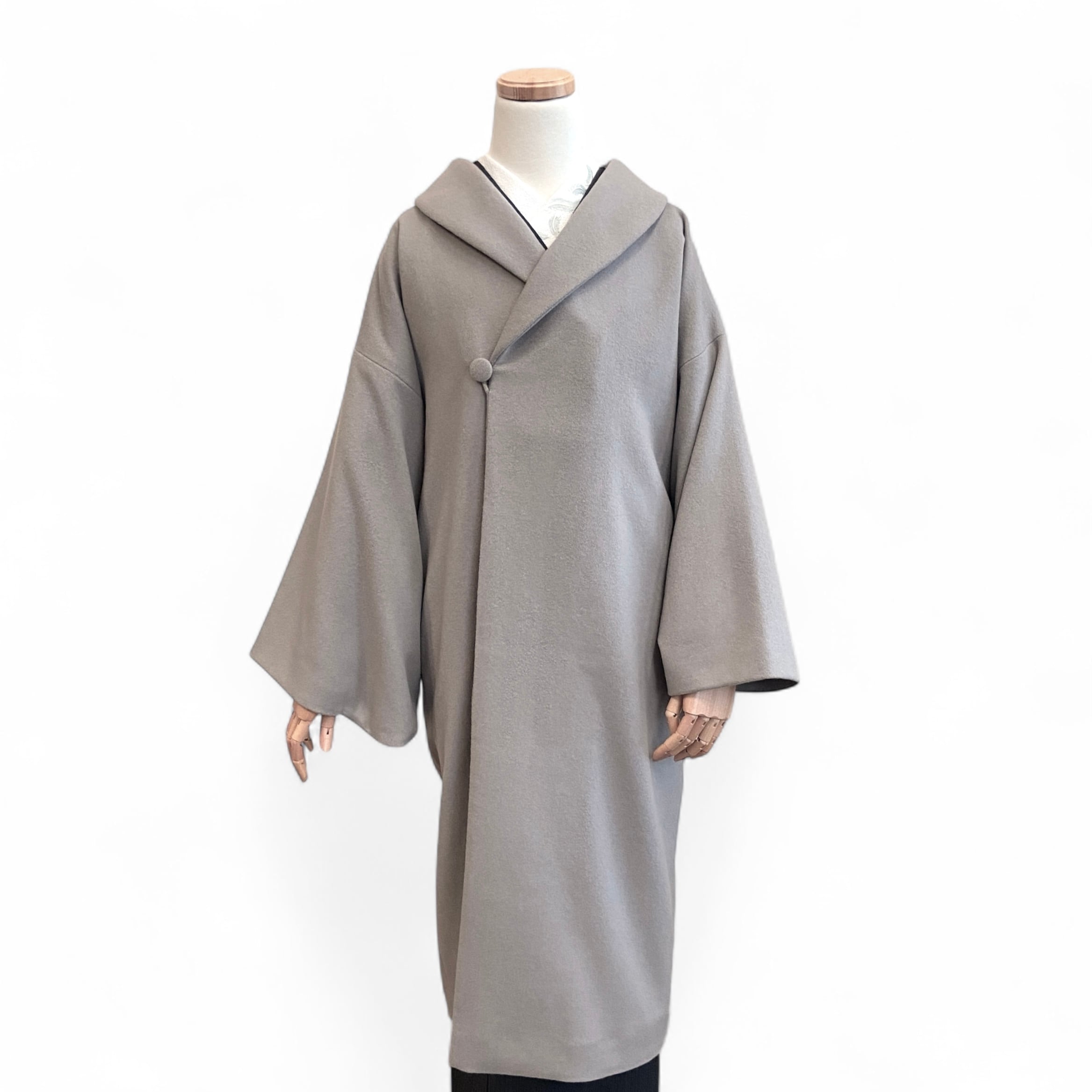 ひざまですっぽり隠れる暖かい長さ、裄・身巾もたっぷり目のデザインで、襟元は着物の衿にきれいなカーブが添うヘチマカラーです。