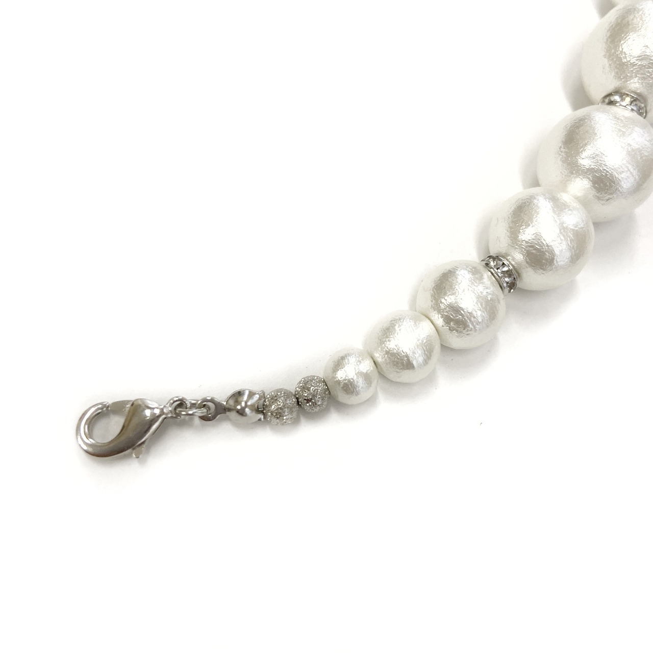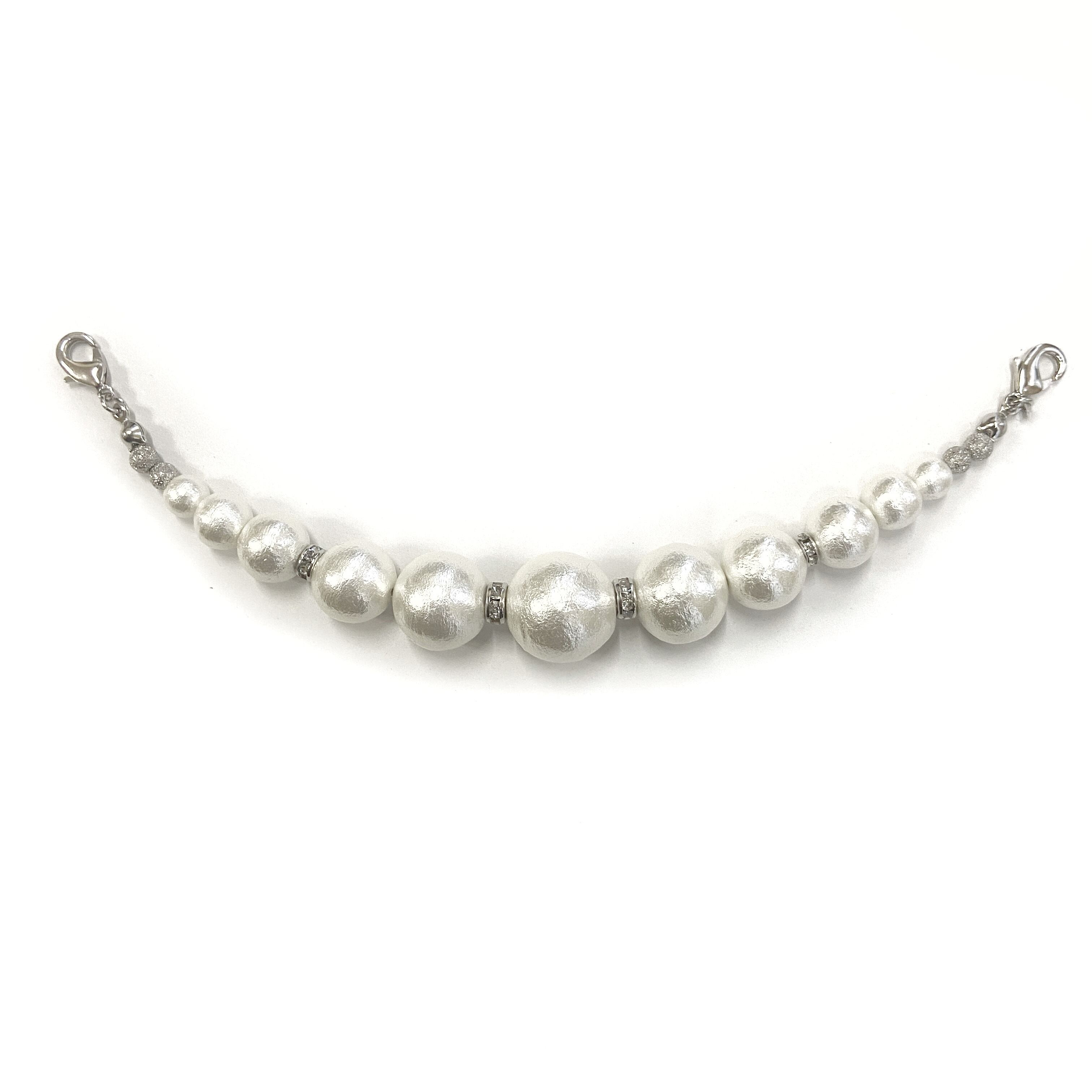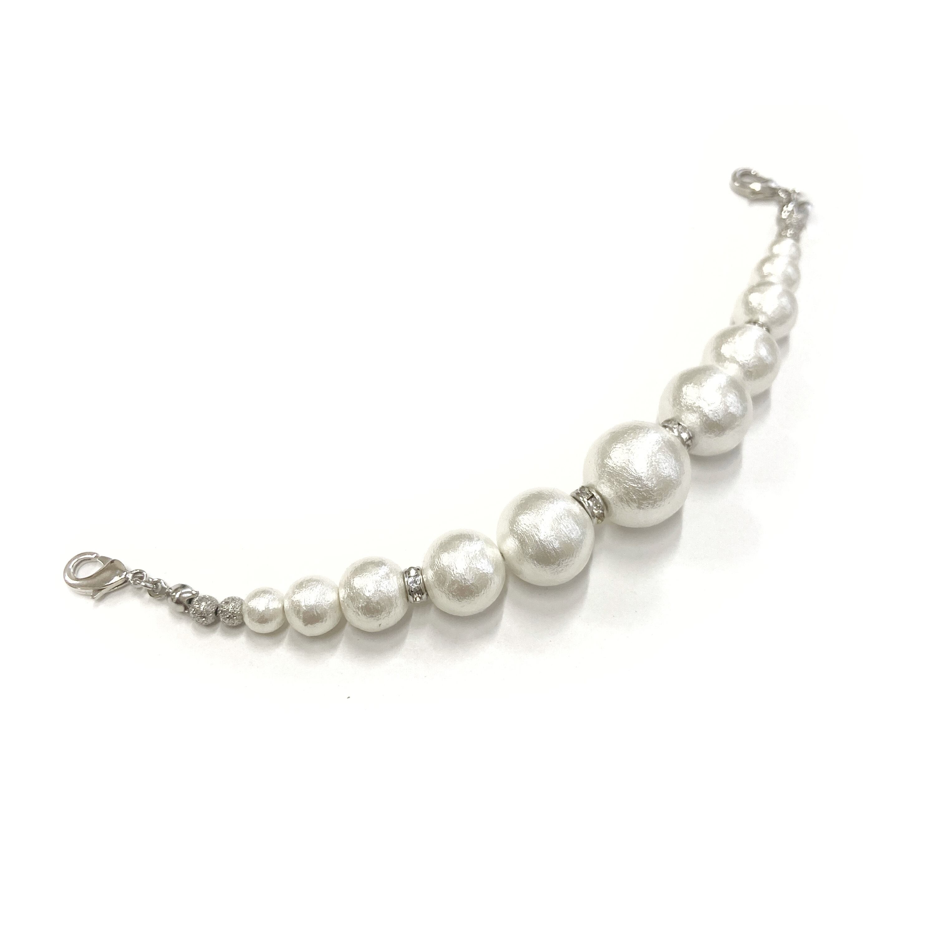シンプルな白のパールの大小のグラデーションに、ラインストーン付のシルバーカラーのリングを間に組み合わせた、さりげなく上品な雰囲気。