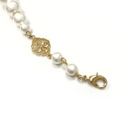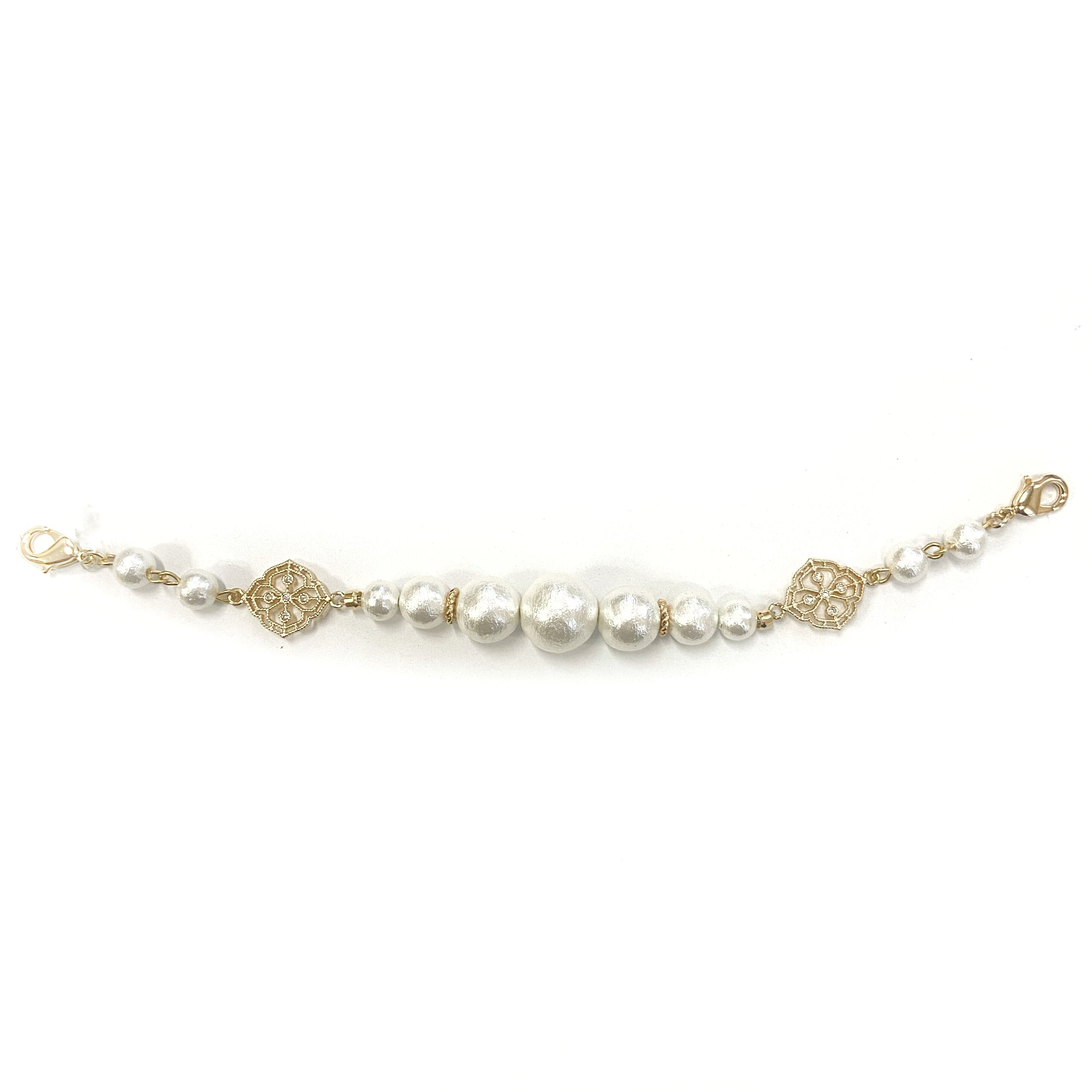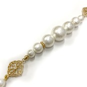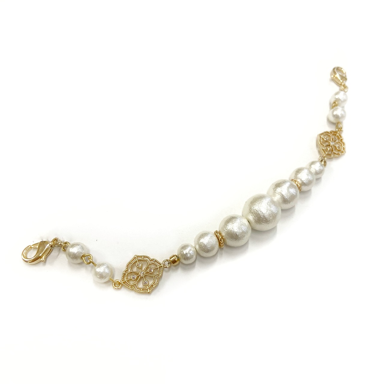 白のパールの大小のグラデーションに、ゴールドカラーの透かし模様のパーツを組み合わせた、繊細で上品ながら華やかさのある雰囲気です。