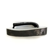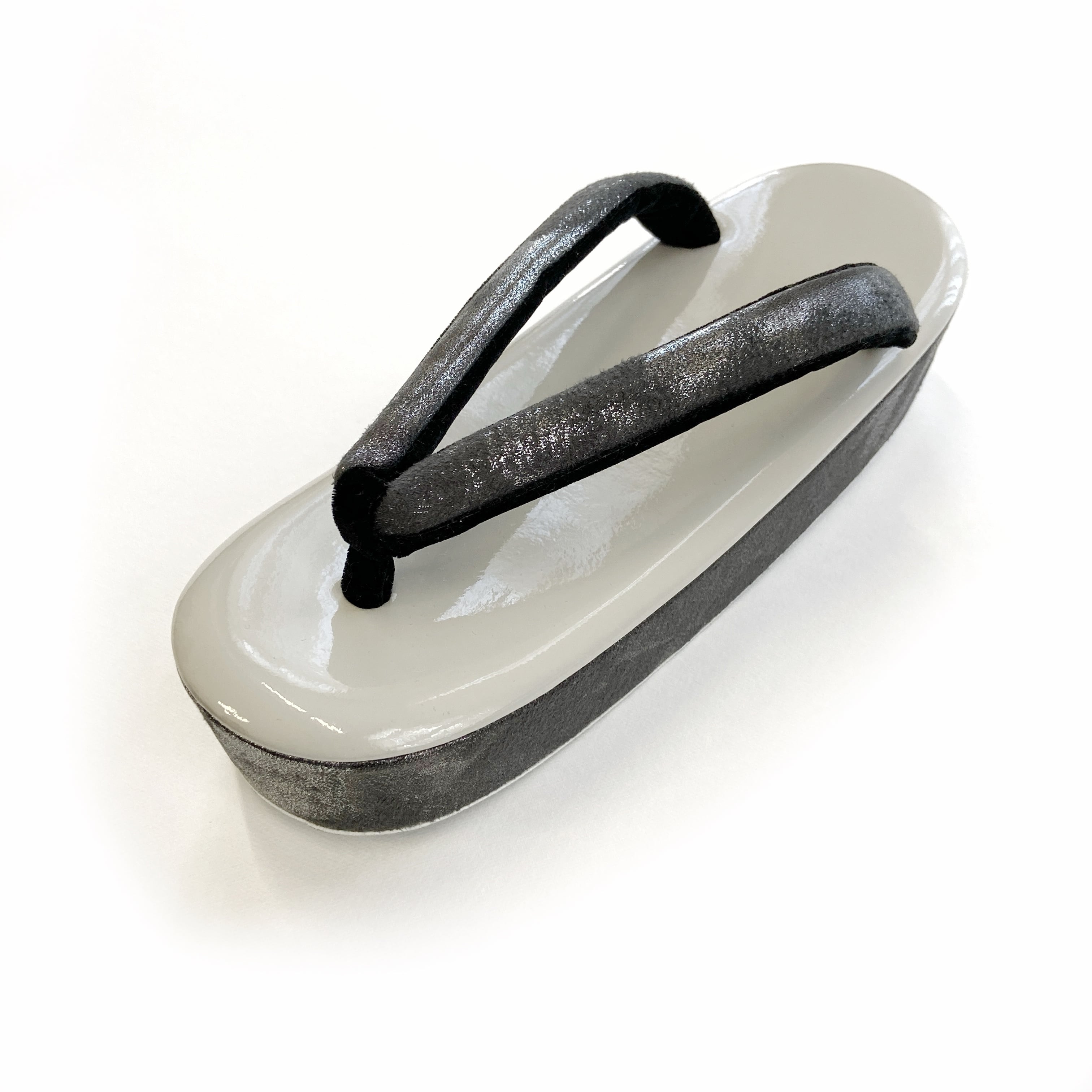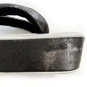 一見レザーのようにも見える、メタリック加工したブラックのデニム生地を、鼻緒と横巻に使用しました。
