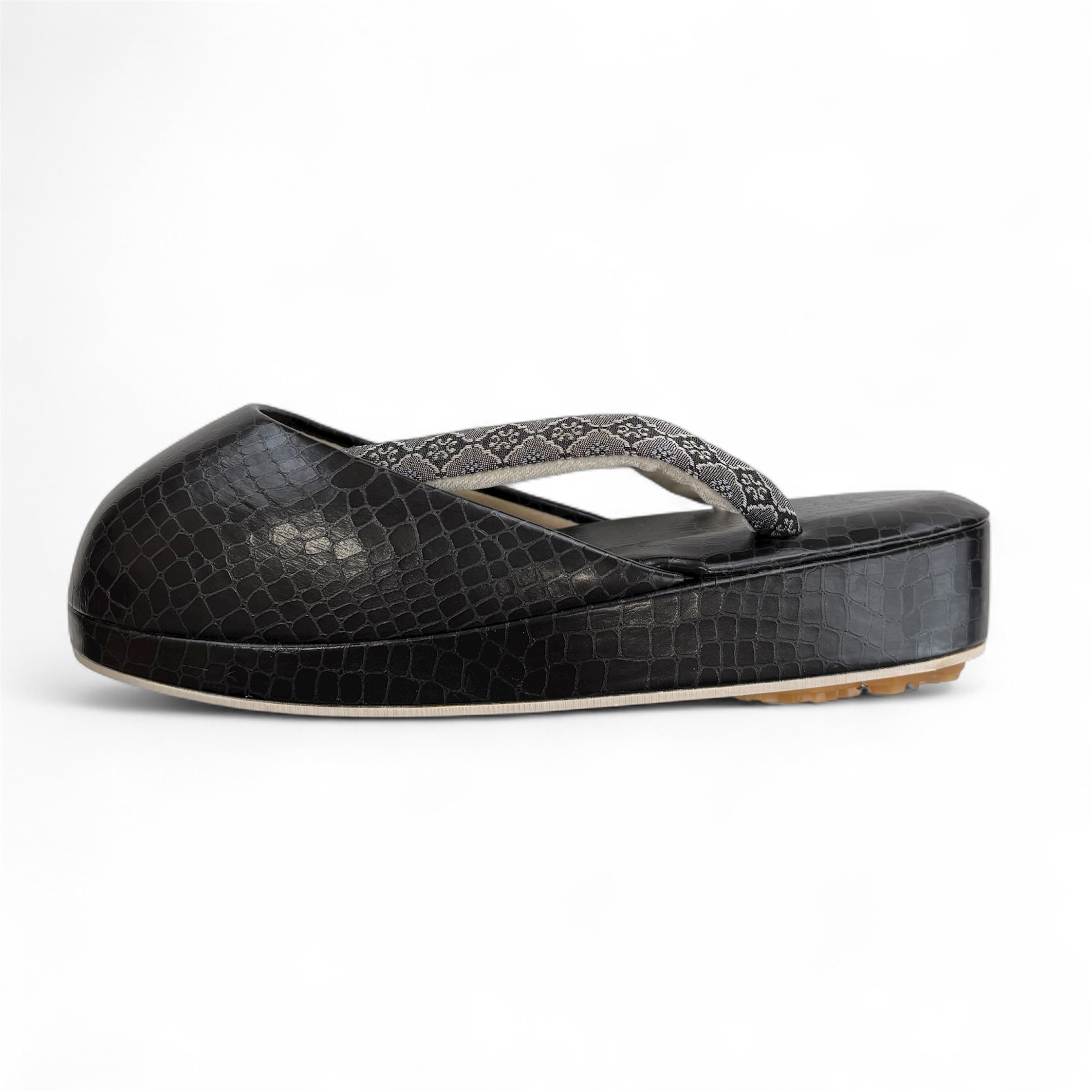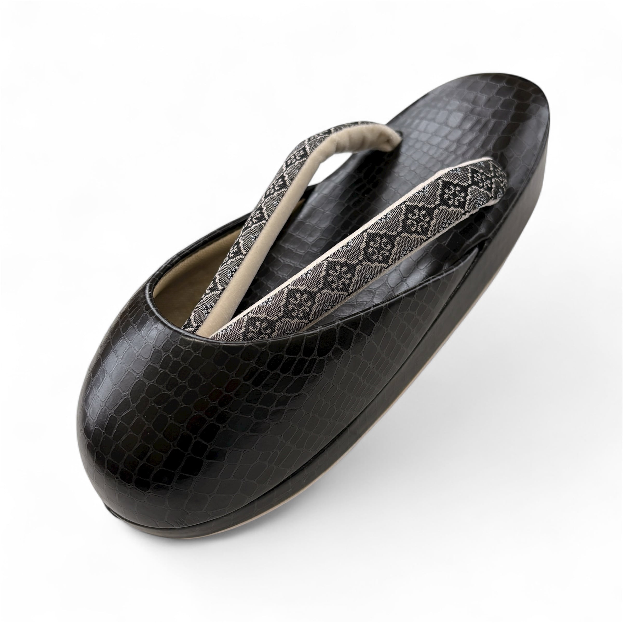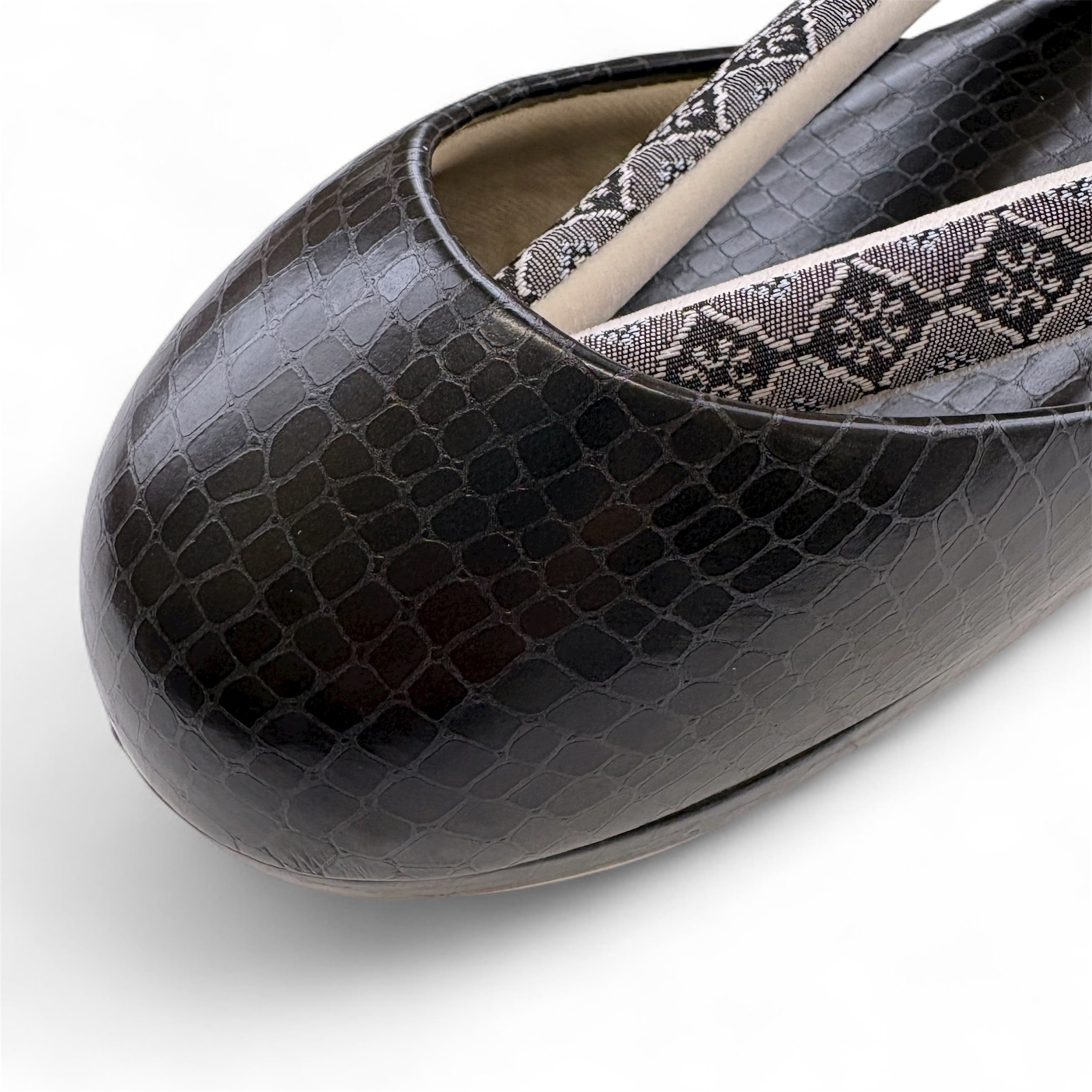 グレーの幾何学模様のジャガード生地の鼻緒を組み合わせた、シックな配色。個性もありつつベーシックで上品な一足です。