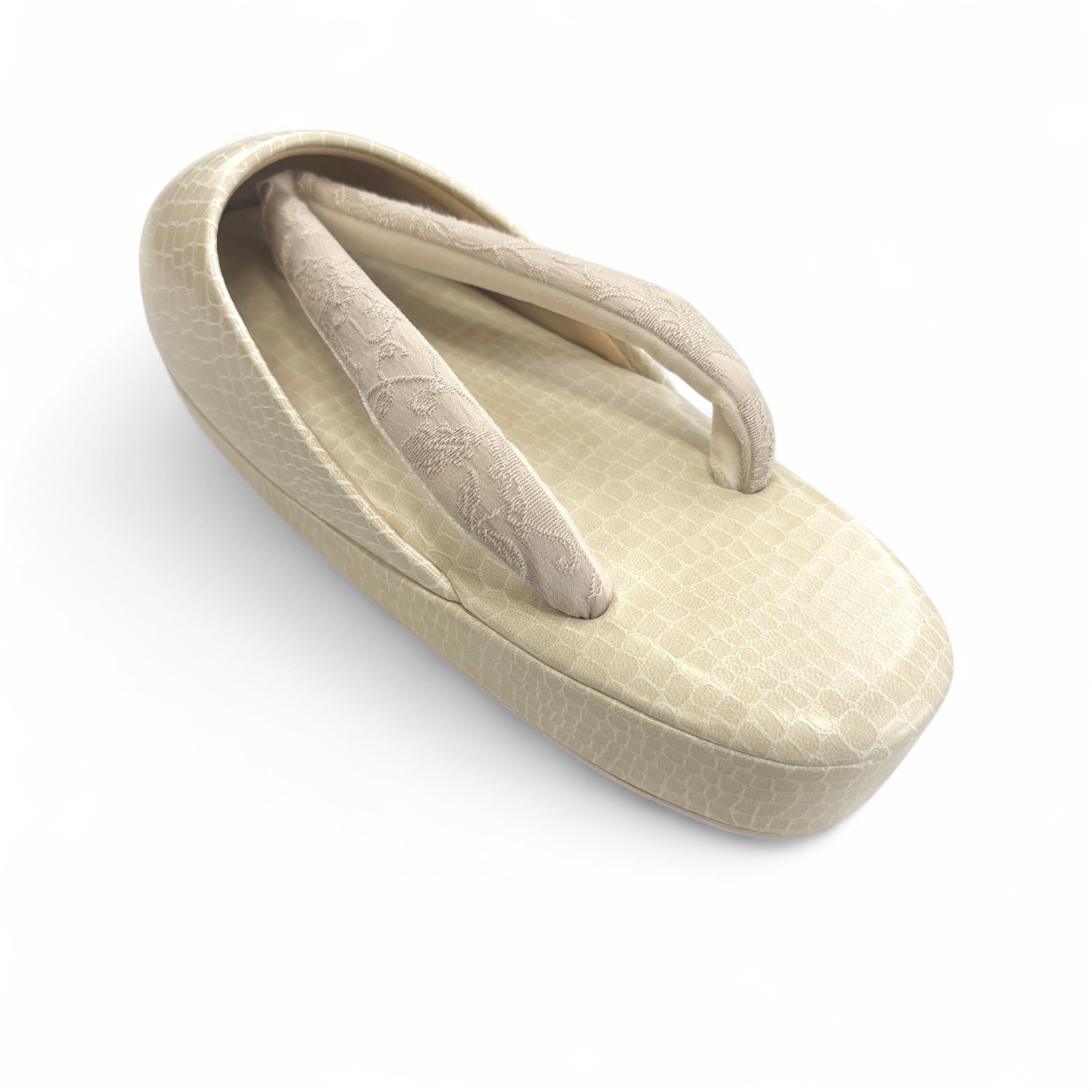 淡いベージュの花柄が織り出されたジャガード生地の鼻緒を組み合わせた冬の白い足元は、とても上品で人気のカラー。エレガントな気分になれる一足です。