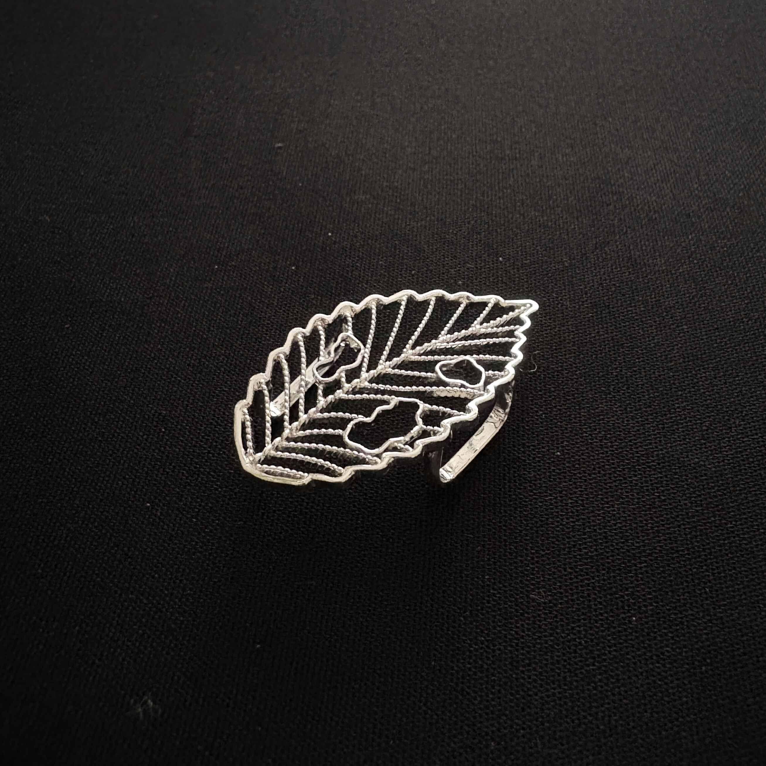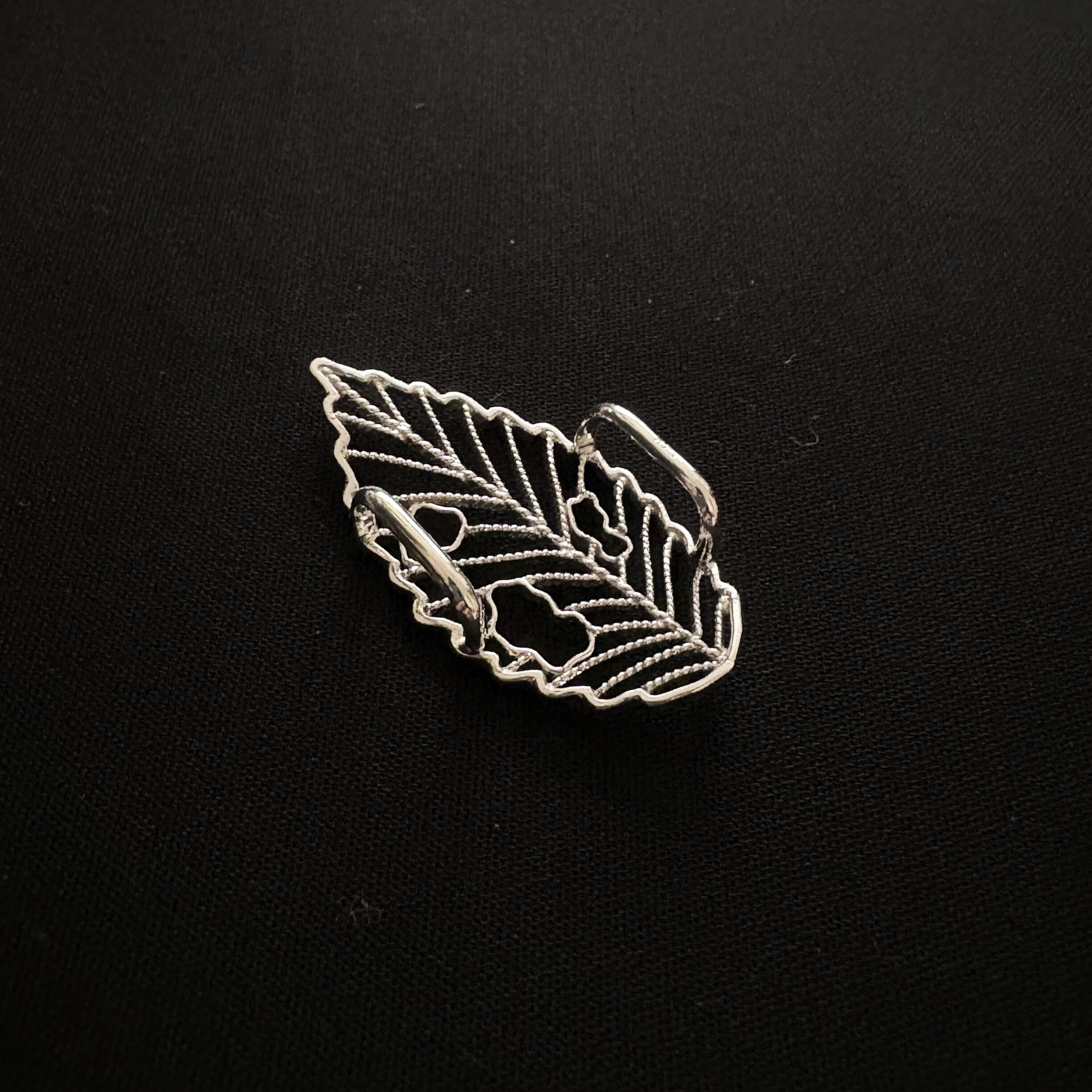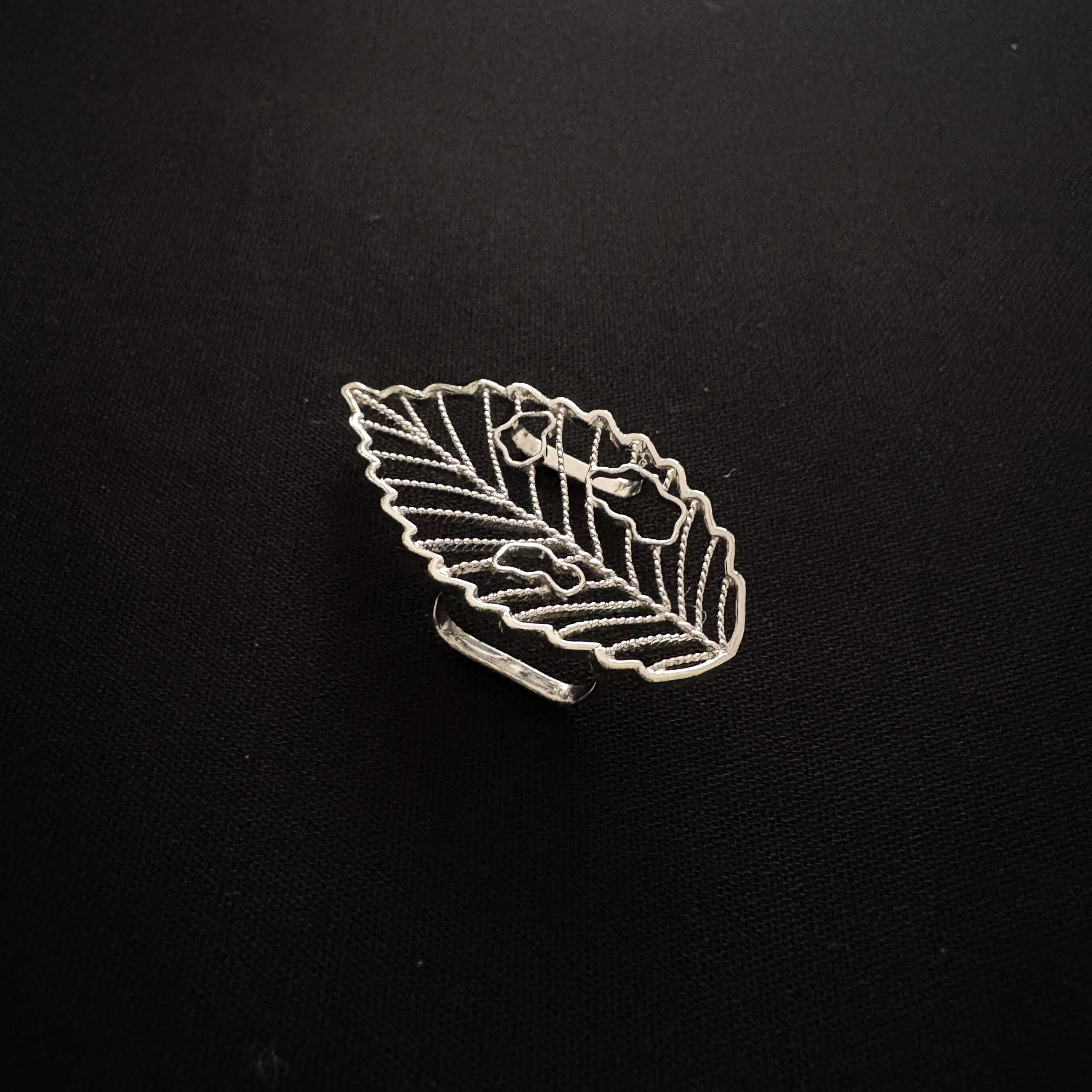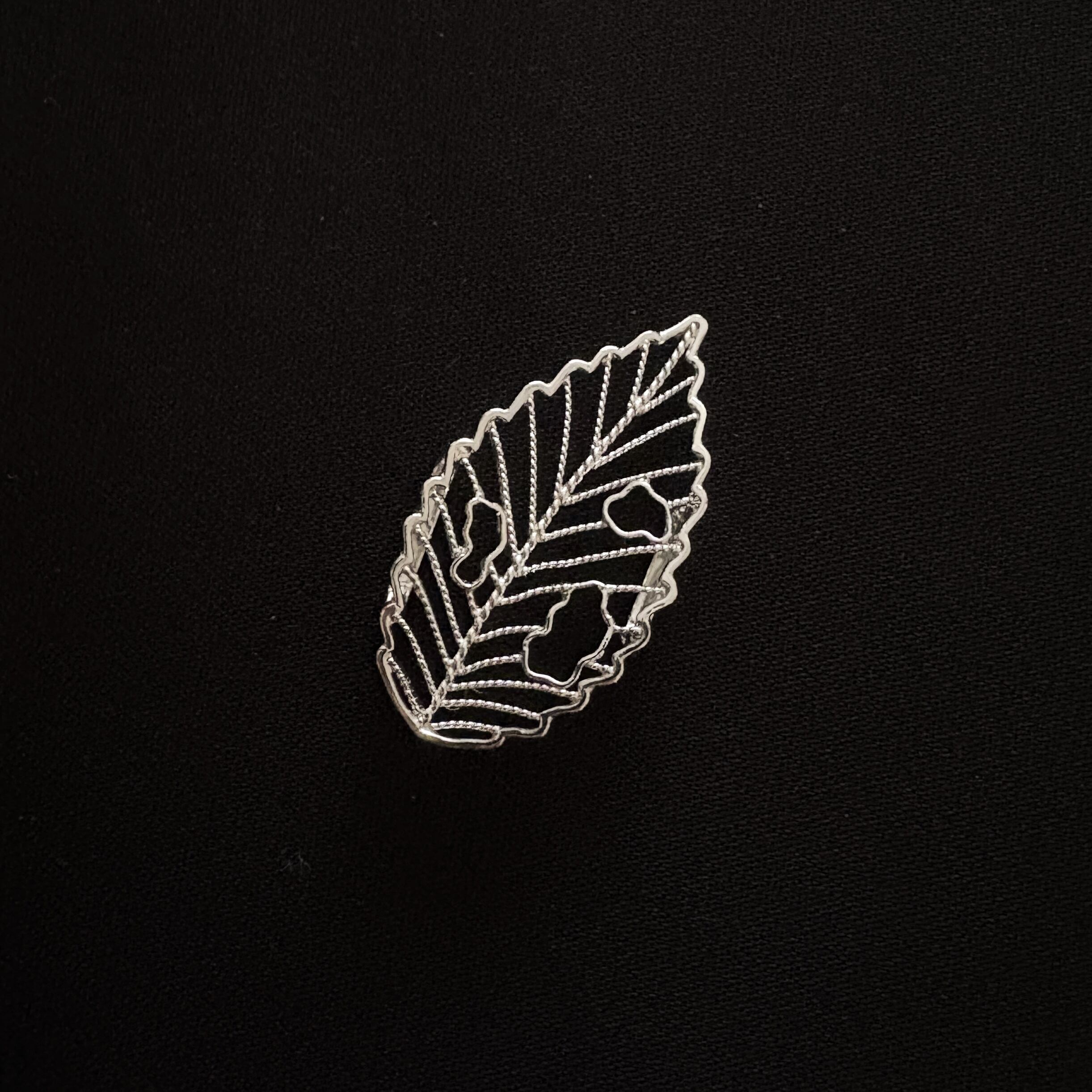 葉脈や虫食いまでも極細の銀線で表現されたひとひらの葉が、まるで自然を写したような生き生きとした存在感。