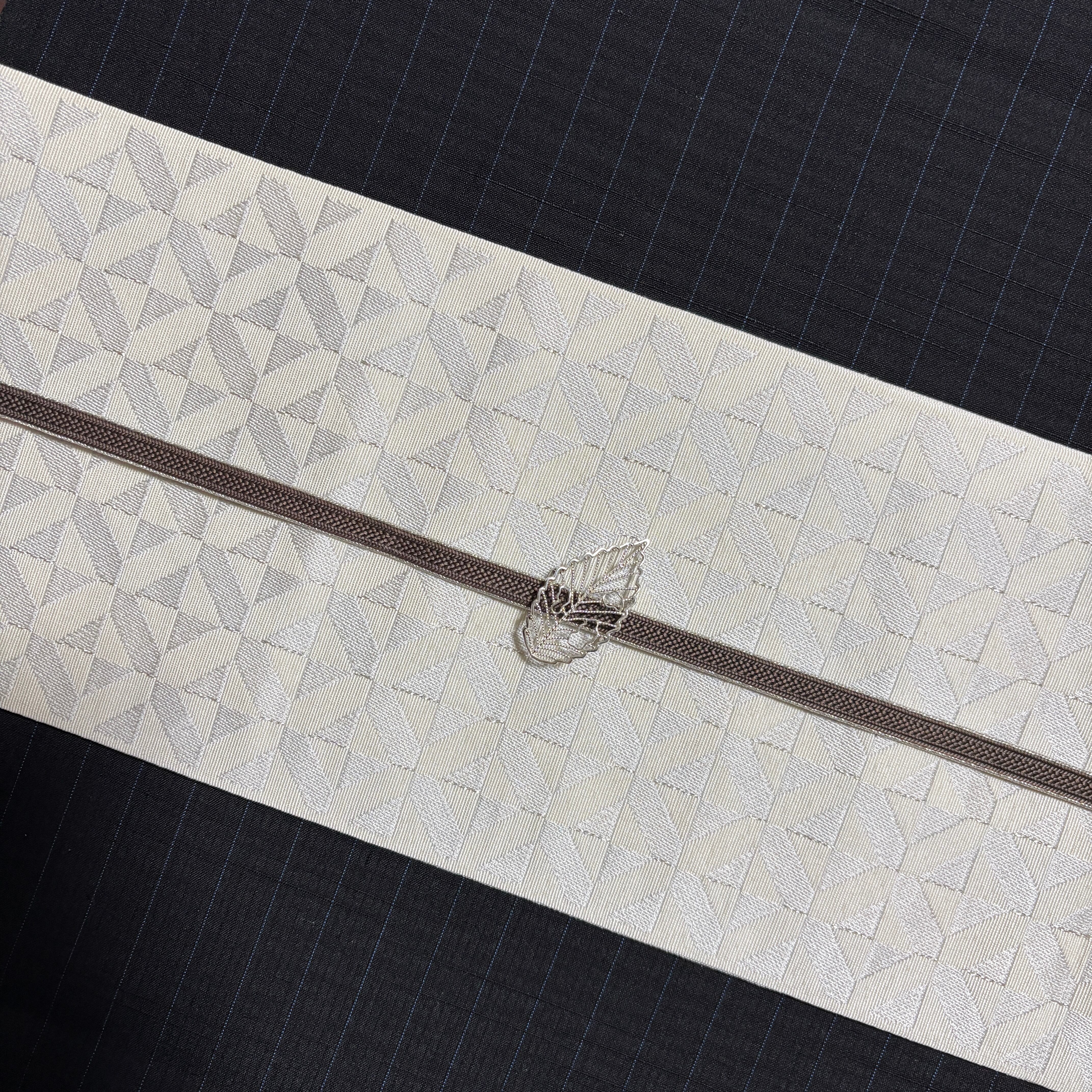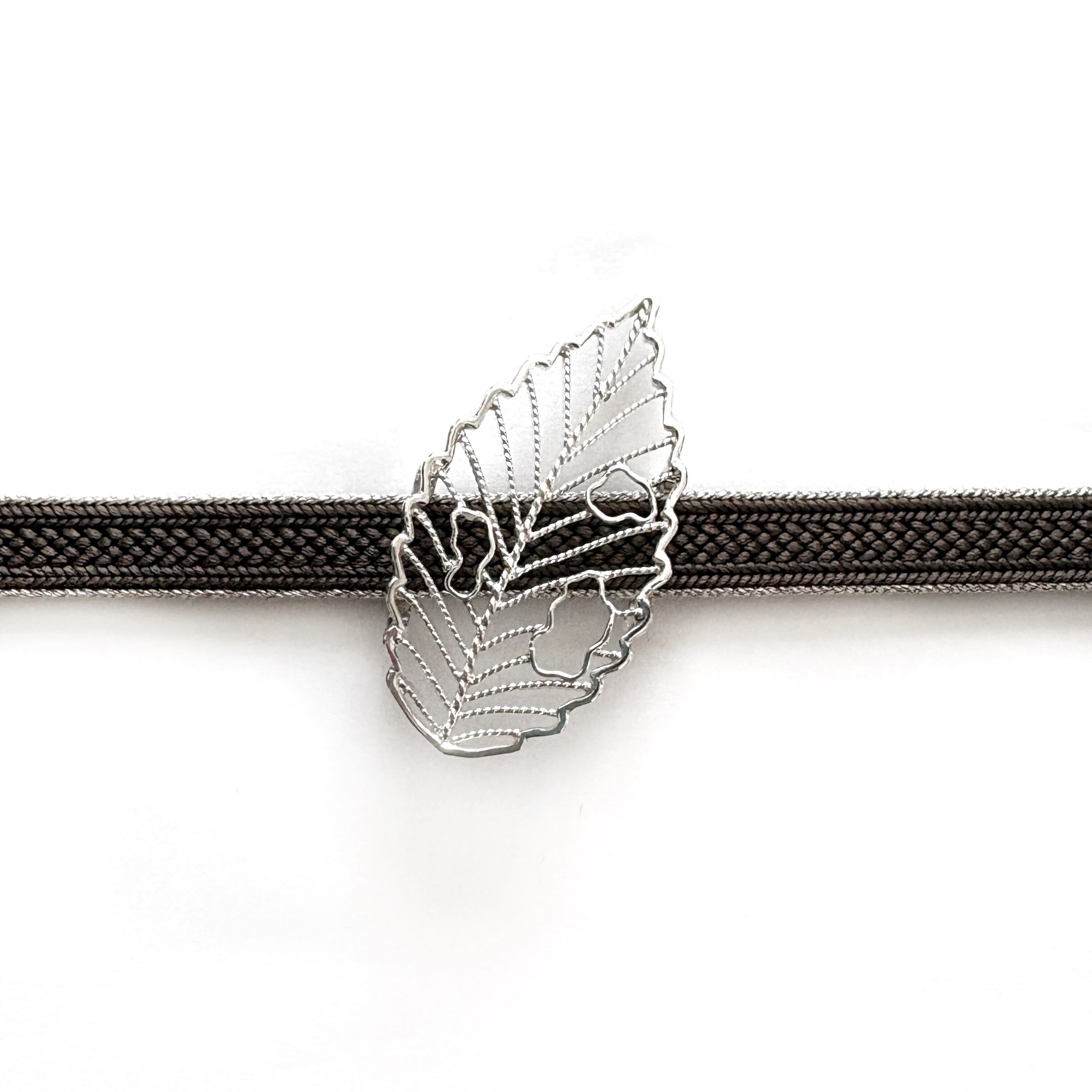 繊細な銀線細工の技法で作られた、ケヤキの葉をモチーフにした帯留。
