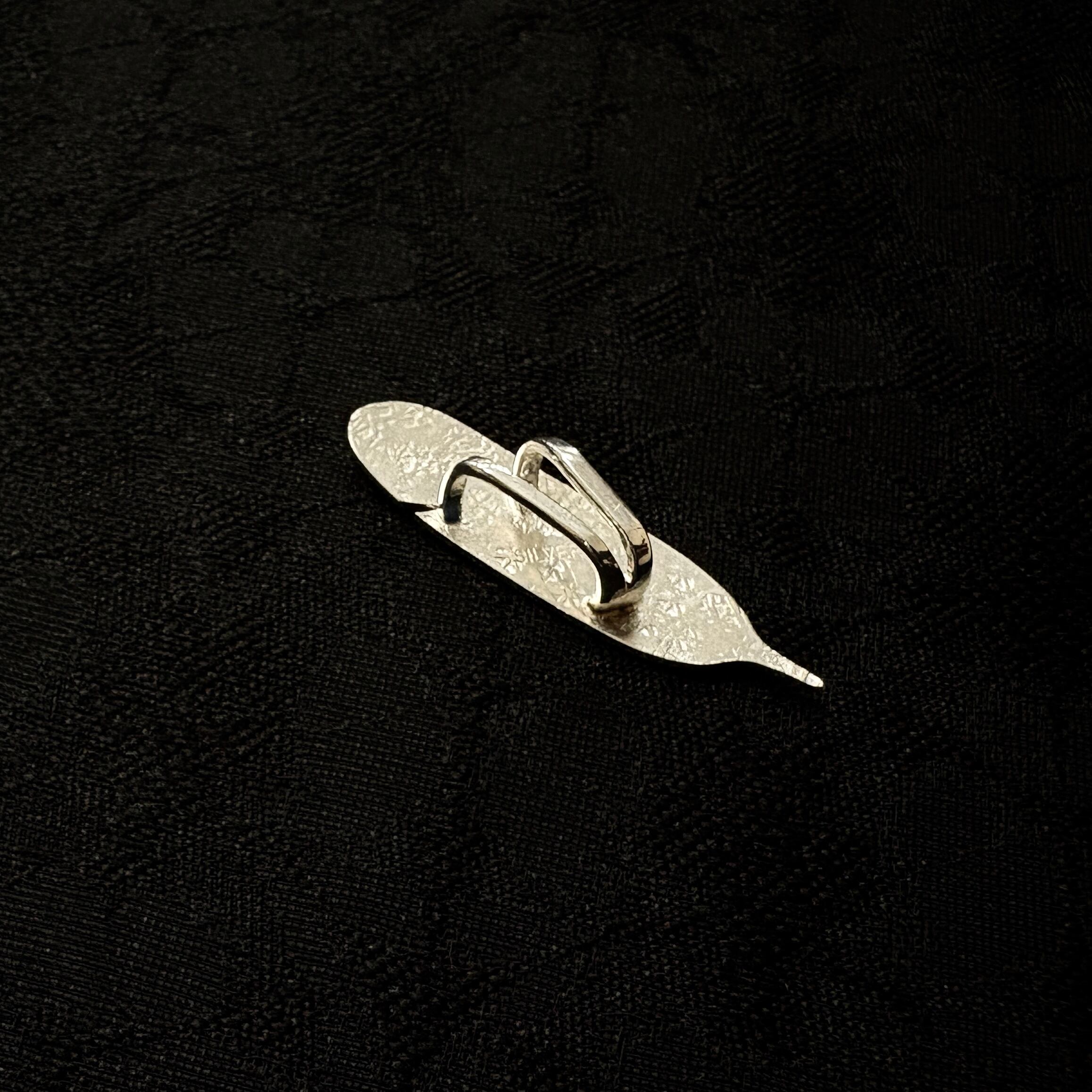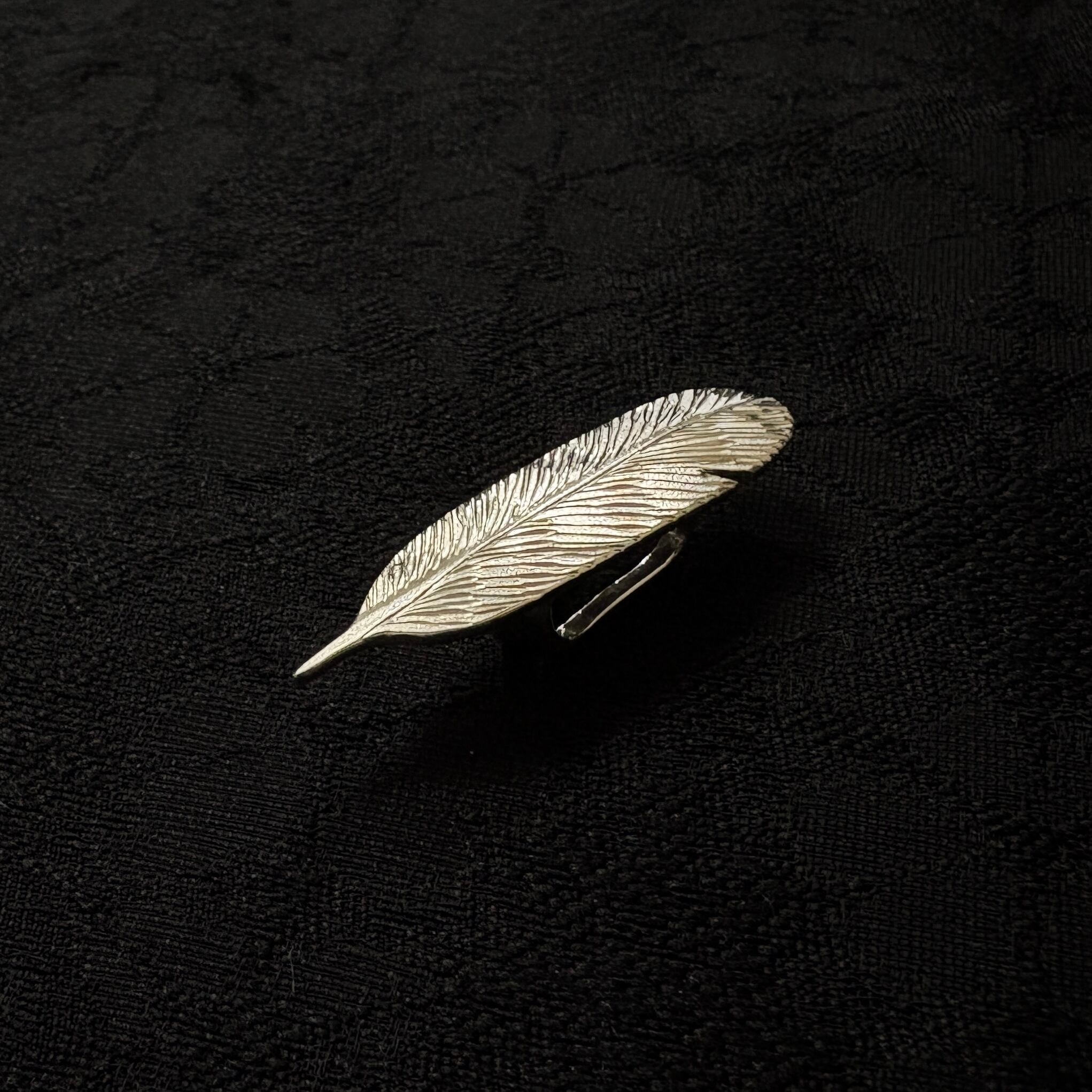 大きめの羽根に鏨で立体的に彫られた光を光を反射して輝き、シンプルながらも存在感と特別感のある帯留です。羽根の縞模様を彫りの変化で表現した、手の込んだ1点です。
