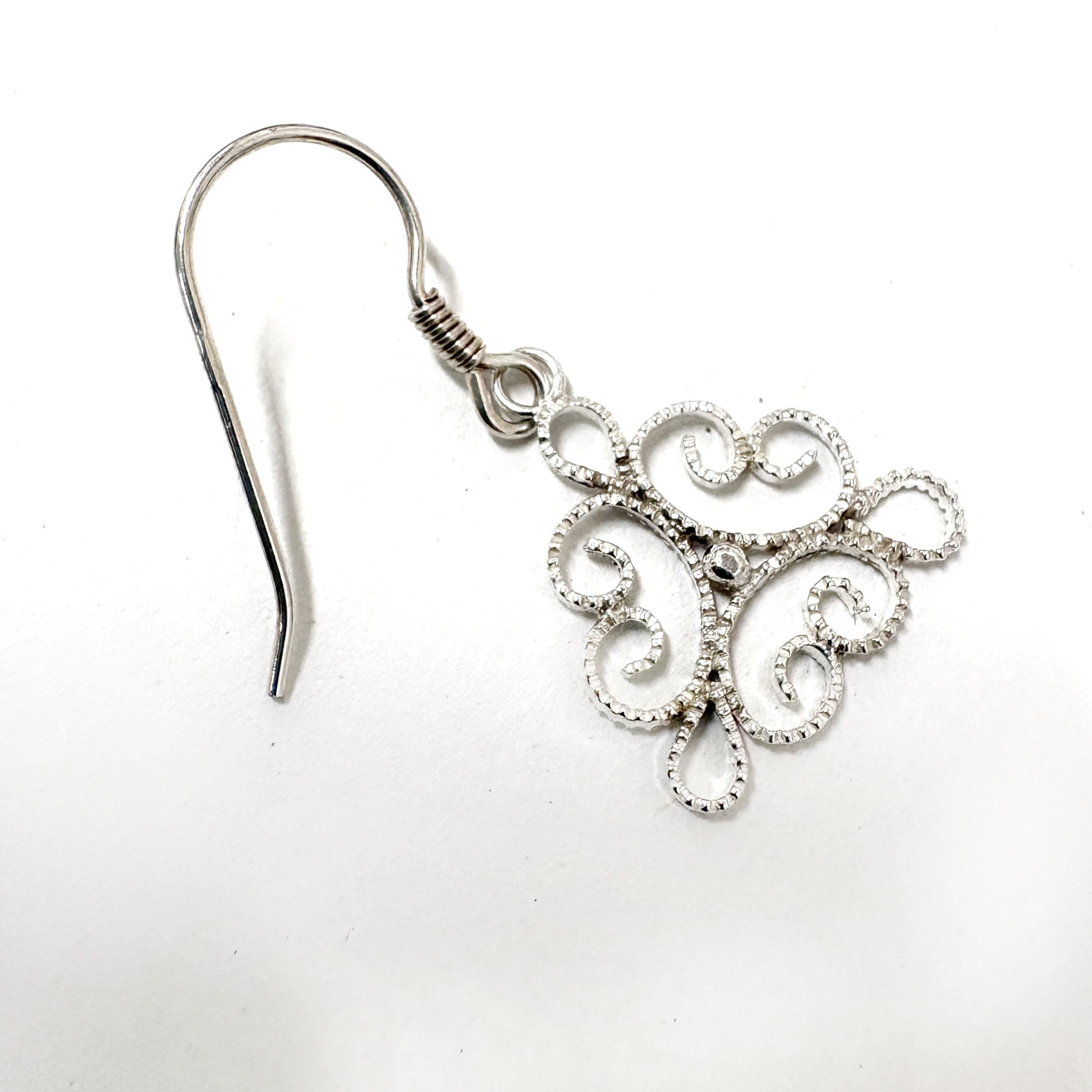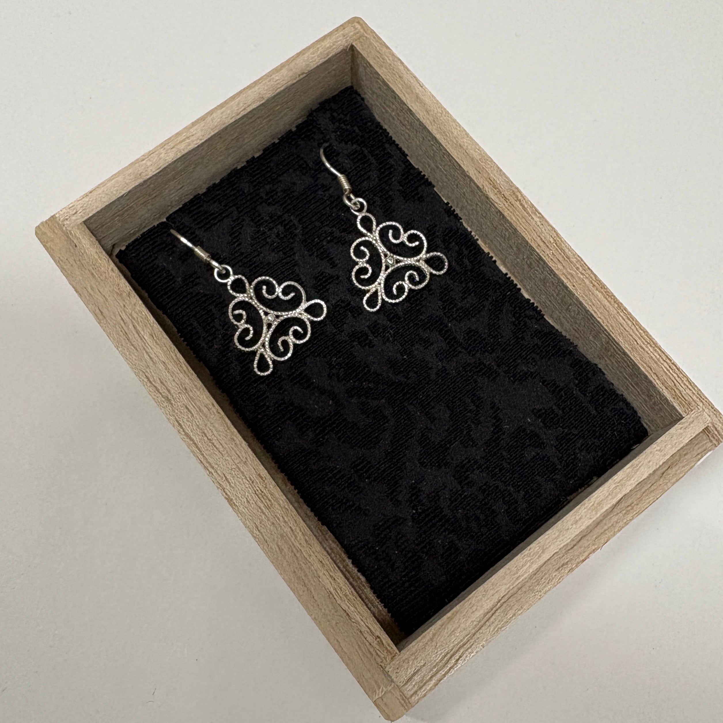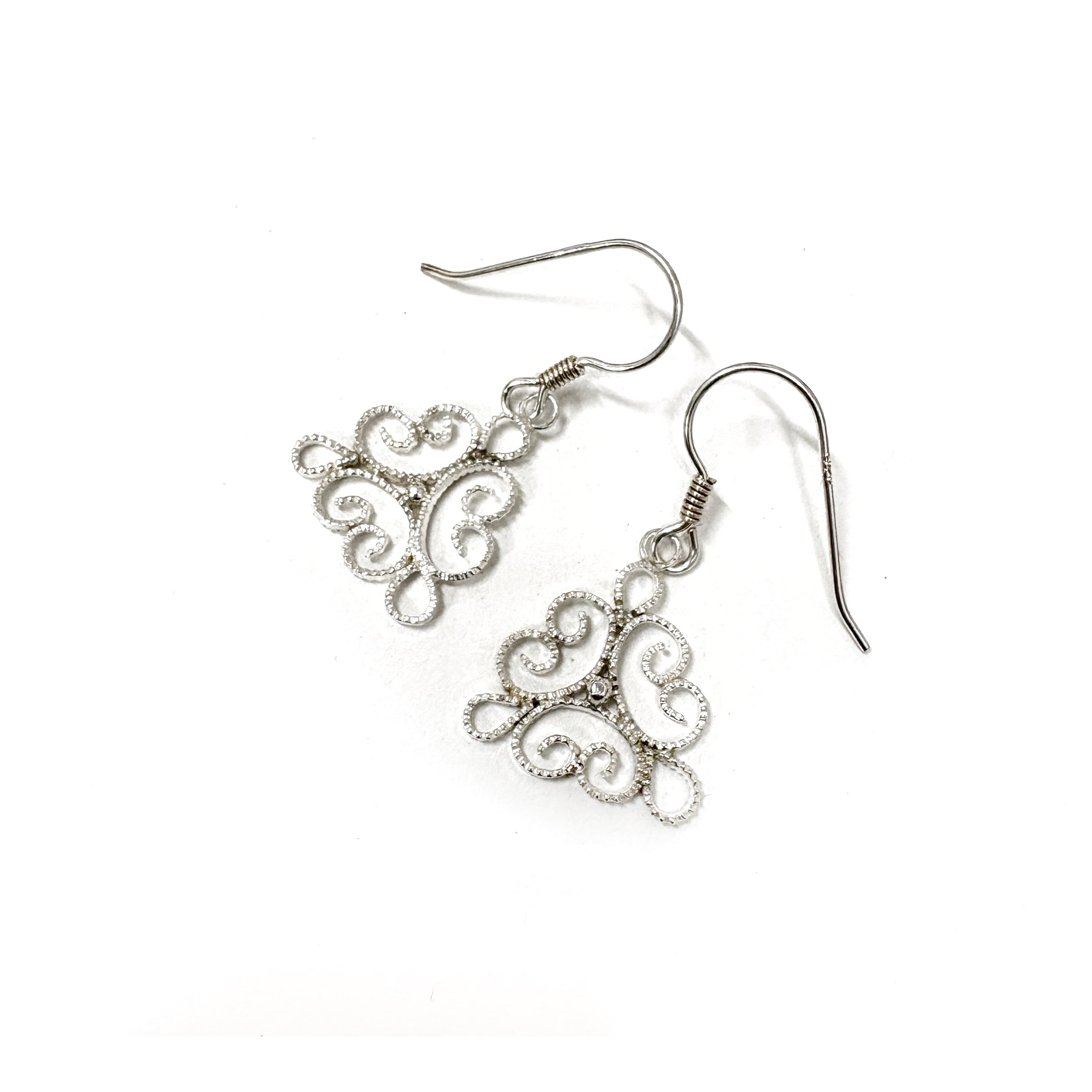 繊細な銀線細工の技法で作られた、church と題されたピアス。教会建築の装飾を思わせるような曲線のデザインが、凹凸をつけた極細の銀線で表現された、レースのように繊細で美しい作品です。唐草模様のような三角形のモチーフが個性的。