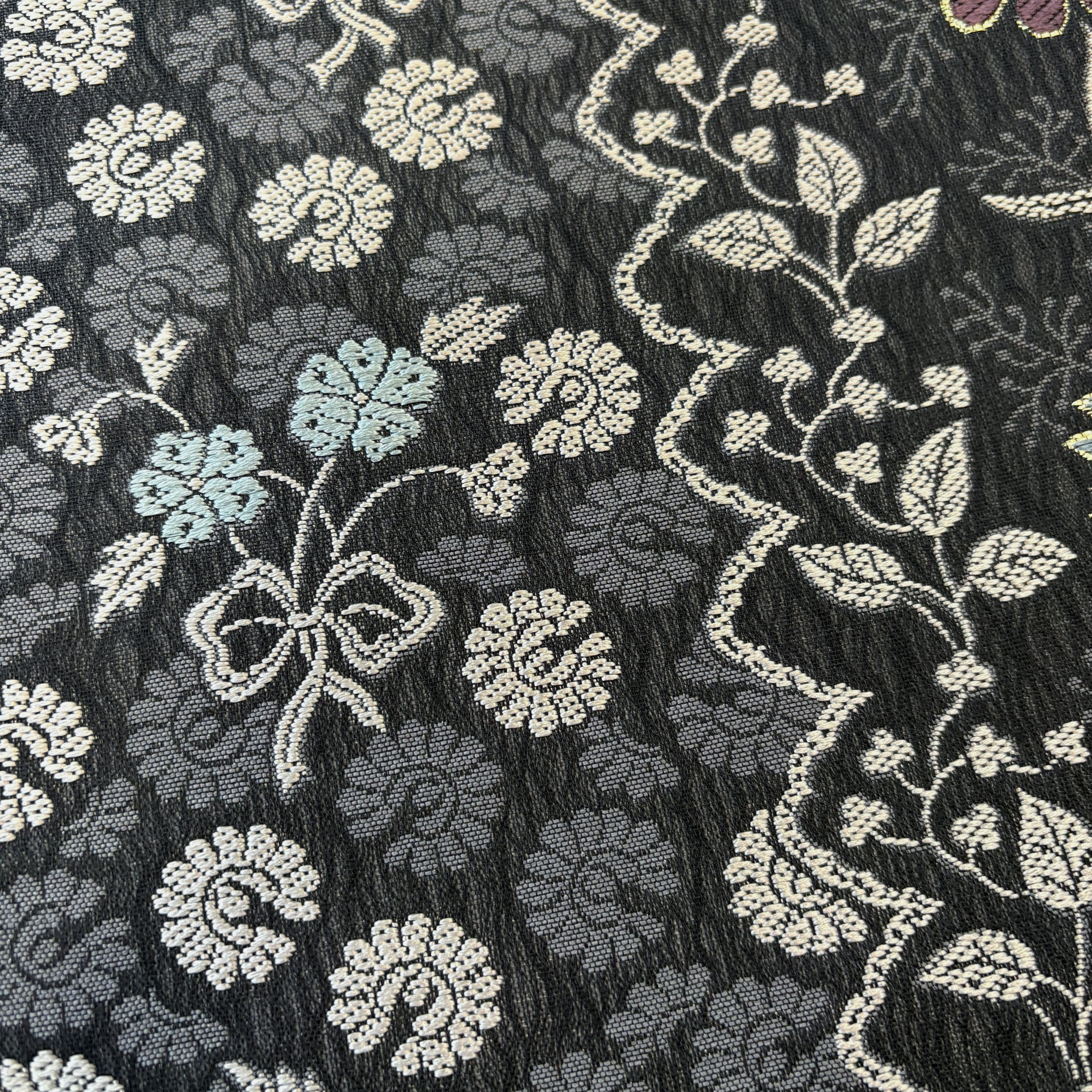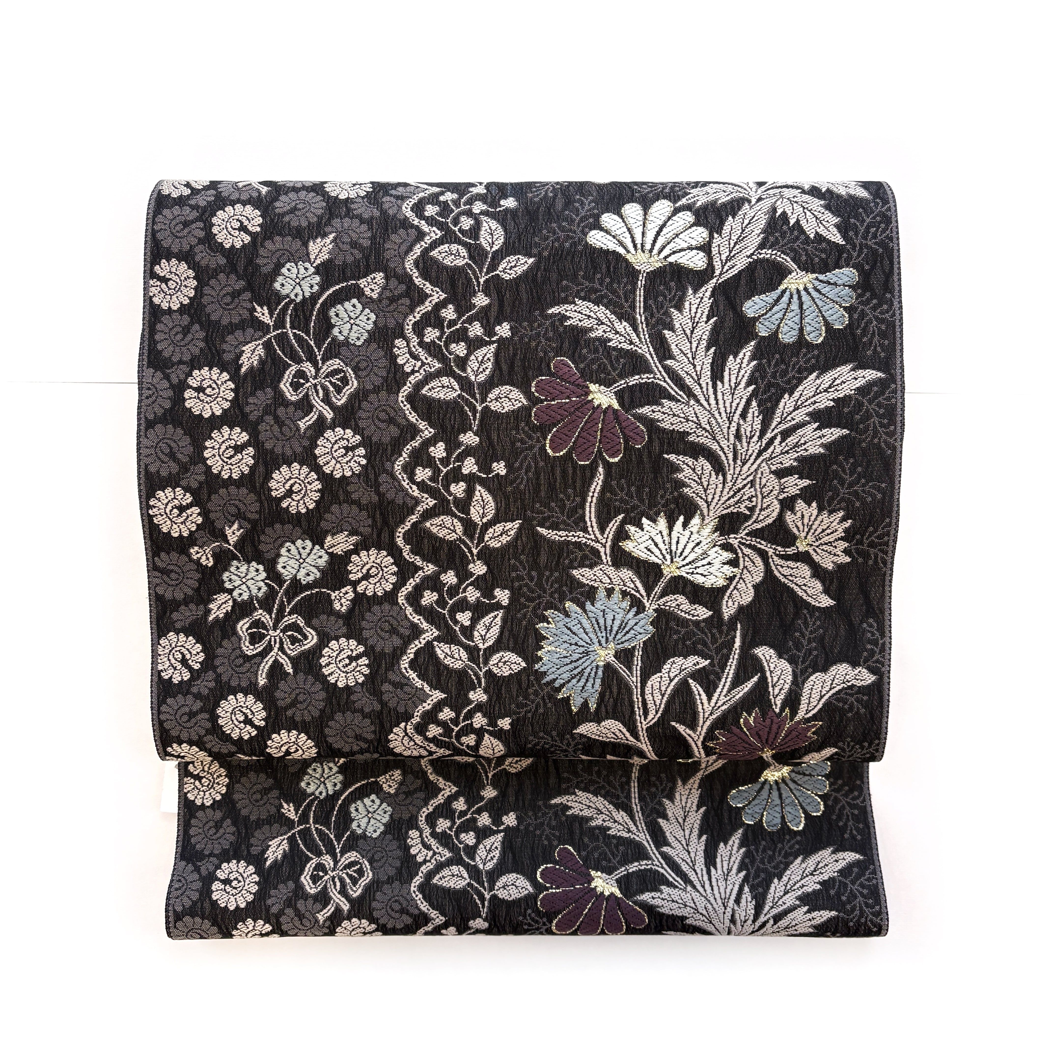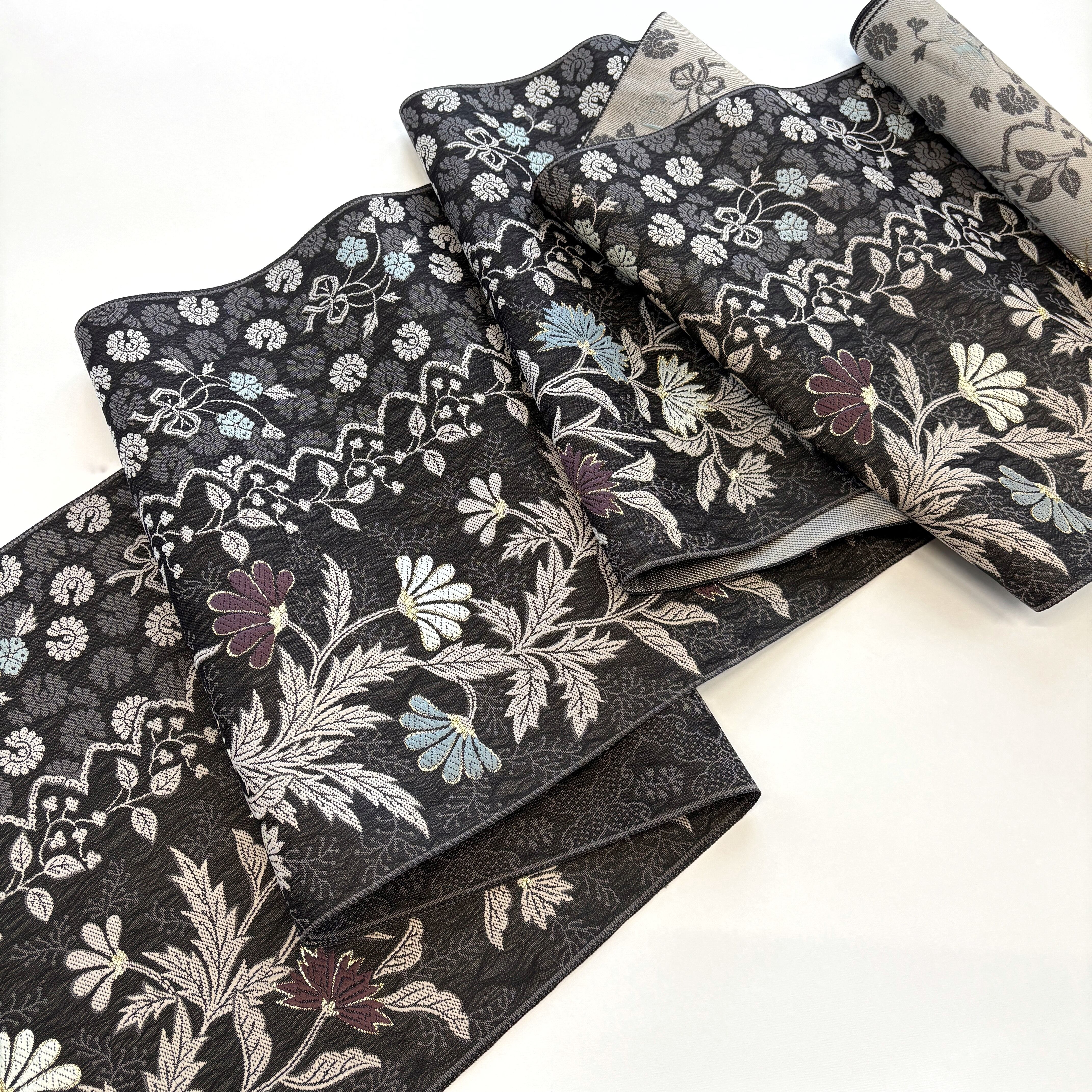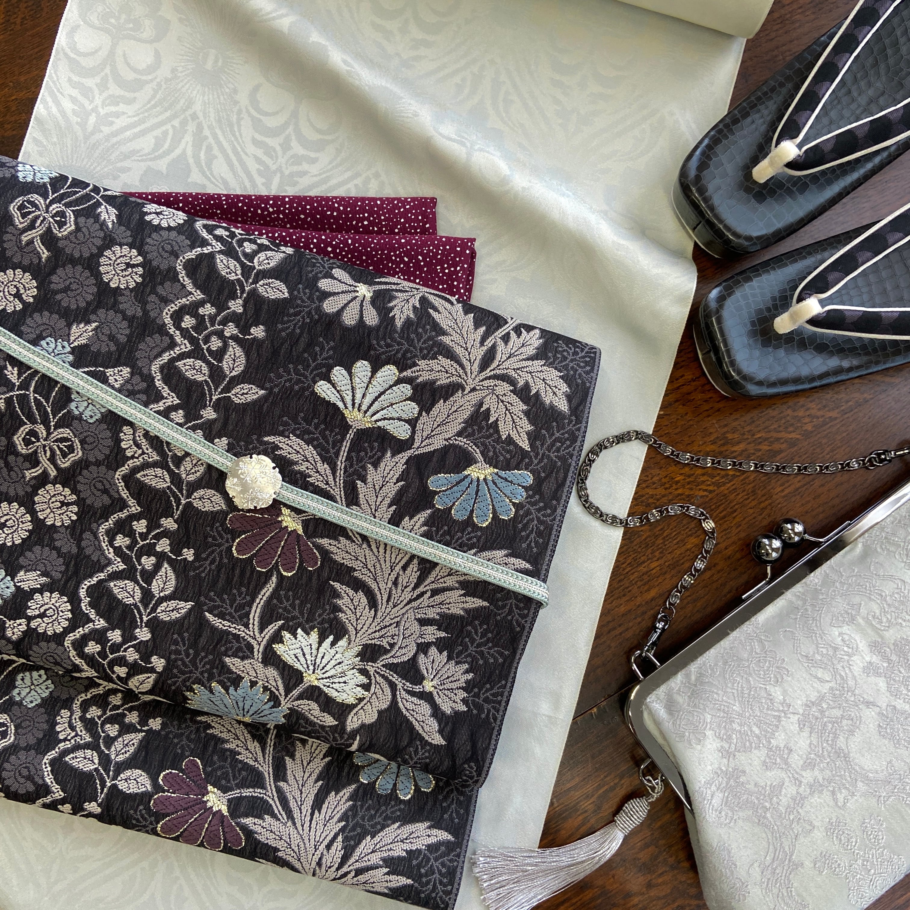 チャコールグレーの地にグレーを基調に、深みのあるワインレッドやくすんだブルー、わずかに金糸が使われたシックで甘すぎない配色で、黒地の帯ですがきつい感じにならない印象。動きのある大きめの花柄とレースのような小花柄が縦に半々に配されています。
