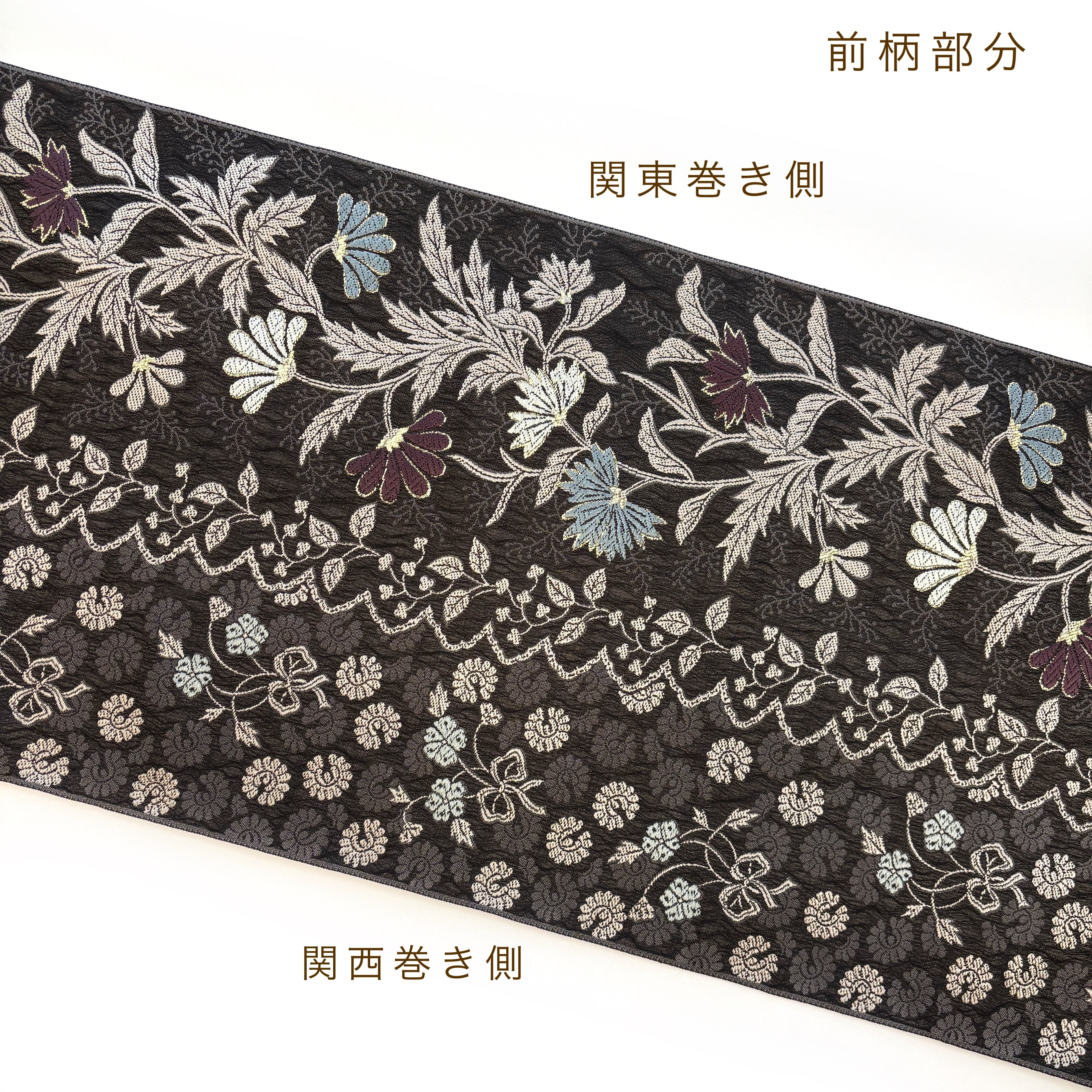 関東巻ではワインレッドとブルーの花柄、関西巻きではグレーがメインで小さなブーケと小花。巻き方を逆にすると印象の違う着こなしが楽しめます。