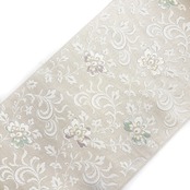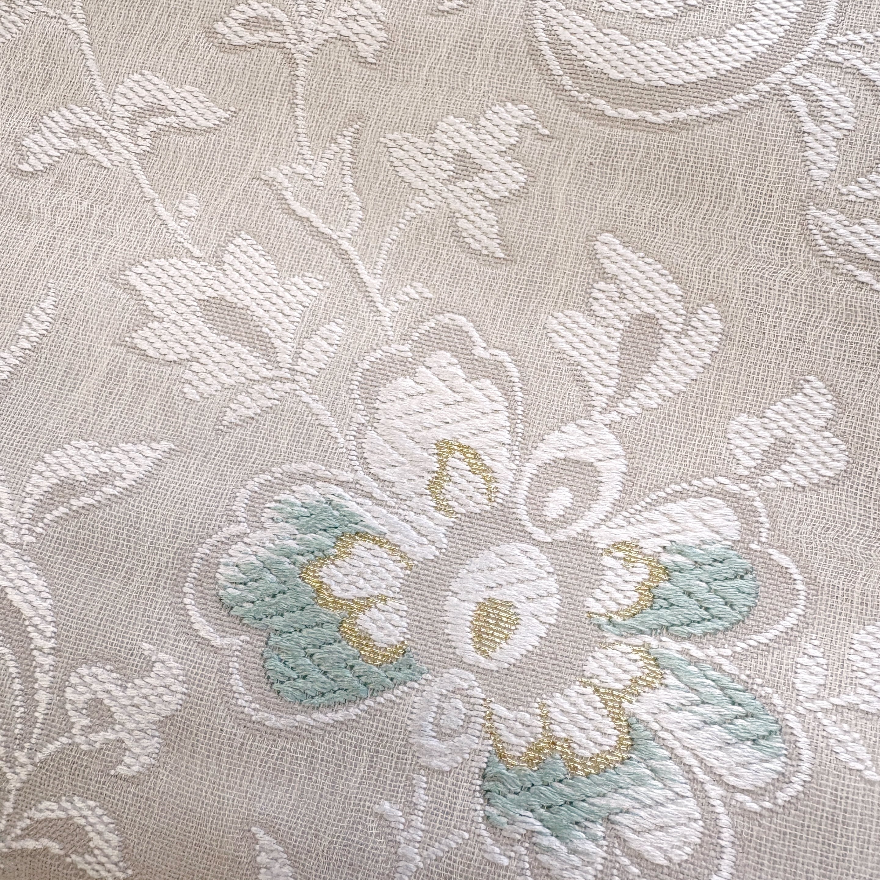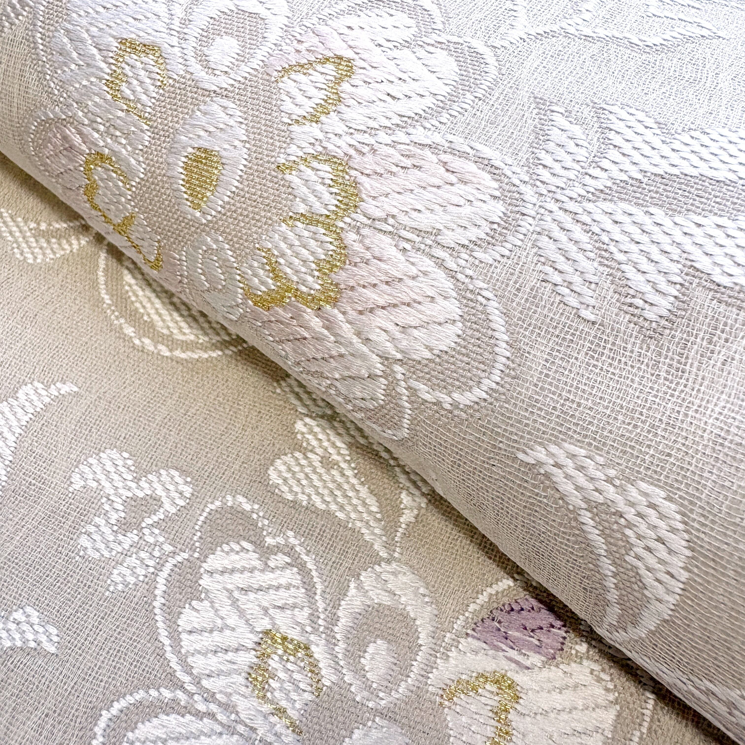 ごくごく淡いベージュの地にオフホワイトを基調として、淡いグリーンやピンクやラベンダーわずかに金糸が使われた淡く上品な配色で、優しくじょうひんな印象。全体に動きのある花唐草模様が連続しているデザインです。
