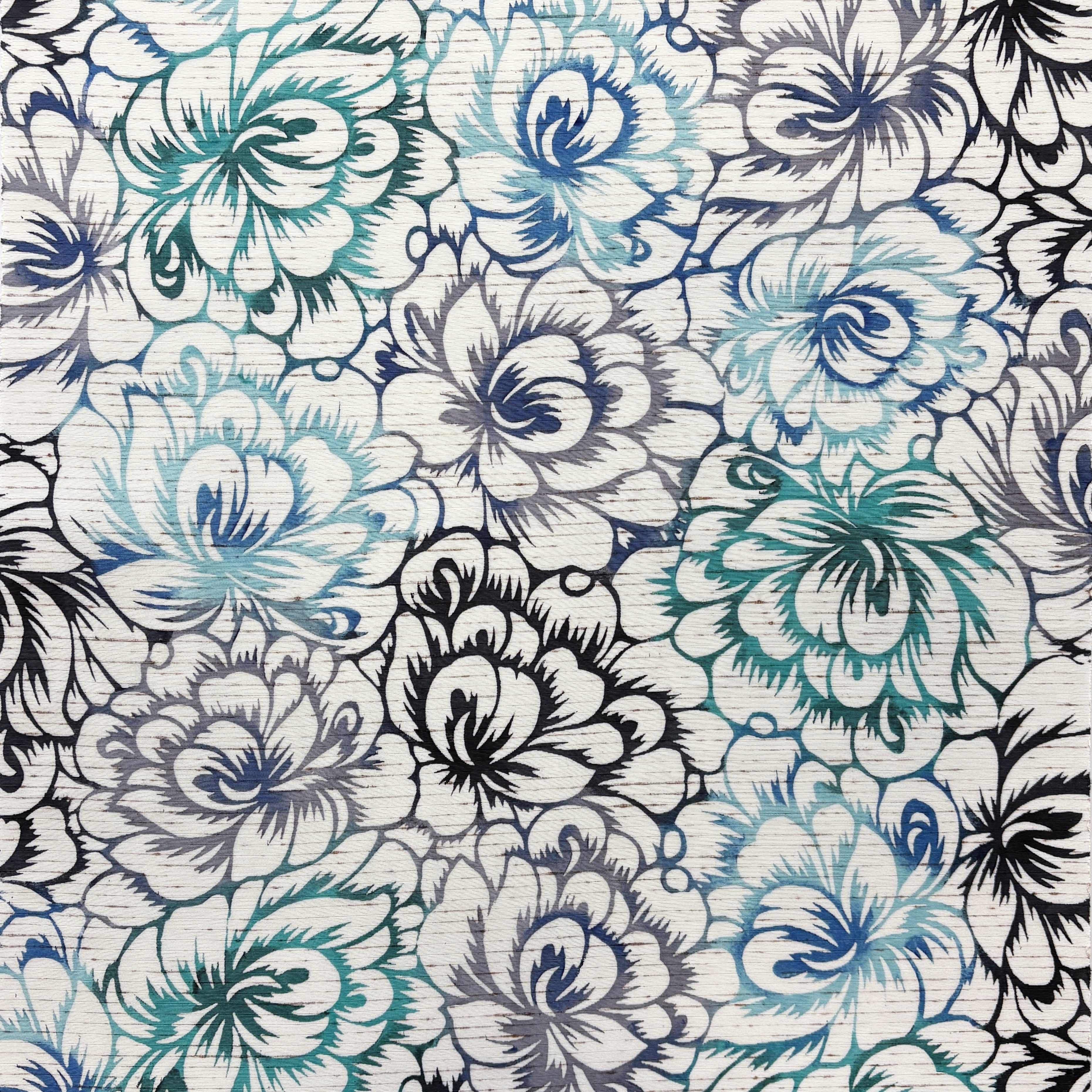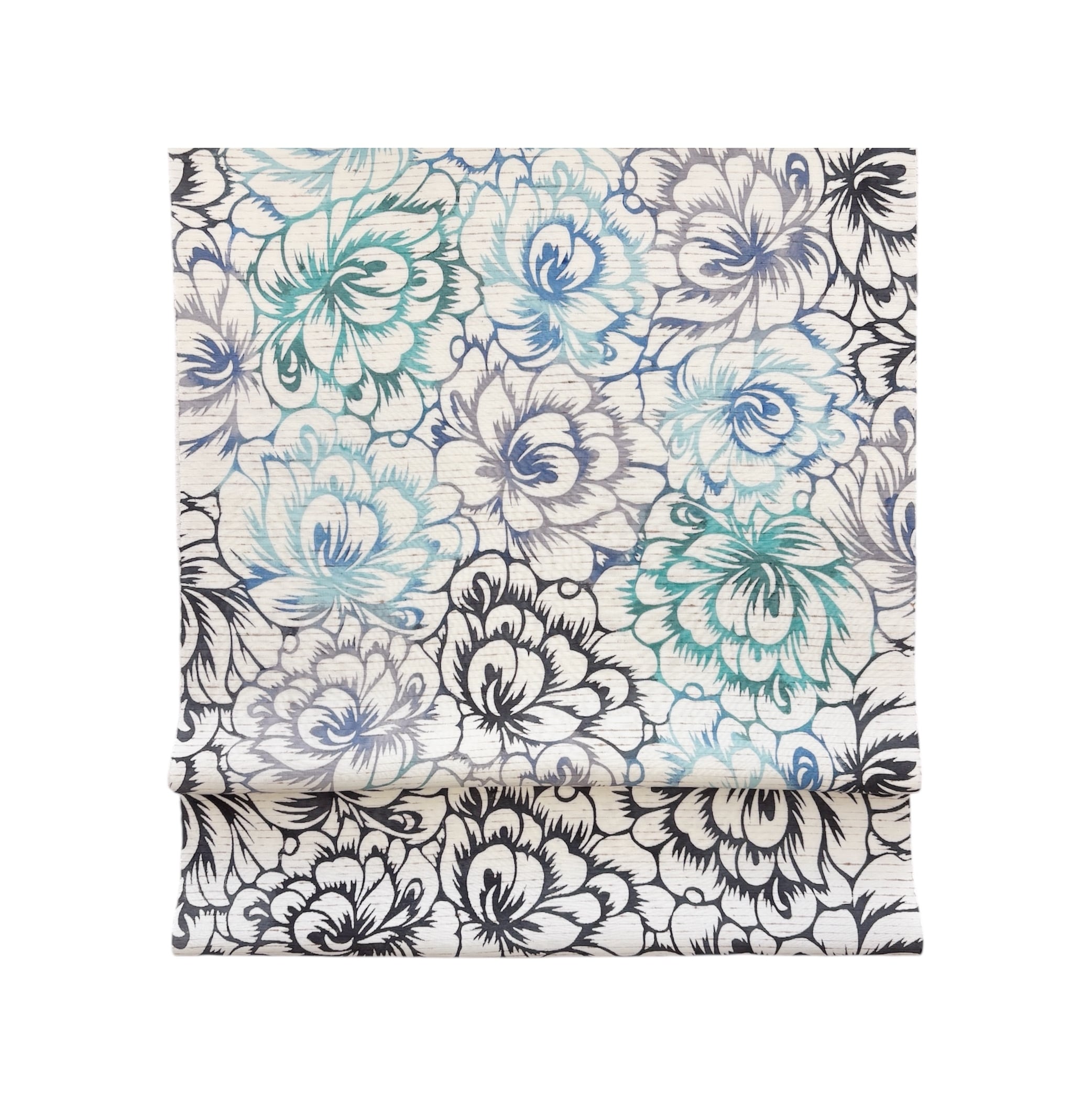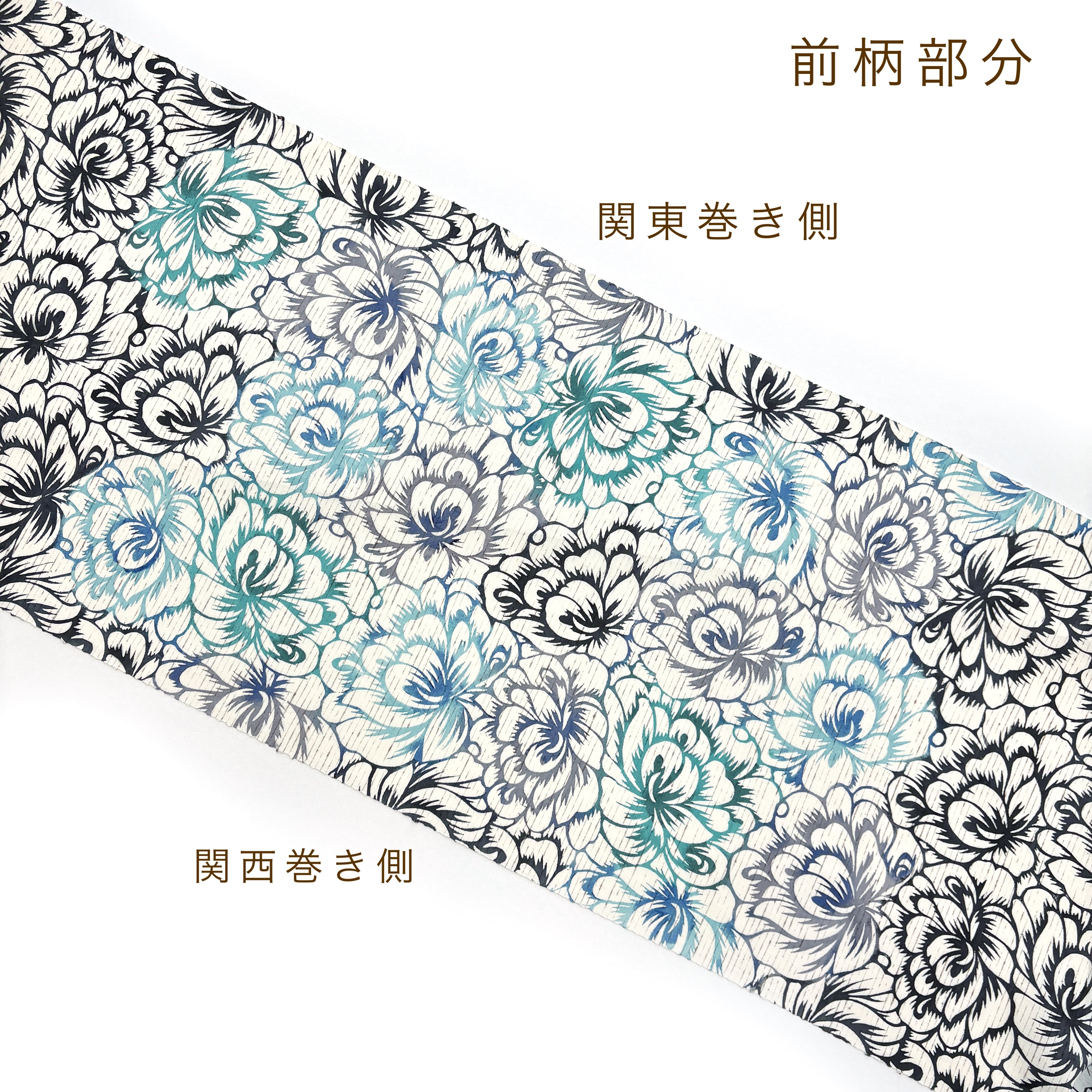 全体にスミクロで繰り返し柄が染められた中に、お太鼓部分と前柄部分にのみブルーとミントグリーン系の色が差してあります。型染めの手仕事ならではの味わいを楽しめると同時に、モノトーンにブルー系のすっきりした配色が都会的ですっきりとスタイリッシュな印象の、とてもおしゃれ感のバランスがよい帯です。