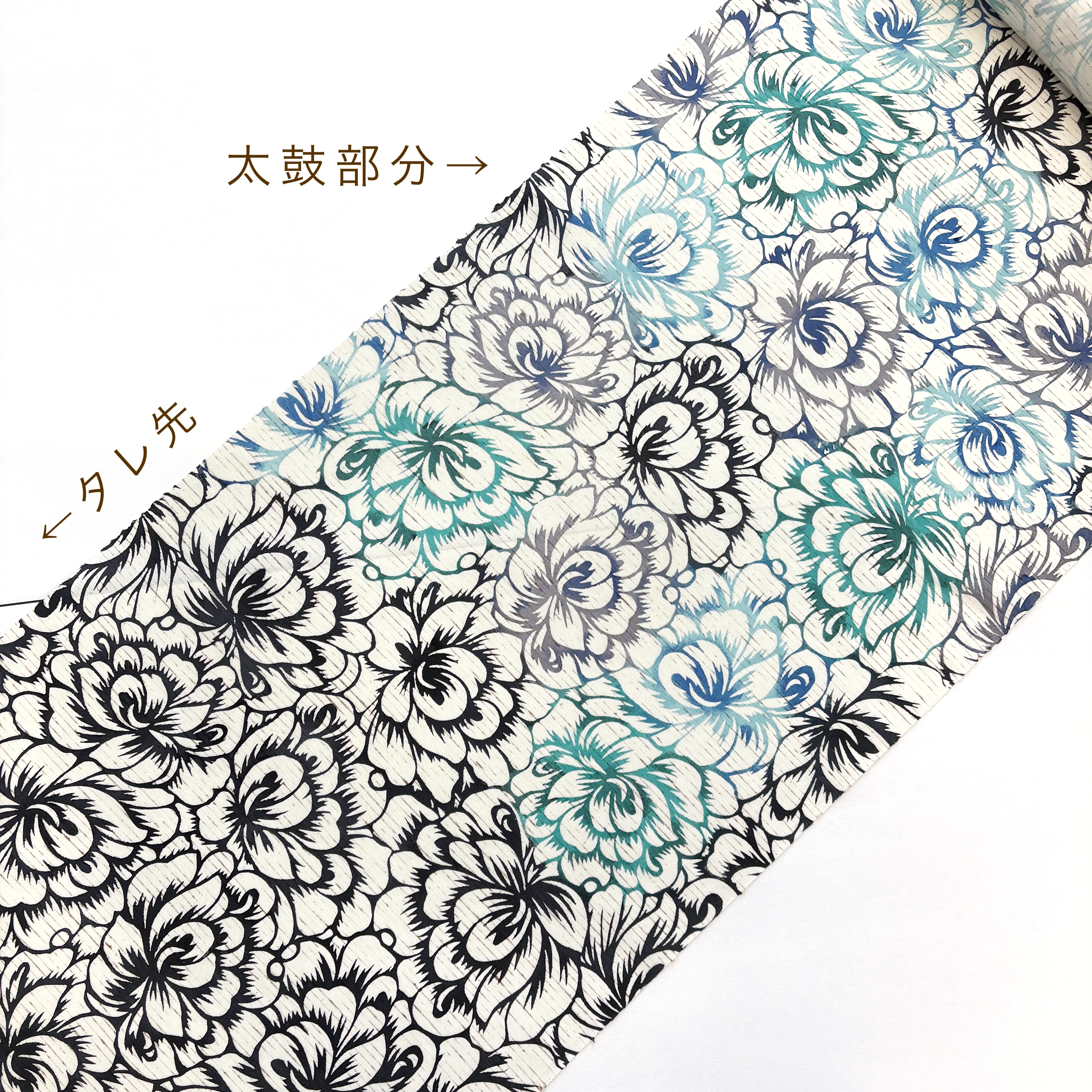 六通で、お太鼓部分・前柄も同じ柄の連続です。色が入っているのは太鼓・前柄部分のみですが、どちらもワンポイントではなく広めの範囲で色がついているため柄出しに苦労せずに締めていただけます。タレ先はモノトーンになります。