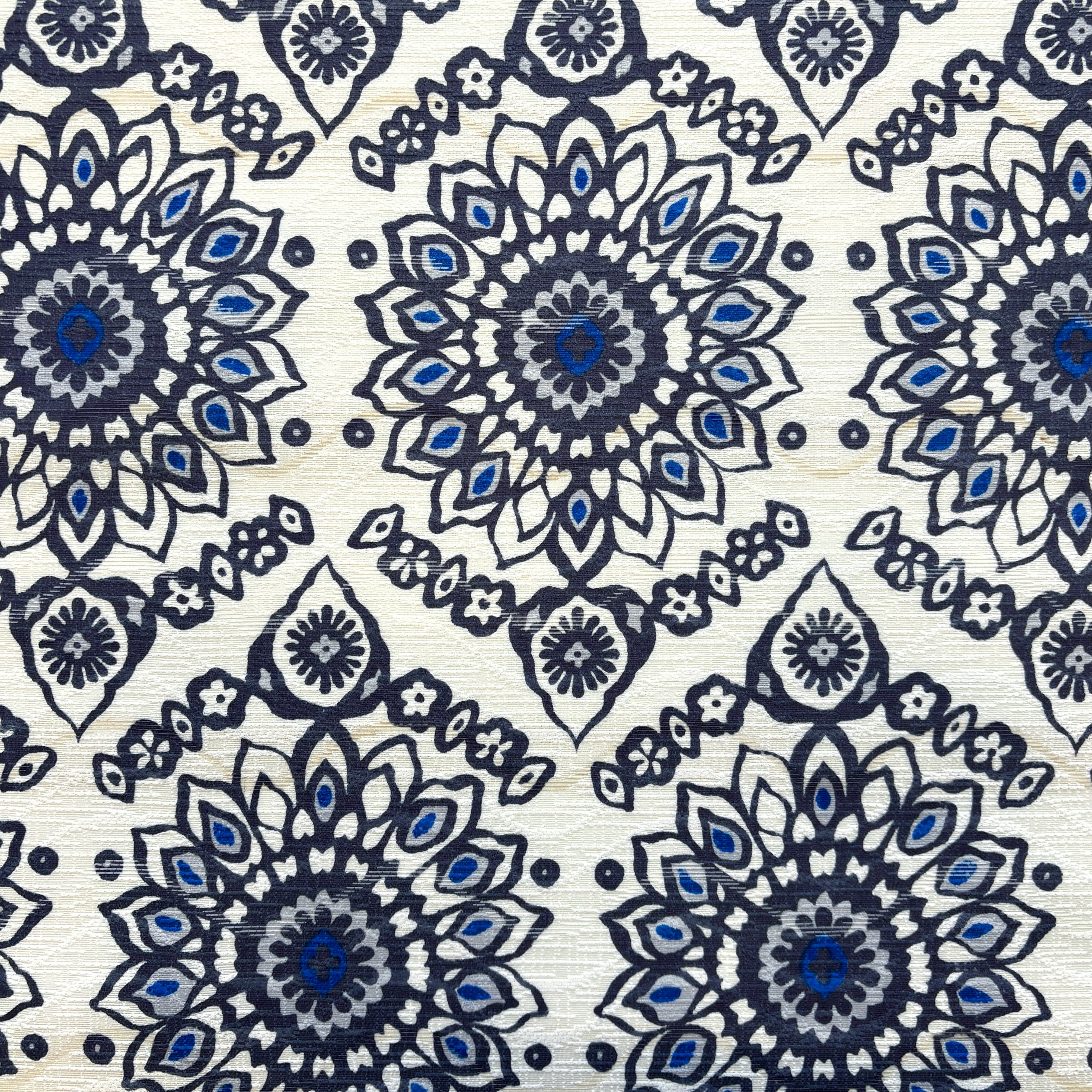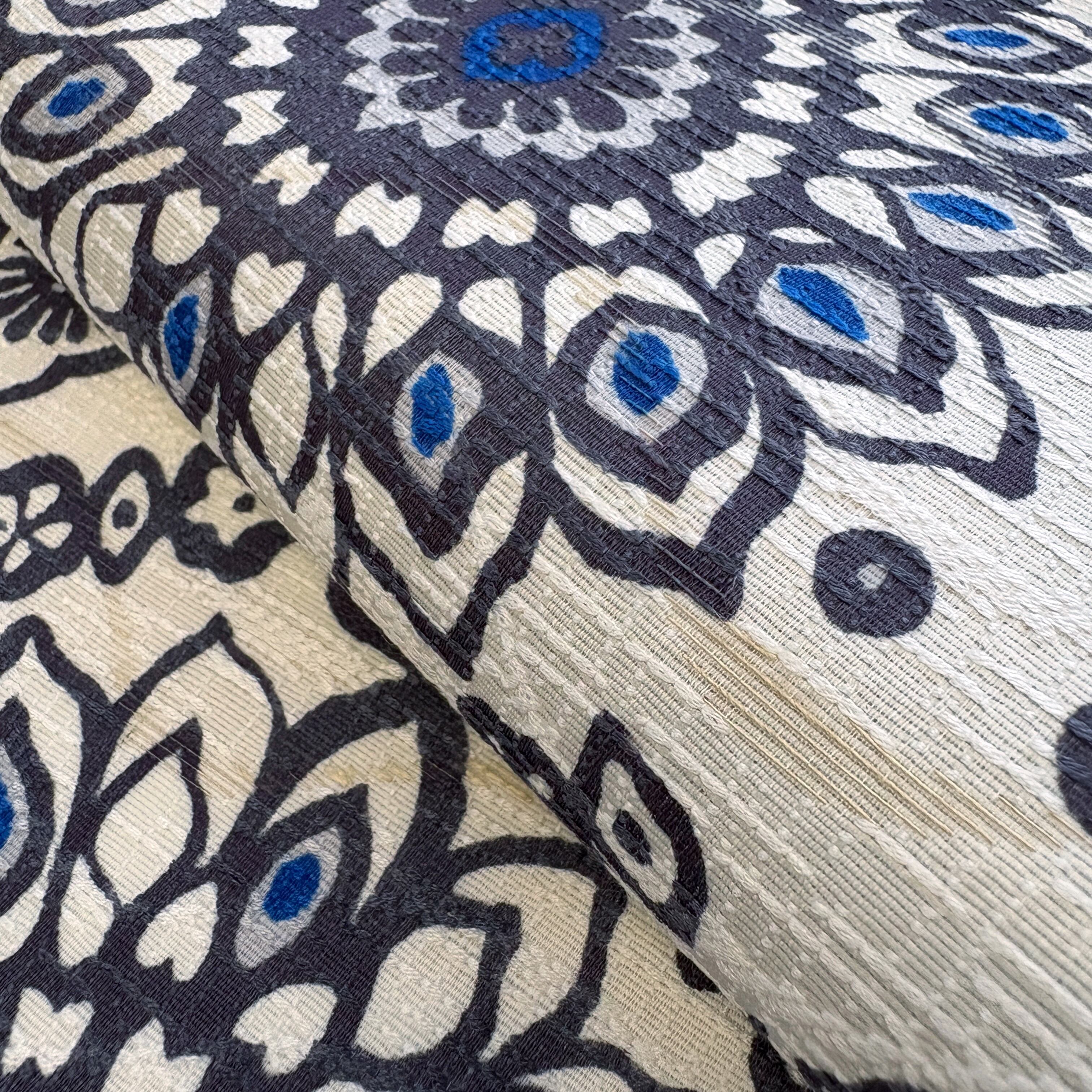 独特のざっくりとした風合いの白地に、スミクロとブルーで丸い柄が連続するデザイン。エキゾチックで個性的な印象ですが、モノトーンにブルーのモダンな配色が都会的です。