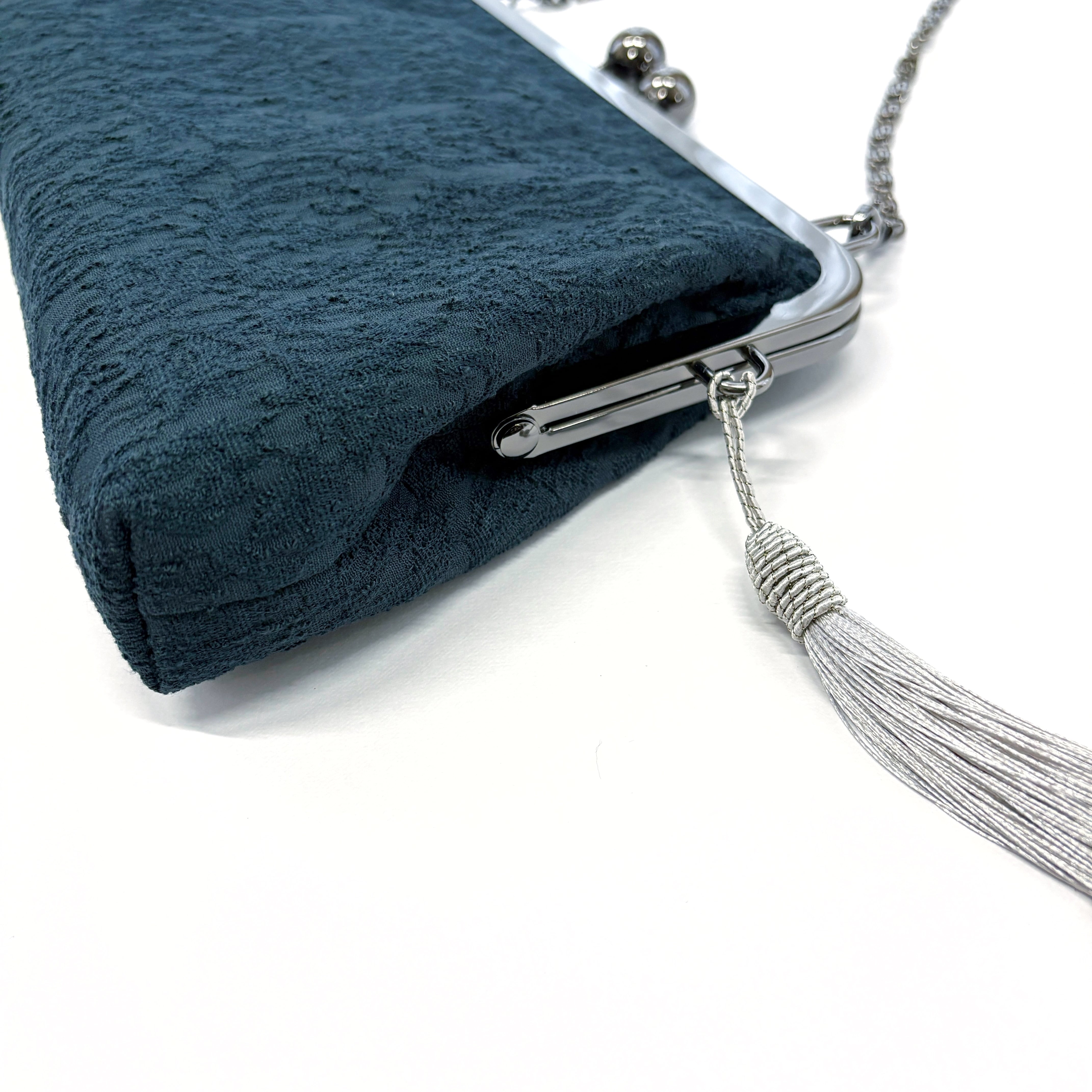 深みのある緑がかったダックブルーのダマスク調の柄が織り出された生地を使用し、上品でおしゃれな印象。ブラックの金具との組み合わせが、クラシックながらクールなイメージです。