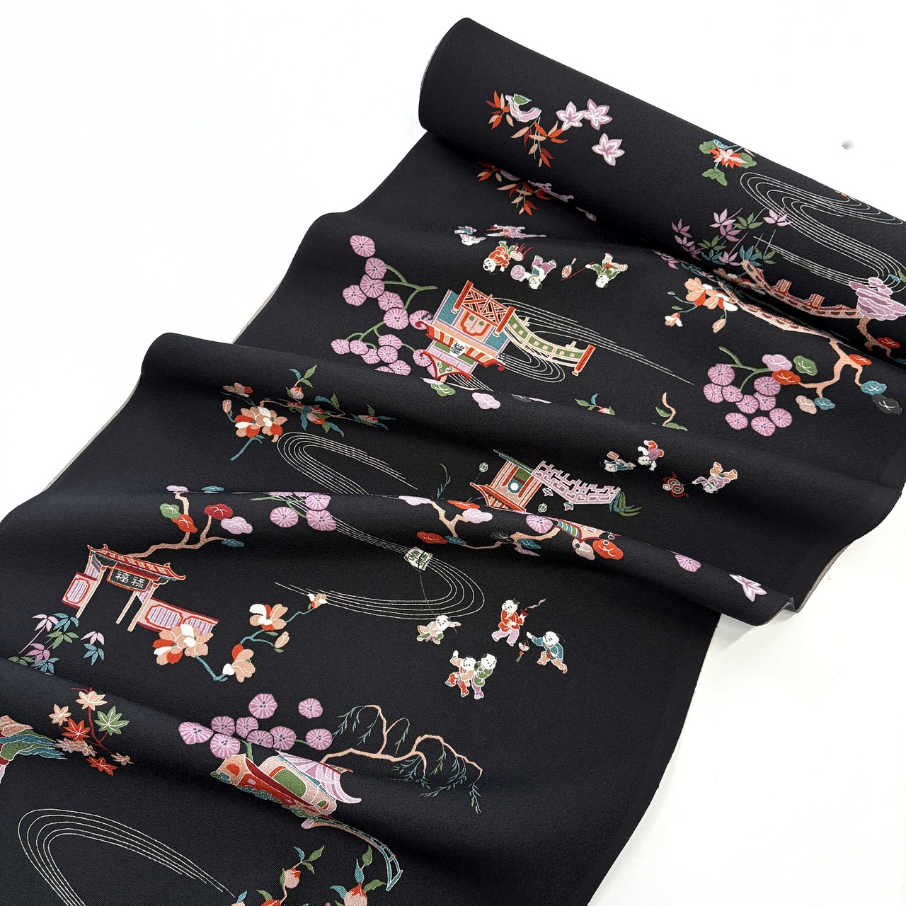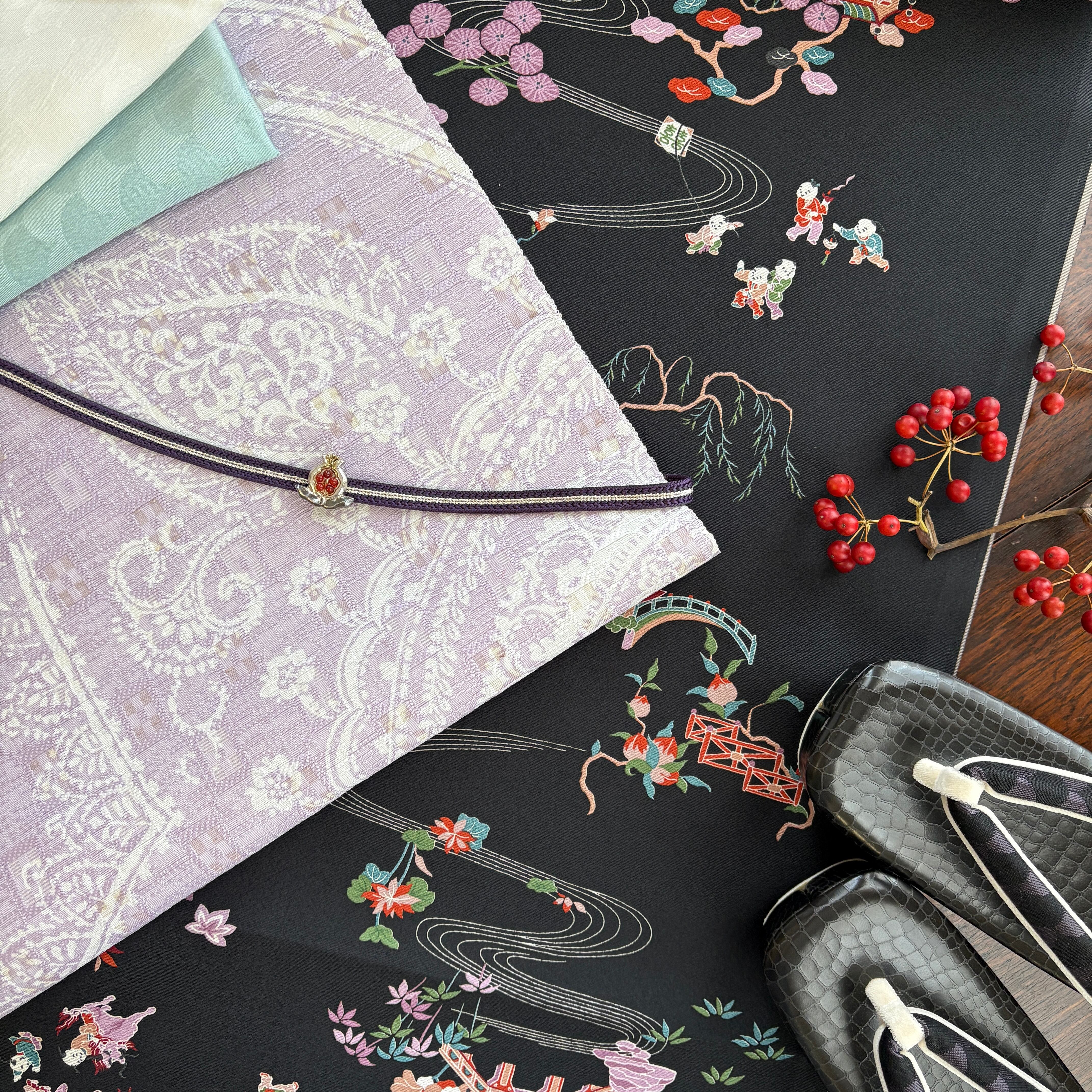 昔の中国のお目出度い風景をイメージして描かれた「古都」。楽しそうに遊び回る唐子たちが、糸目友禅調に描かれた華やかな柄です。黒地に多色使いの総柄小紋は、色柄を身にまとう着物ならではの楽しみを味わえそう。しっとりと落ち感のある生地で、高級感があります。