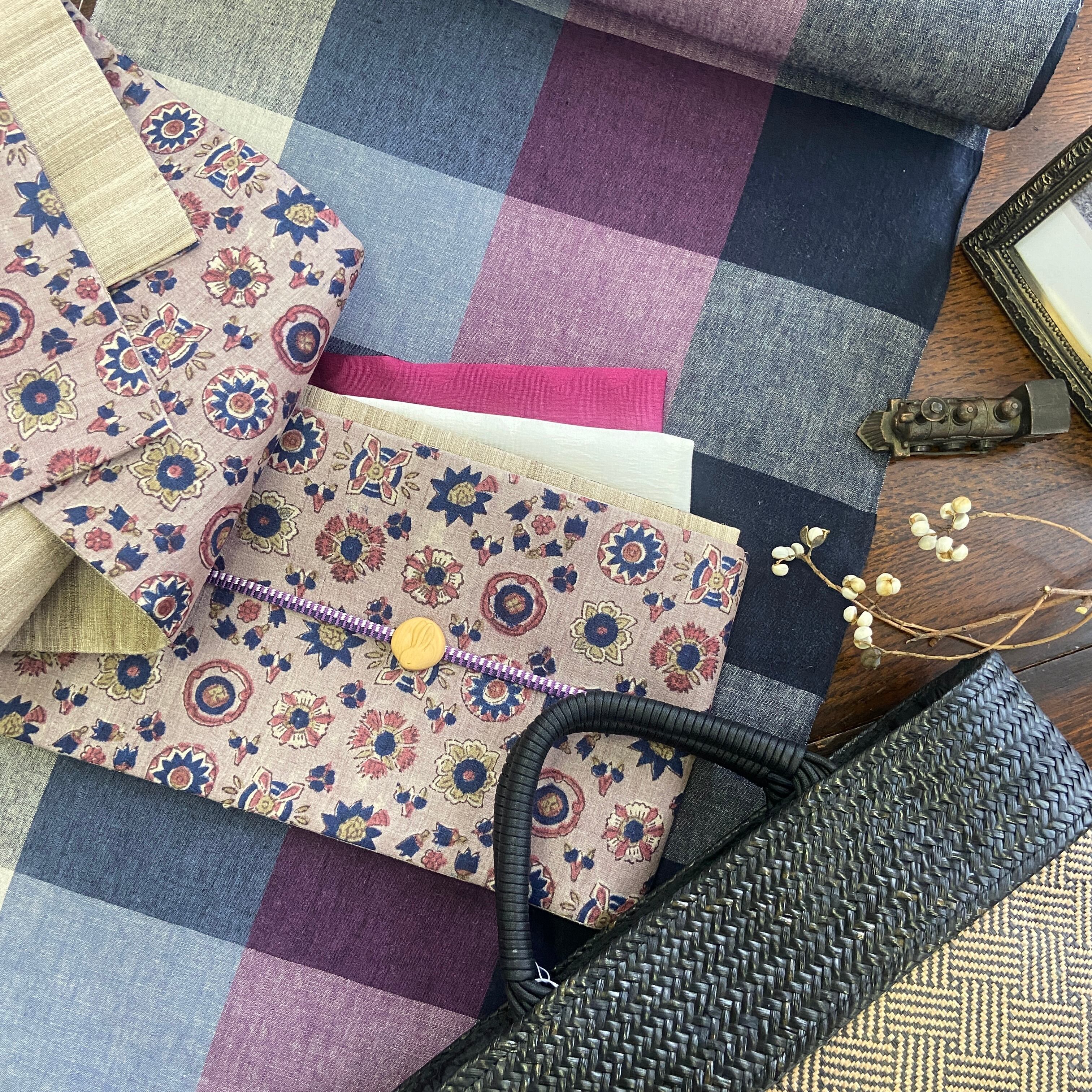 濃紺と紫を基調としたブロックチェック。伊勢木綿で人気のカジュアル感ある可愛い柄を、落ち着いたシックな配色で。