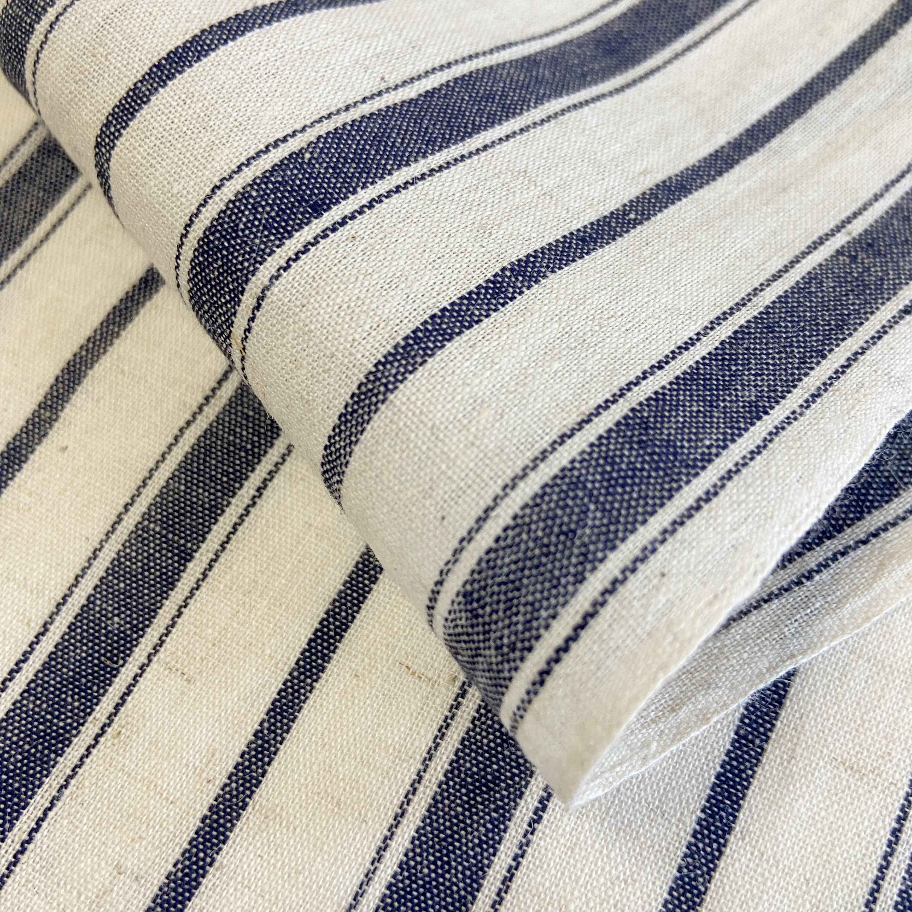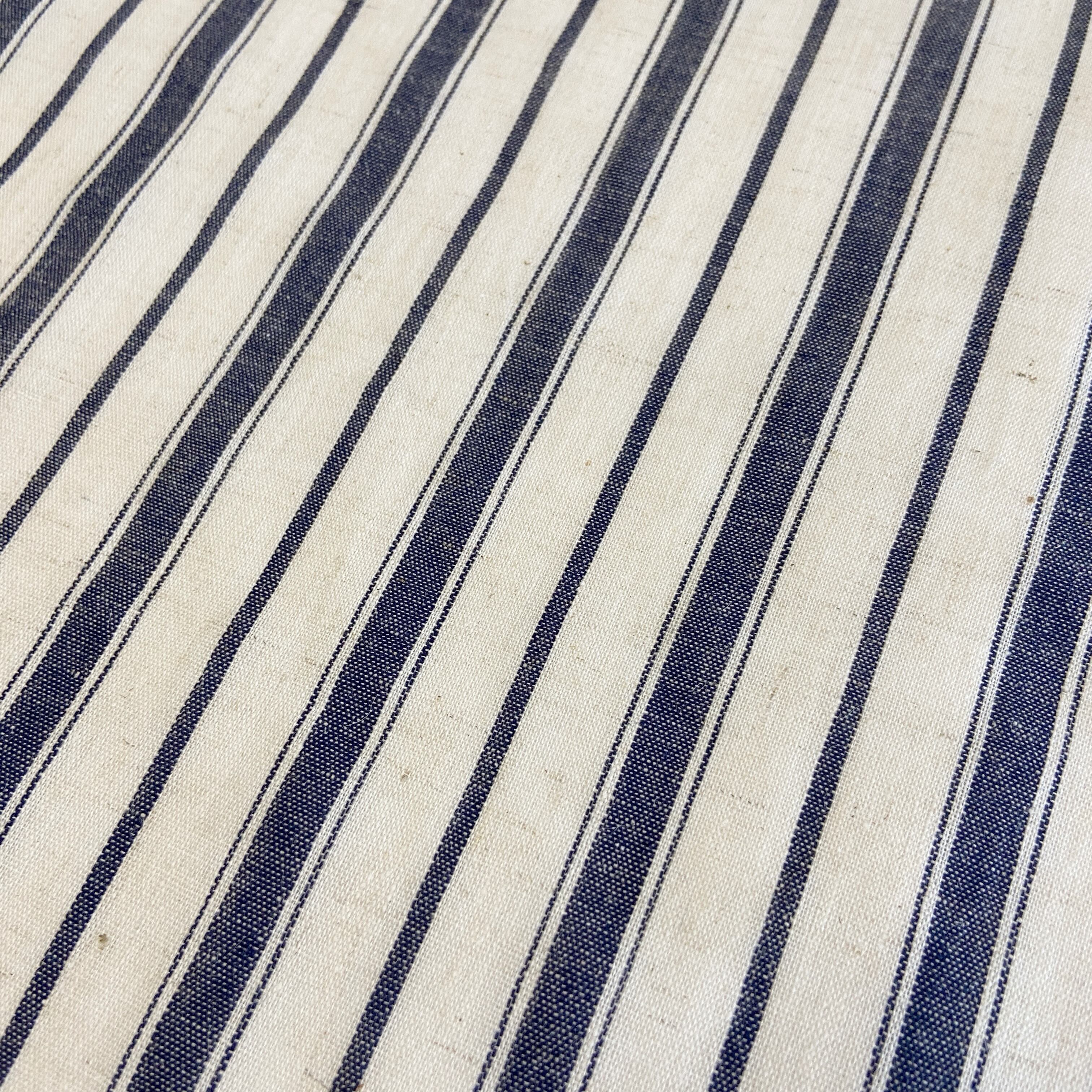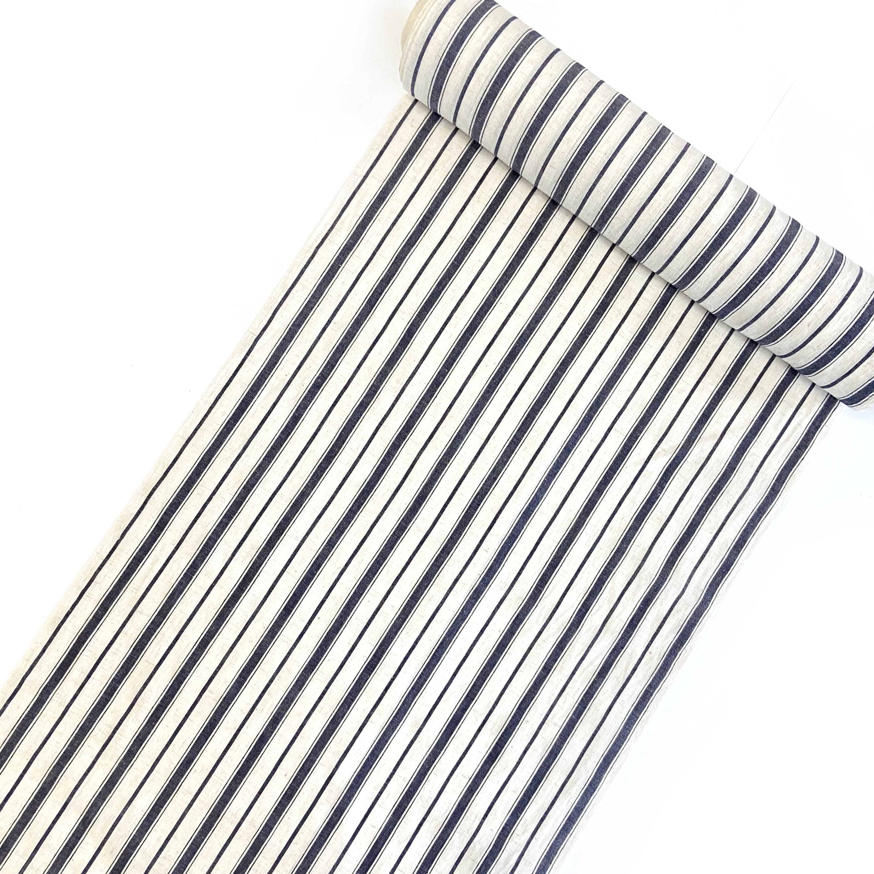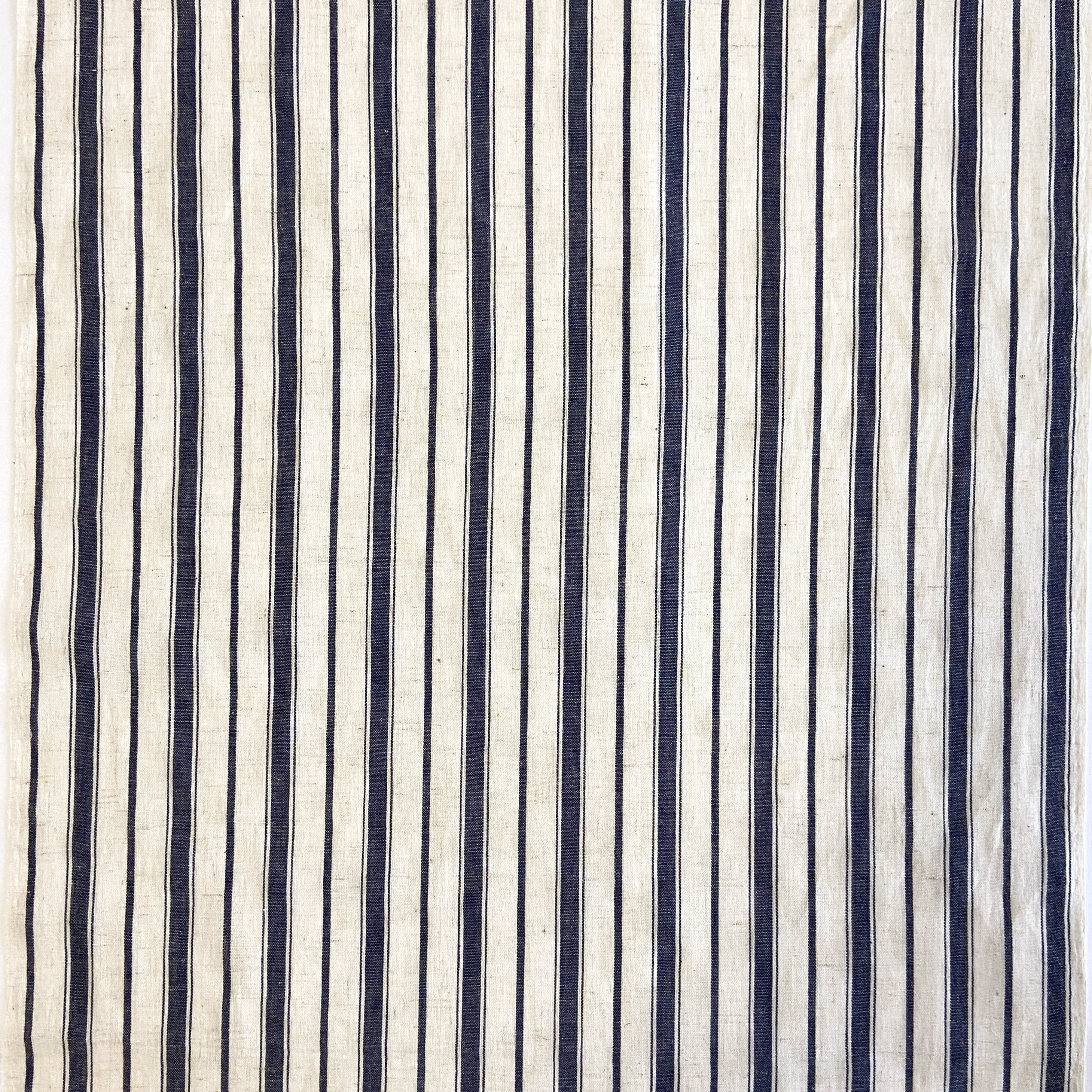 生成と黒のシンプルな縞。クールな印象になりがちなモノトーンの縞ですが、麻の風合い・生成の素材感と相まって、ナチュラルなストライプのワンピースのような印象です。