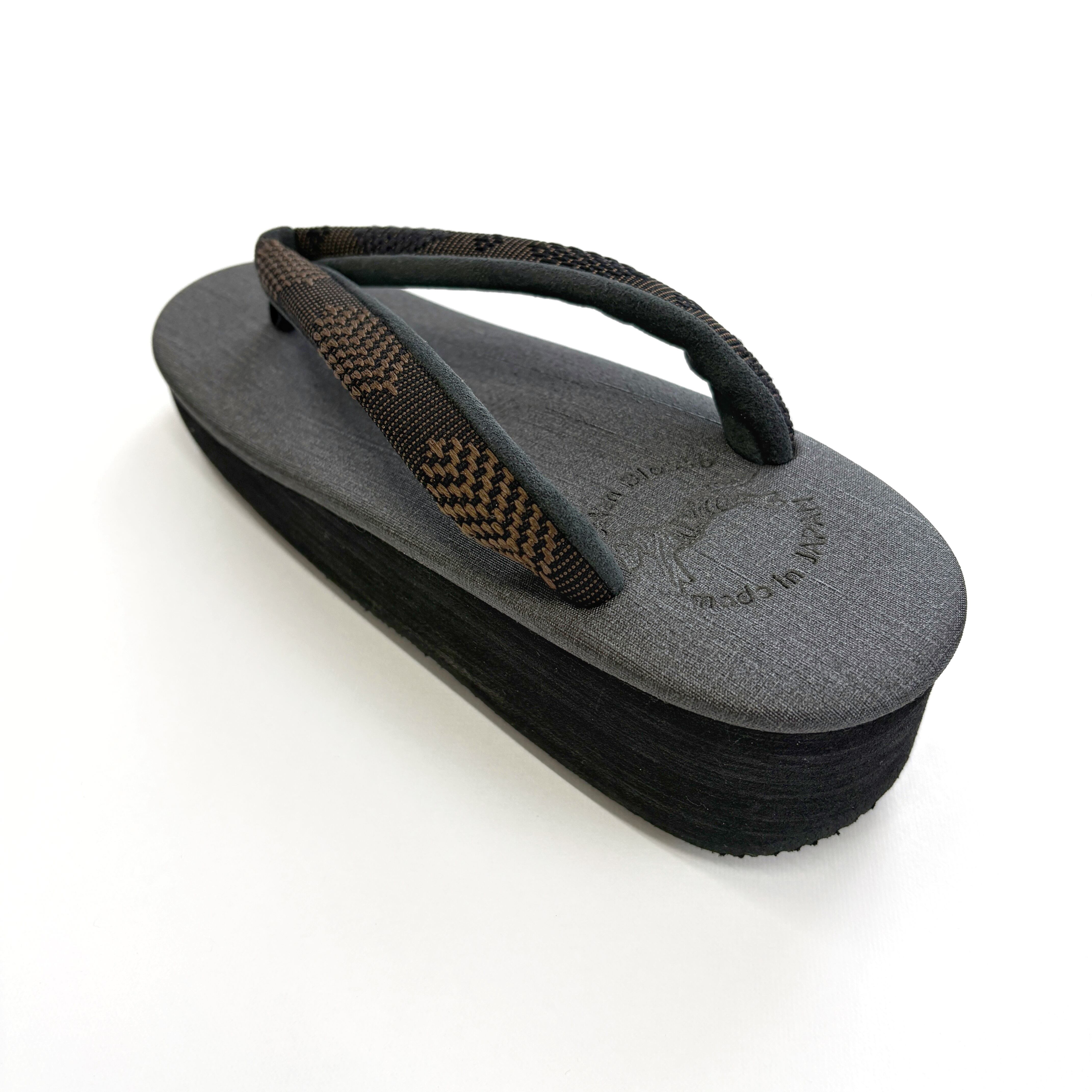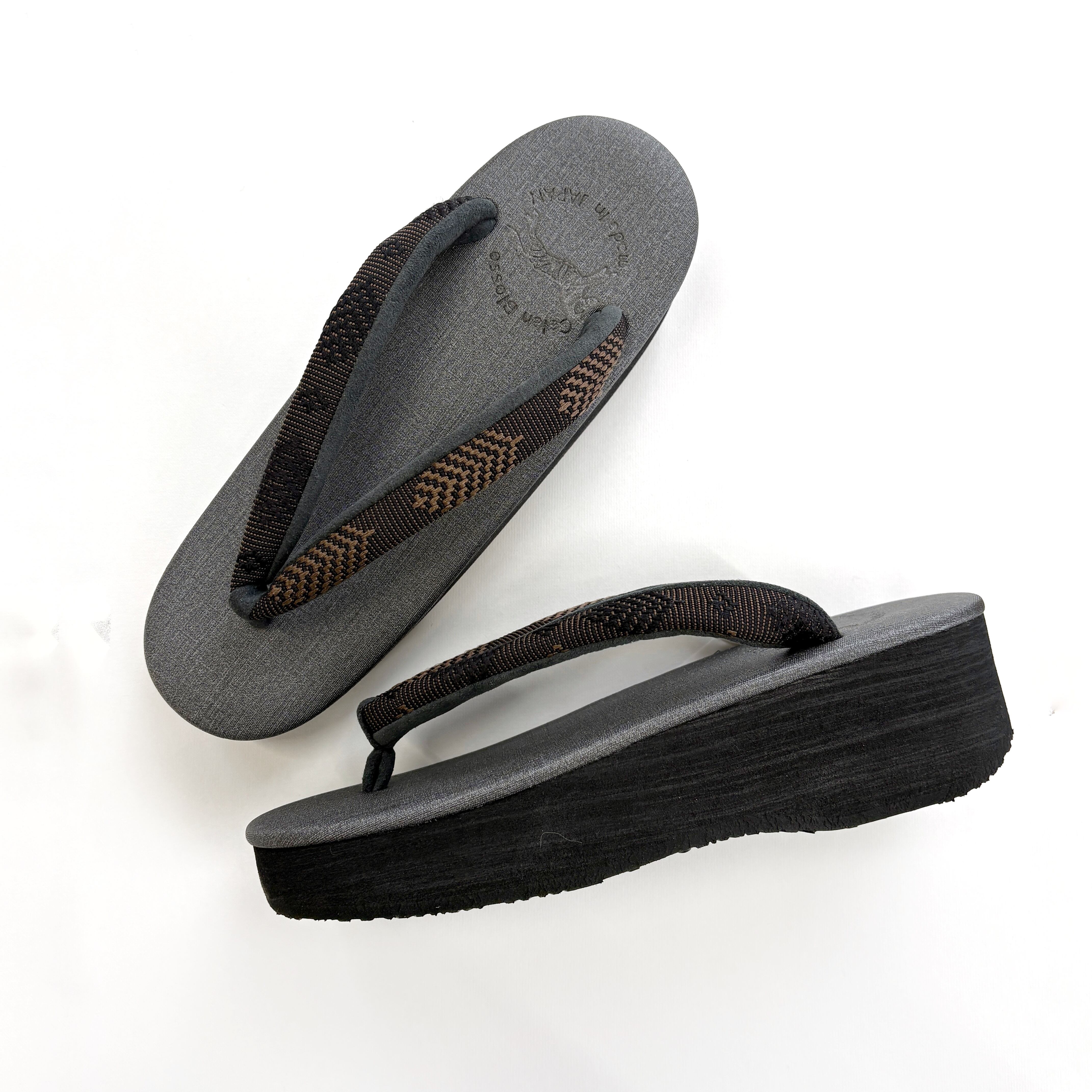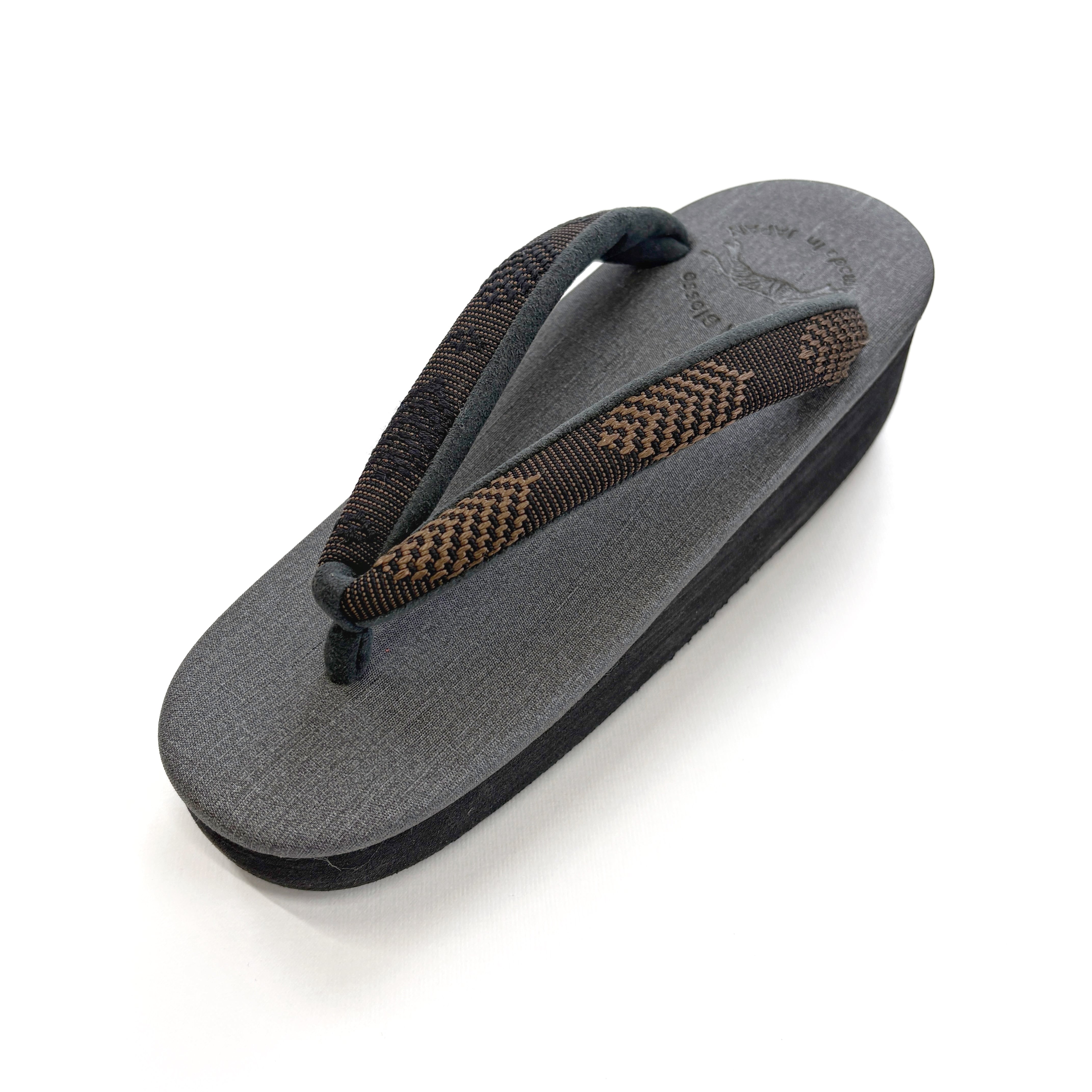 ブラック台にダークグレーの天、OLNの帯地「松菱」ブラウンの鼻緒。シックで落ち着いた配色が、コーディネートしやすくベーシックに活躍する一足です。織りの立体感が特徴的な鼻緒が、シンプルながらもおしゃれな足元を演出してくれます。