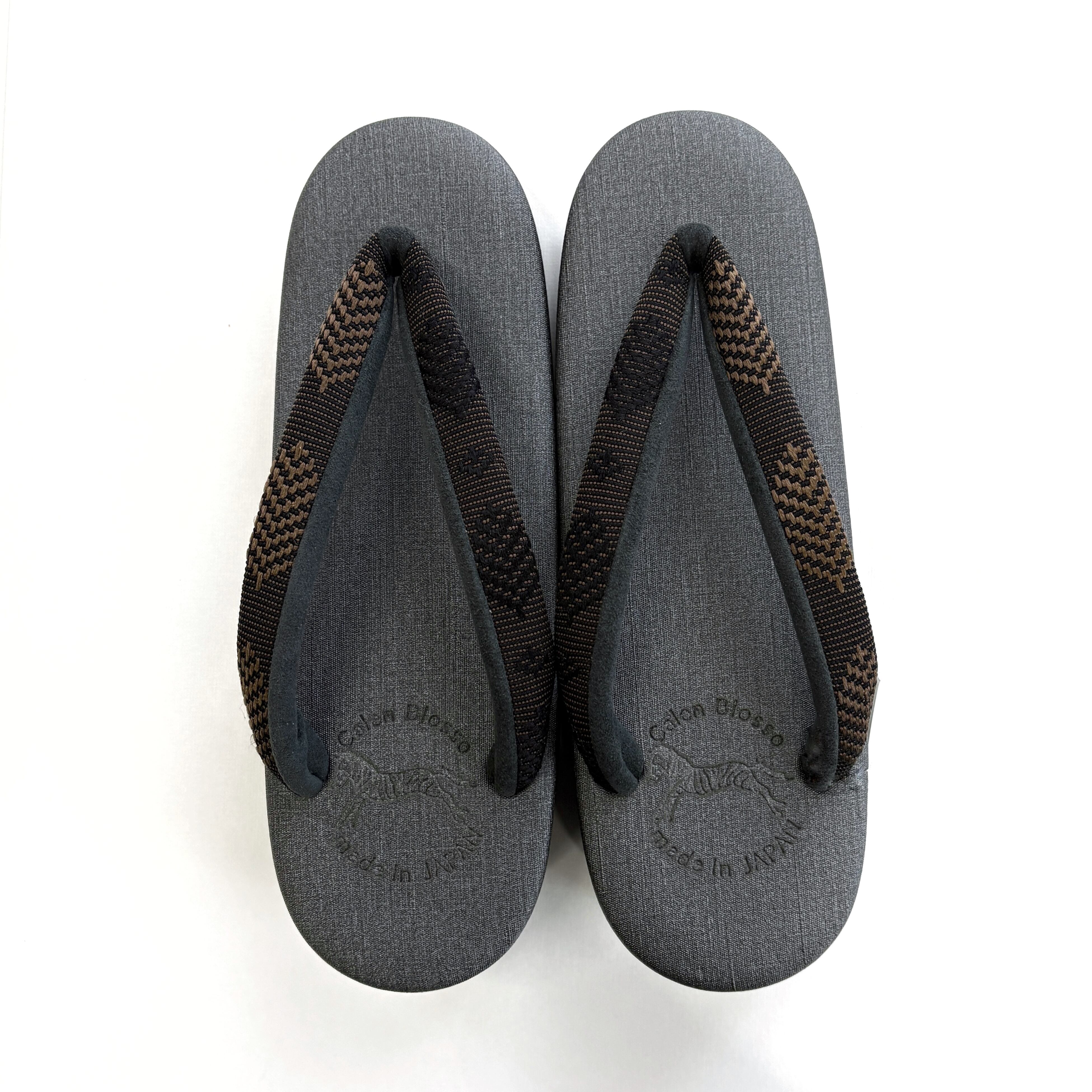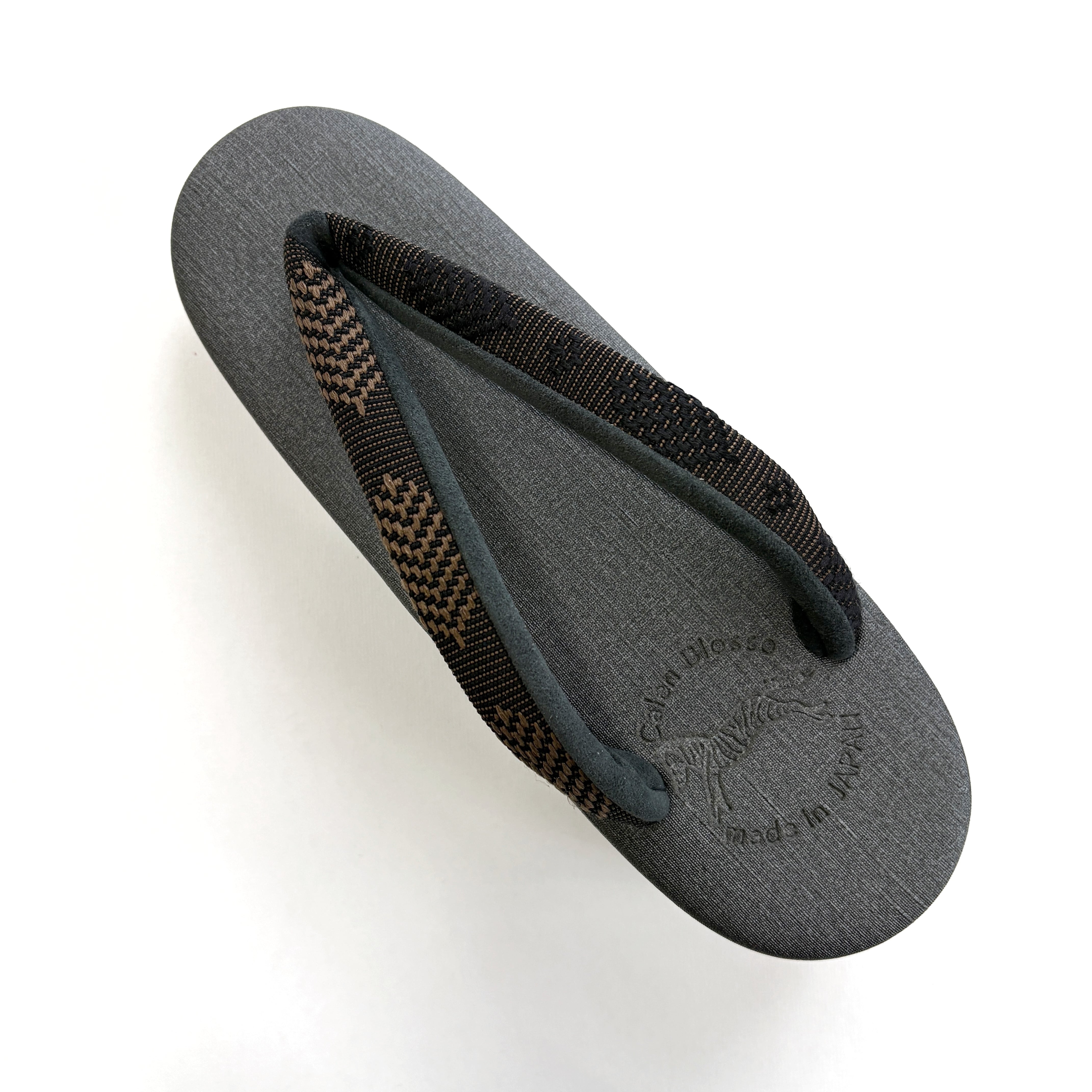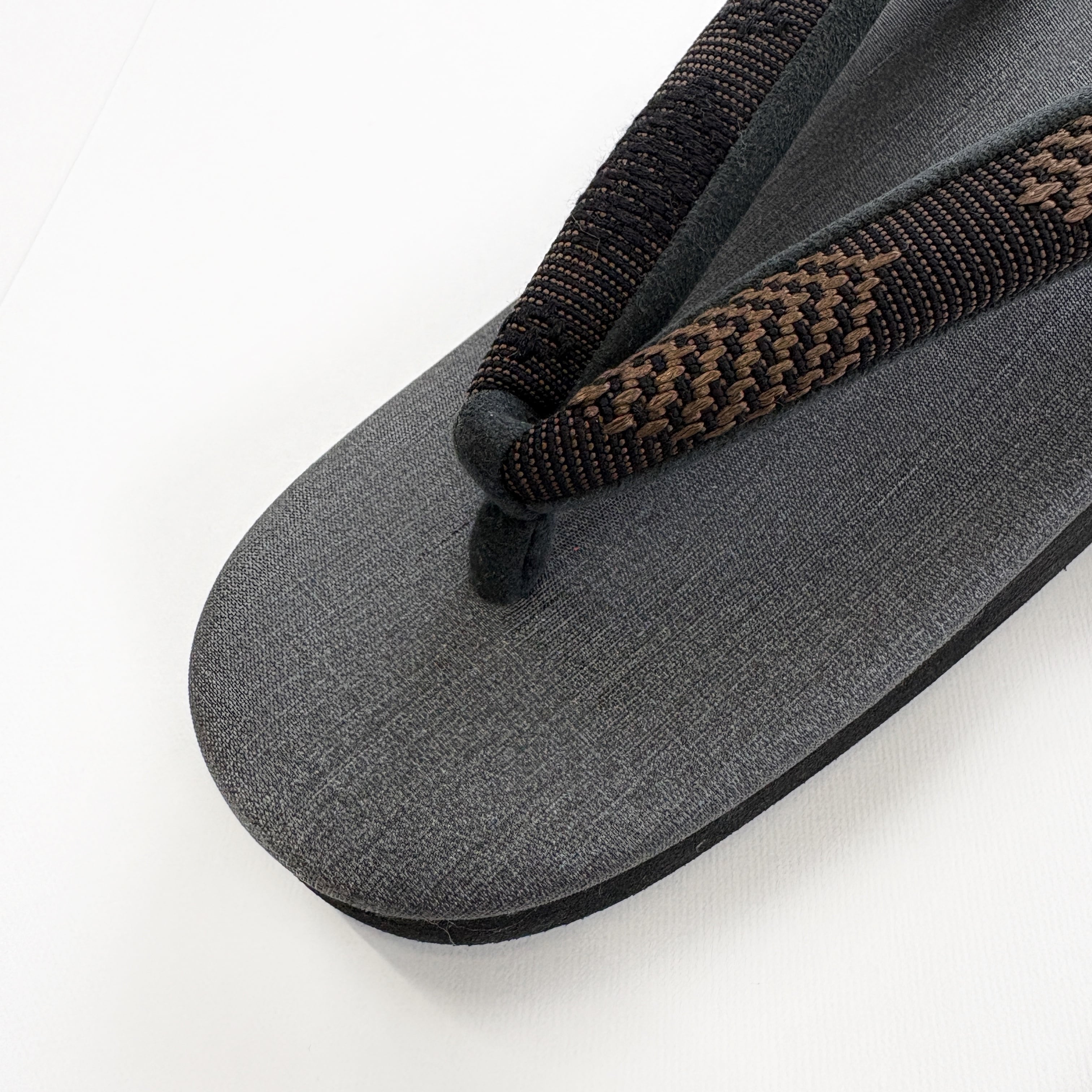 ブラック台にダークグレーの天、OLNの帯地「松菱」ブラウンの鼻緒。シックで落ち着いた配色が、コーディネートしやすくベーシックに活躍する一足です。織りの立体感が特徴的な鼻緒が、シンプルながらもおしゃれな足元を演出してくれます。