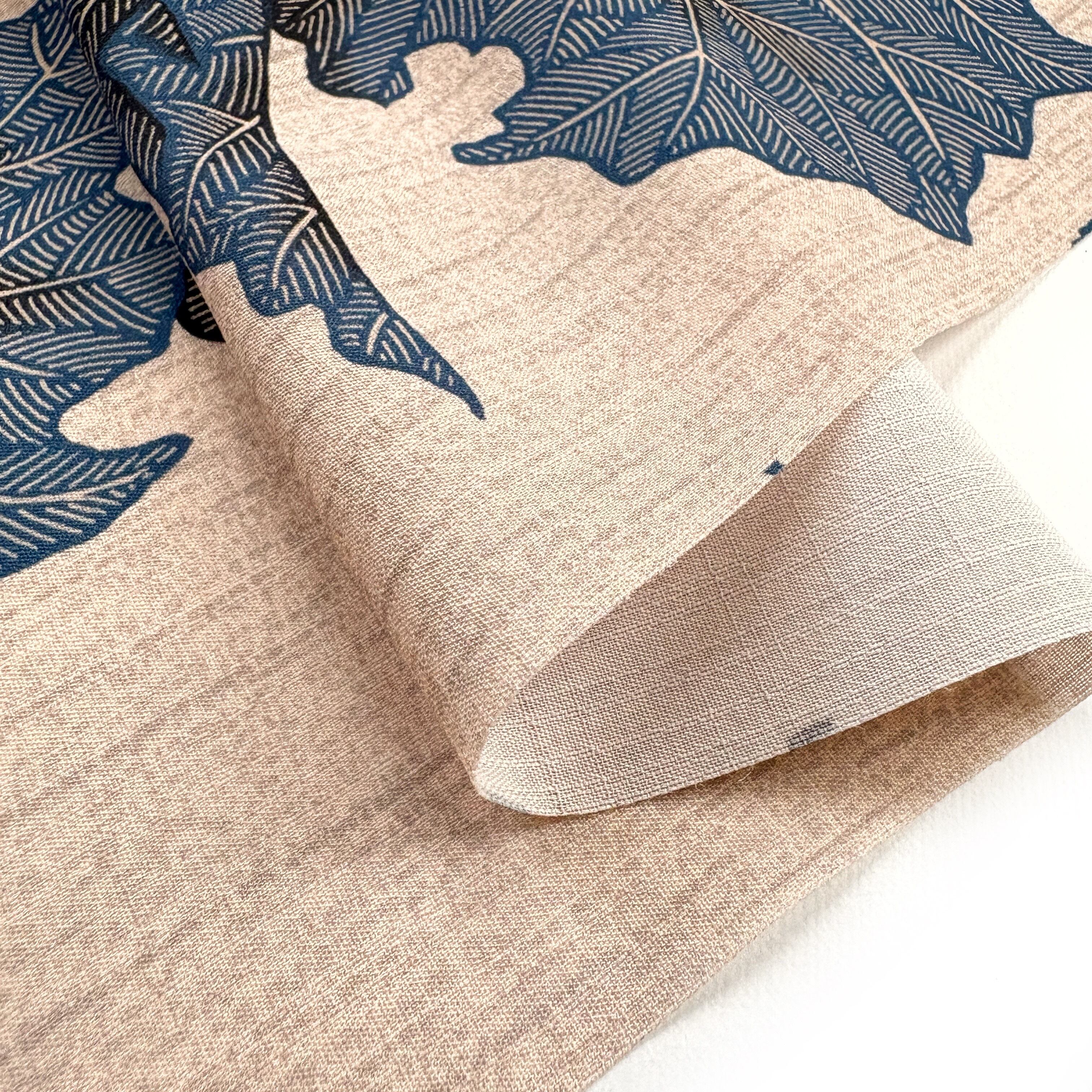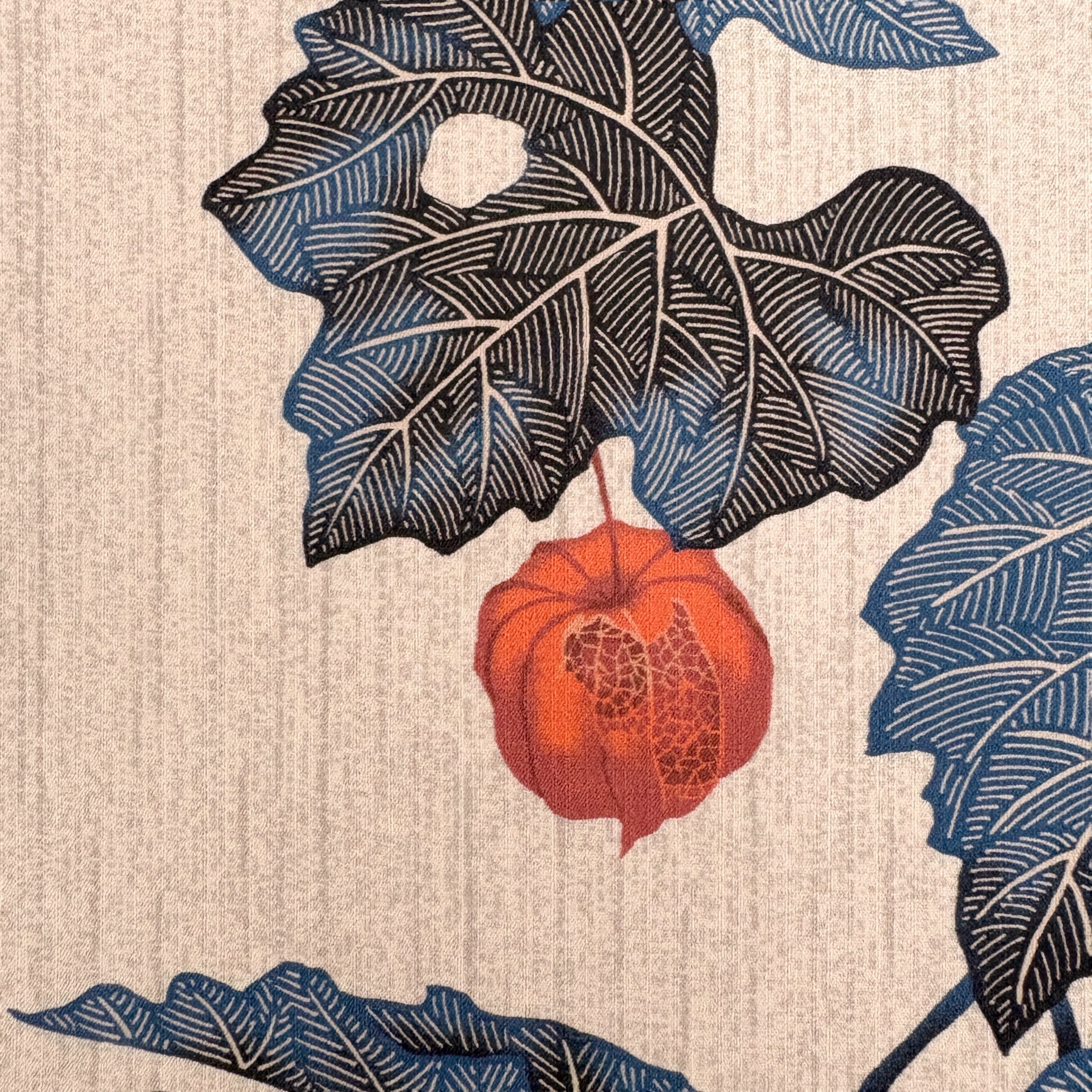ちょっと渋みのある配色で風情たっぷりにデザインされた鬼灯の柄。綿紬のようにも見えるベージュの地、型染のような藍色の濃淡の葉、鬼灯の実の葉脈と陰影など、細部まで丁寧に描かれた奥行きのある素敵な柄。型染め調の高級感、アンティーク着物のようなレトロ感、様々な方向にコーディネートが楽しめる一枚です。