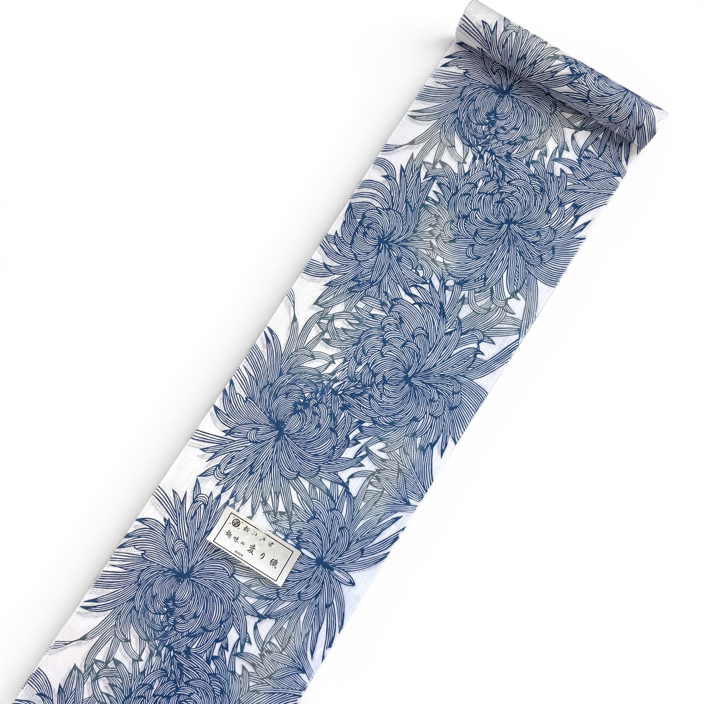 涼やかな白にブルーの中に、菊の花の輪郭部分はグレーのグラデーションで表現され、シンプルな配色の中にも立体感と奥行きのあるデザインです。浴衣らしい涼やかさと潔さと同時に、上品な華やかさも感じられる、暑い夏にとても素敵な大人の女性らしい着こなしをお楽しみいただけます。