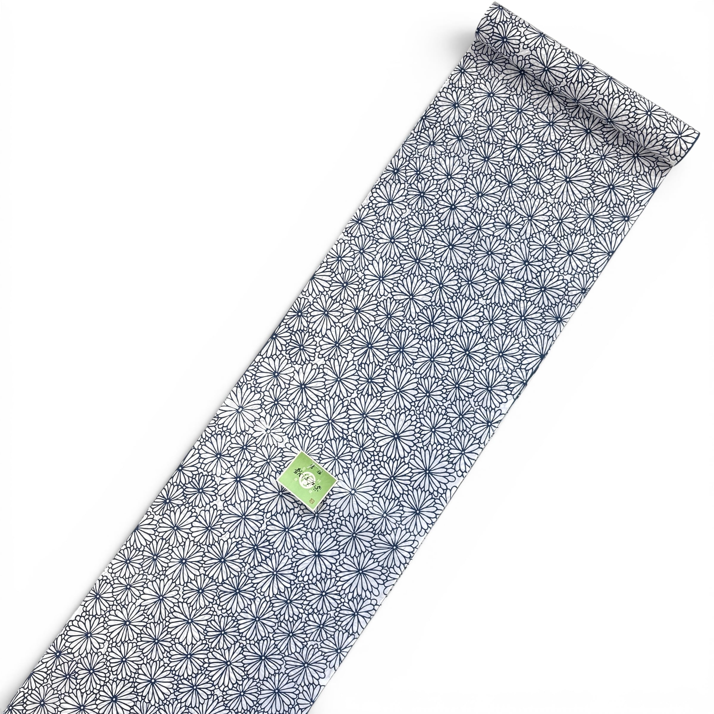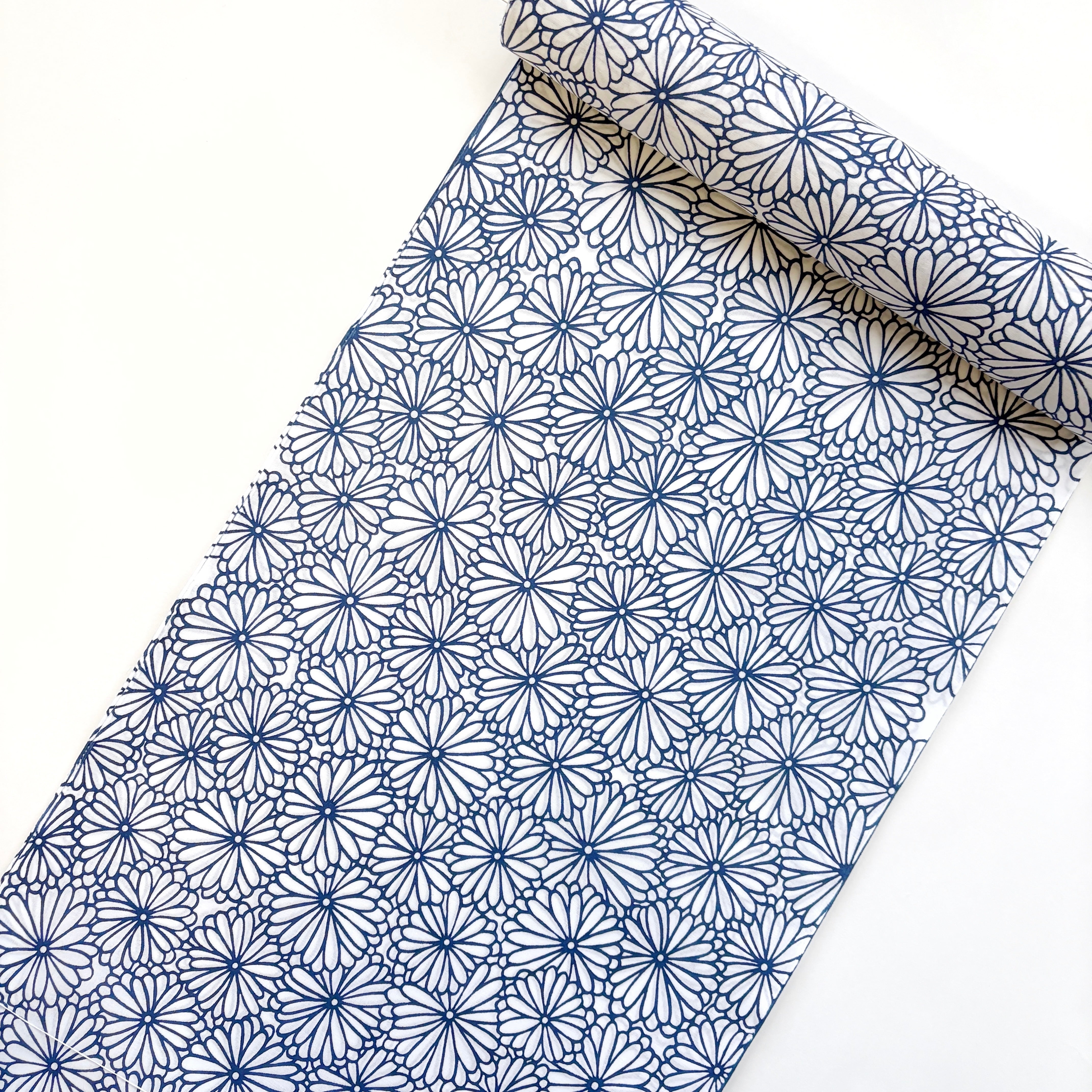 昔ながらの浴衣らしい白の綿コーマにくっきりと紺で染められたシンプルな菊の柄の連続が、可愛らしくも潔く粋で夏らしい、浴衣ならではの古典的な良さが存分に感じられる一反です。