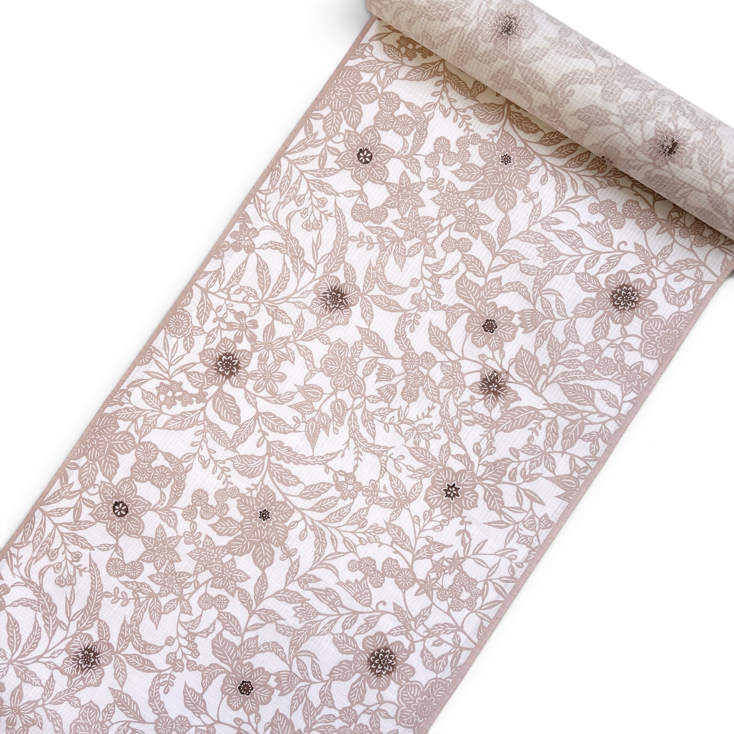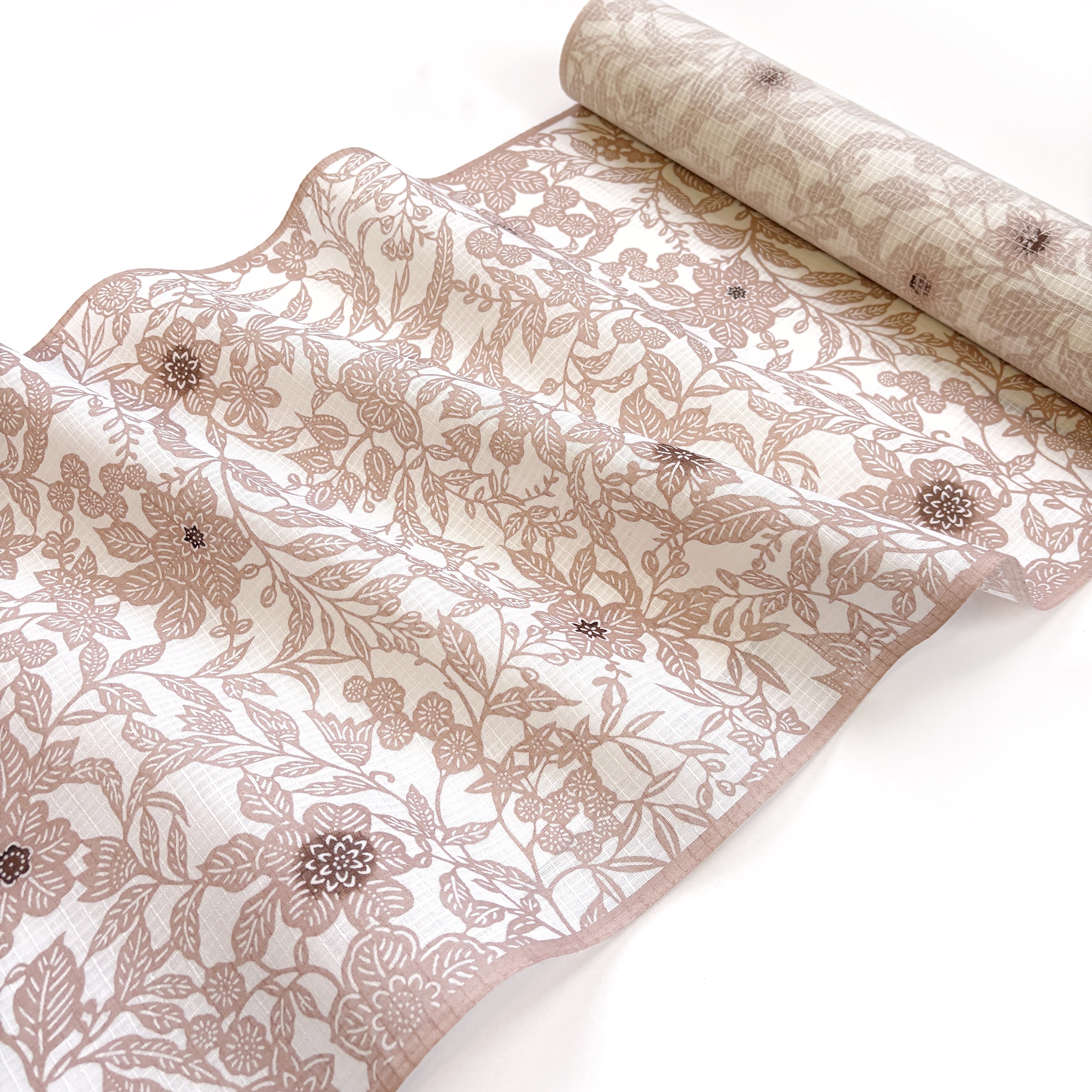 柔らかく落ち着いたピンクベージュ草花が上品な一反。