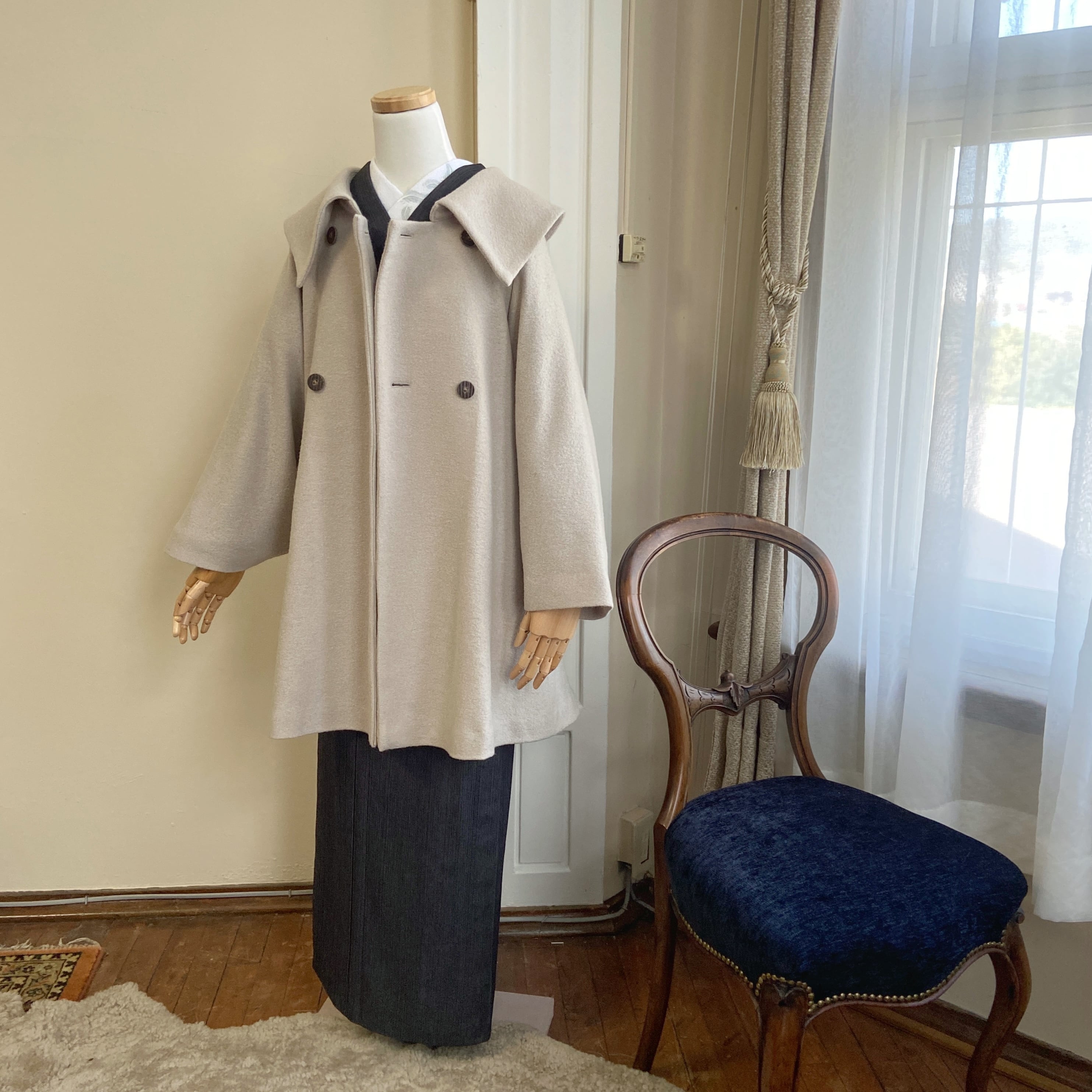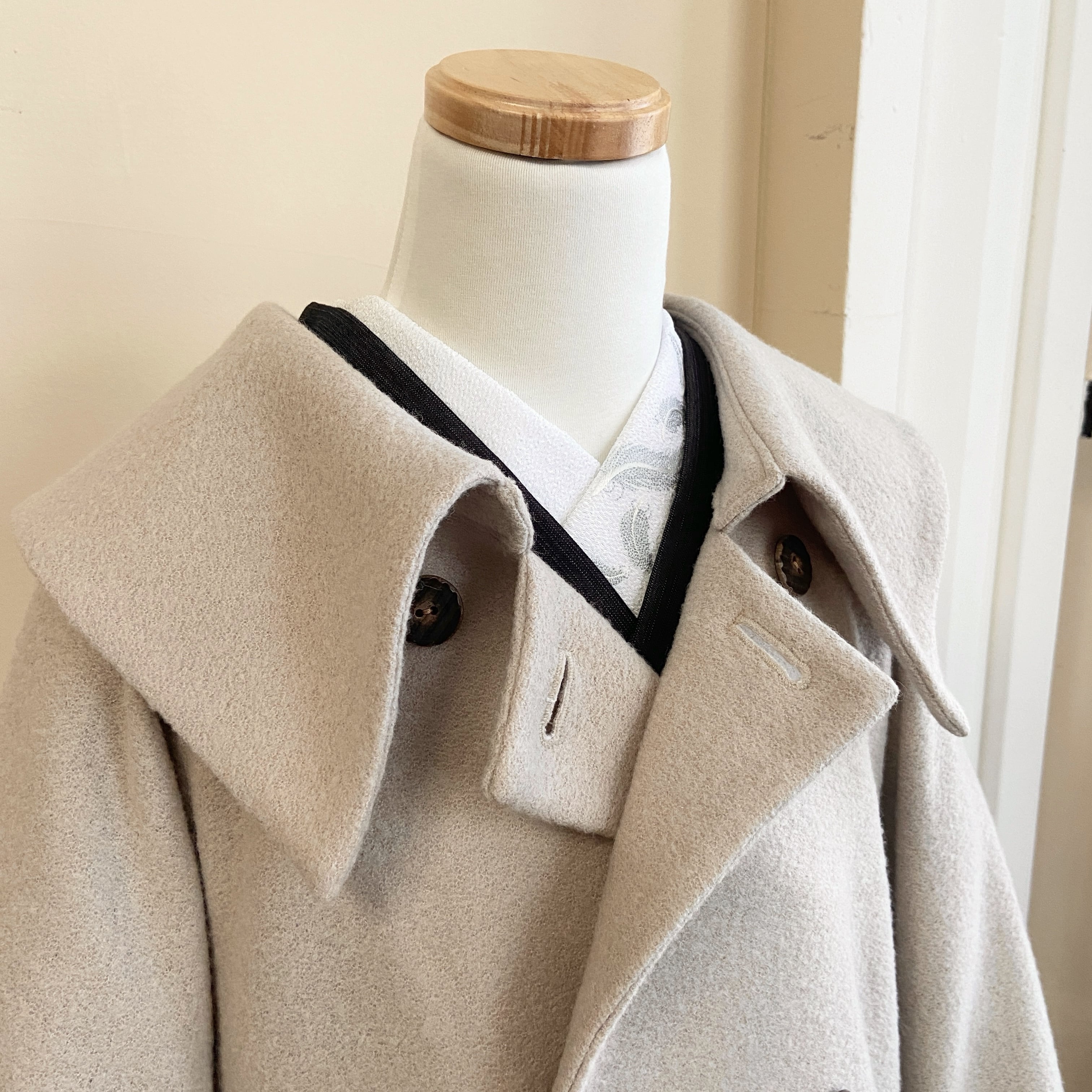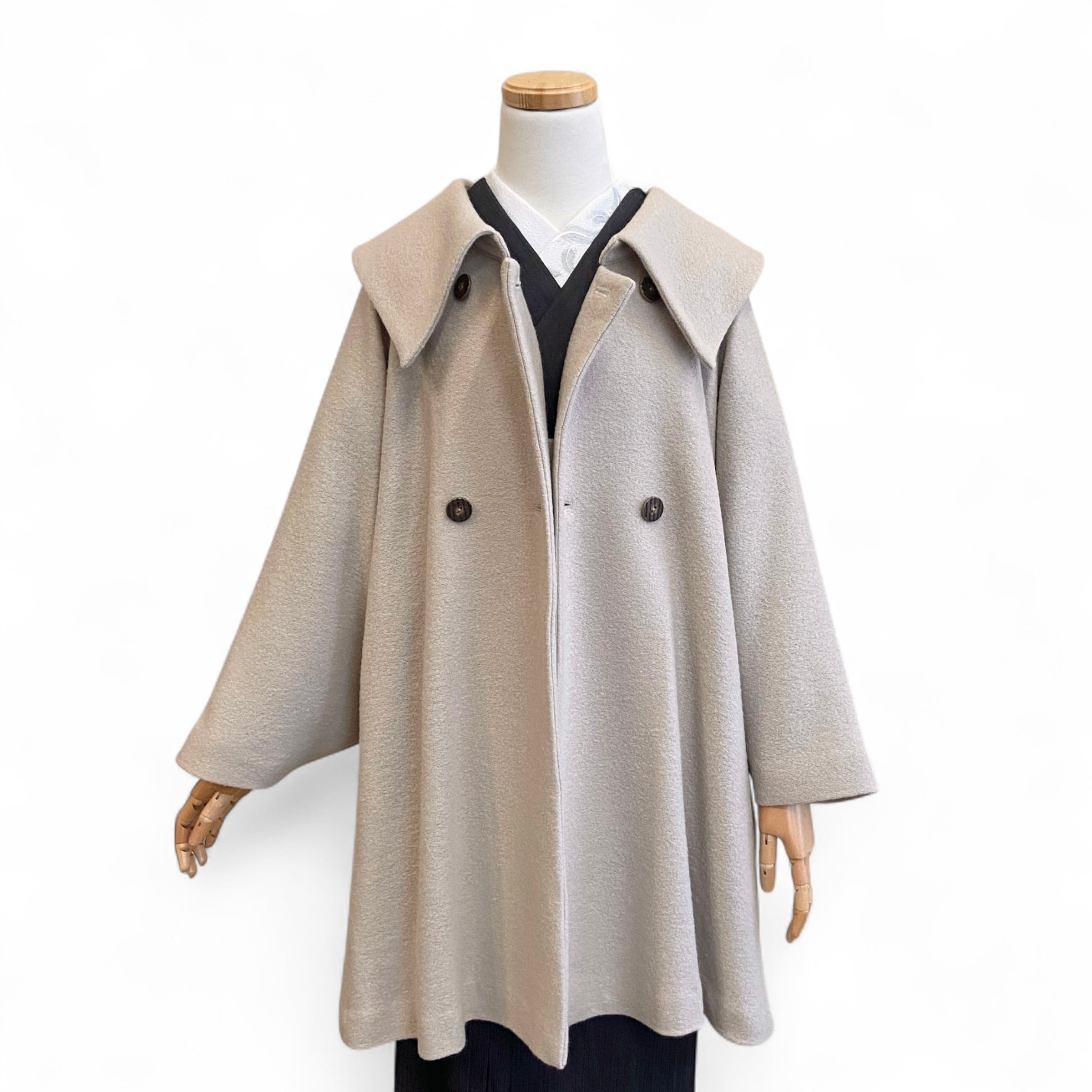 大きな衿と裾が広がるシルエットが印象的な、和洋兼用のコート。