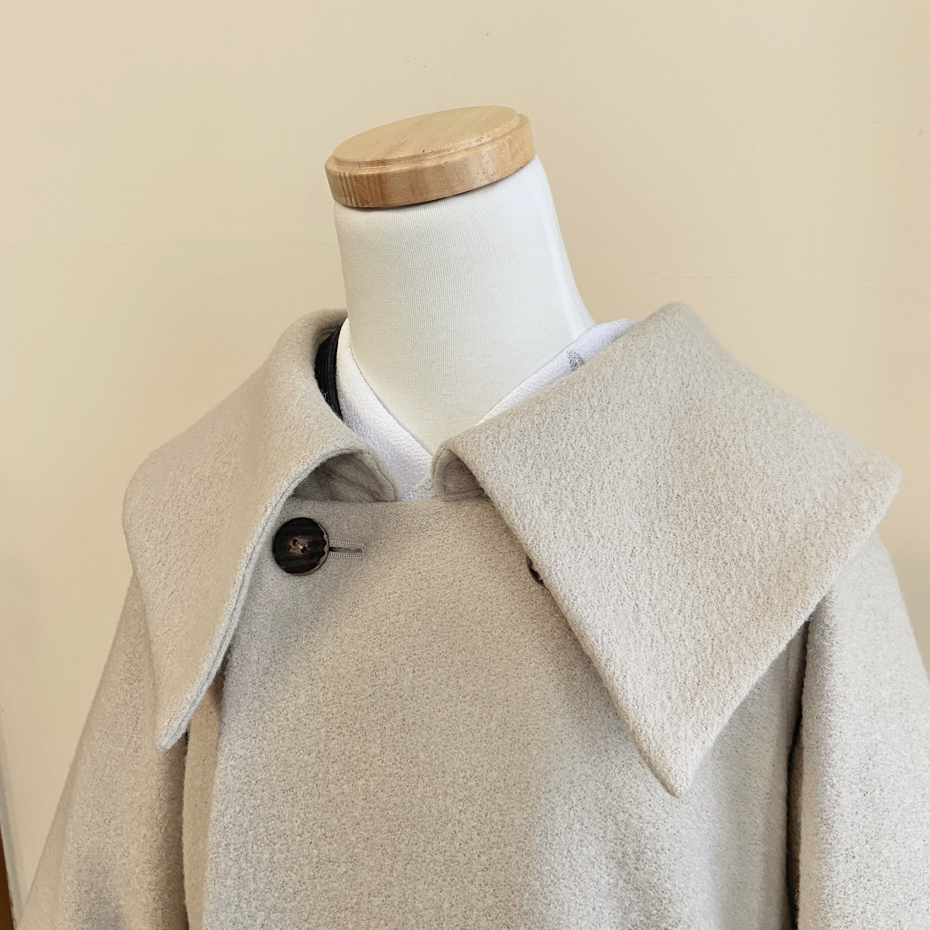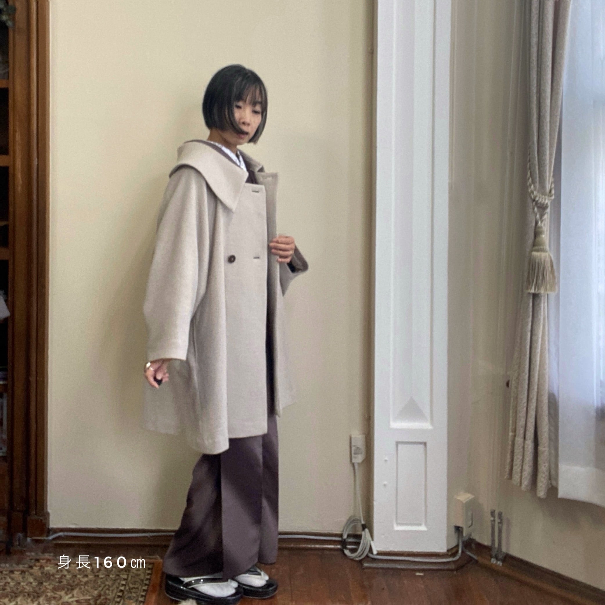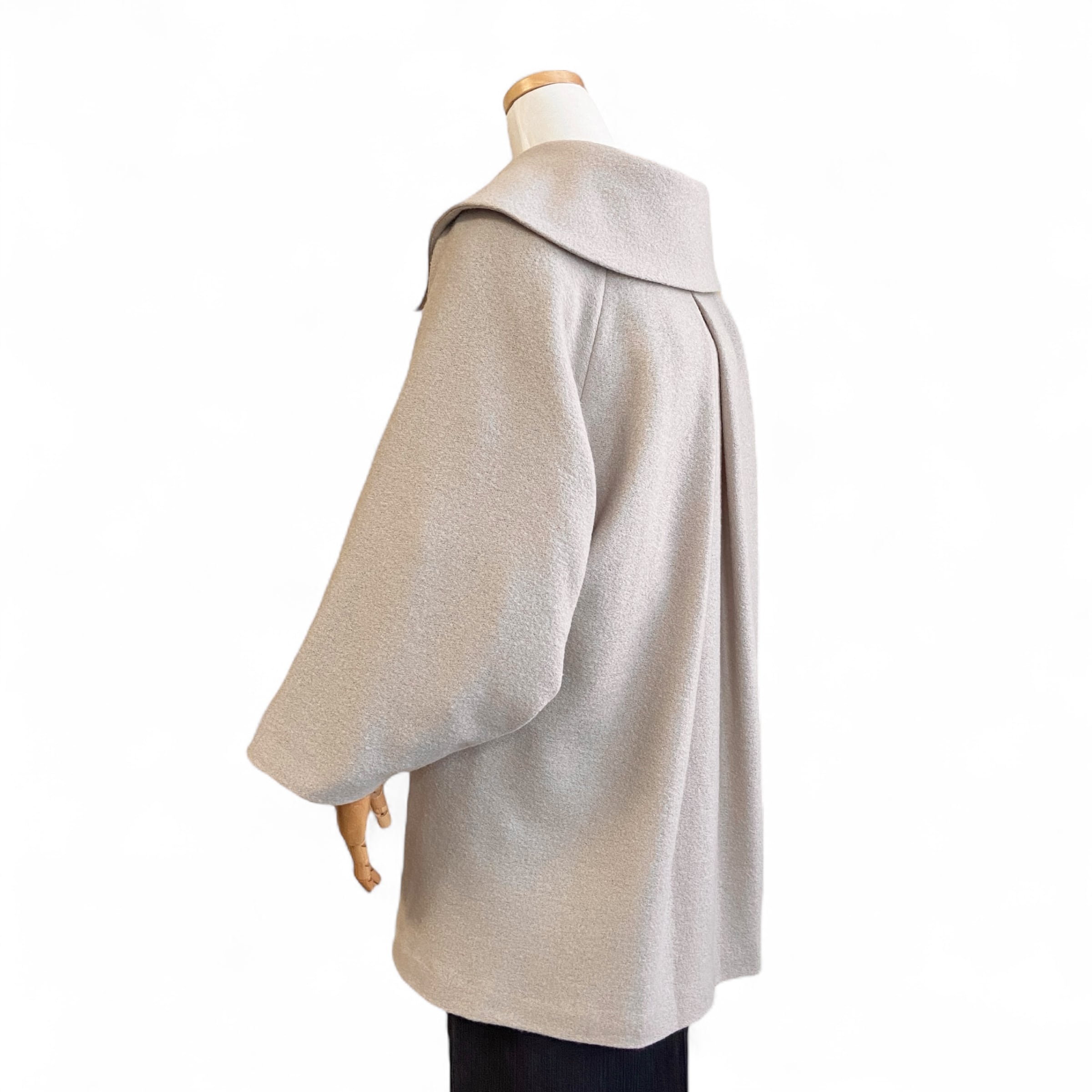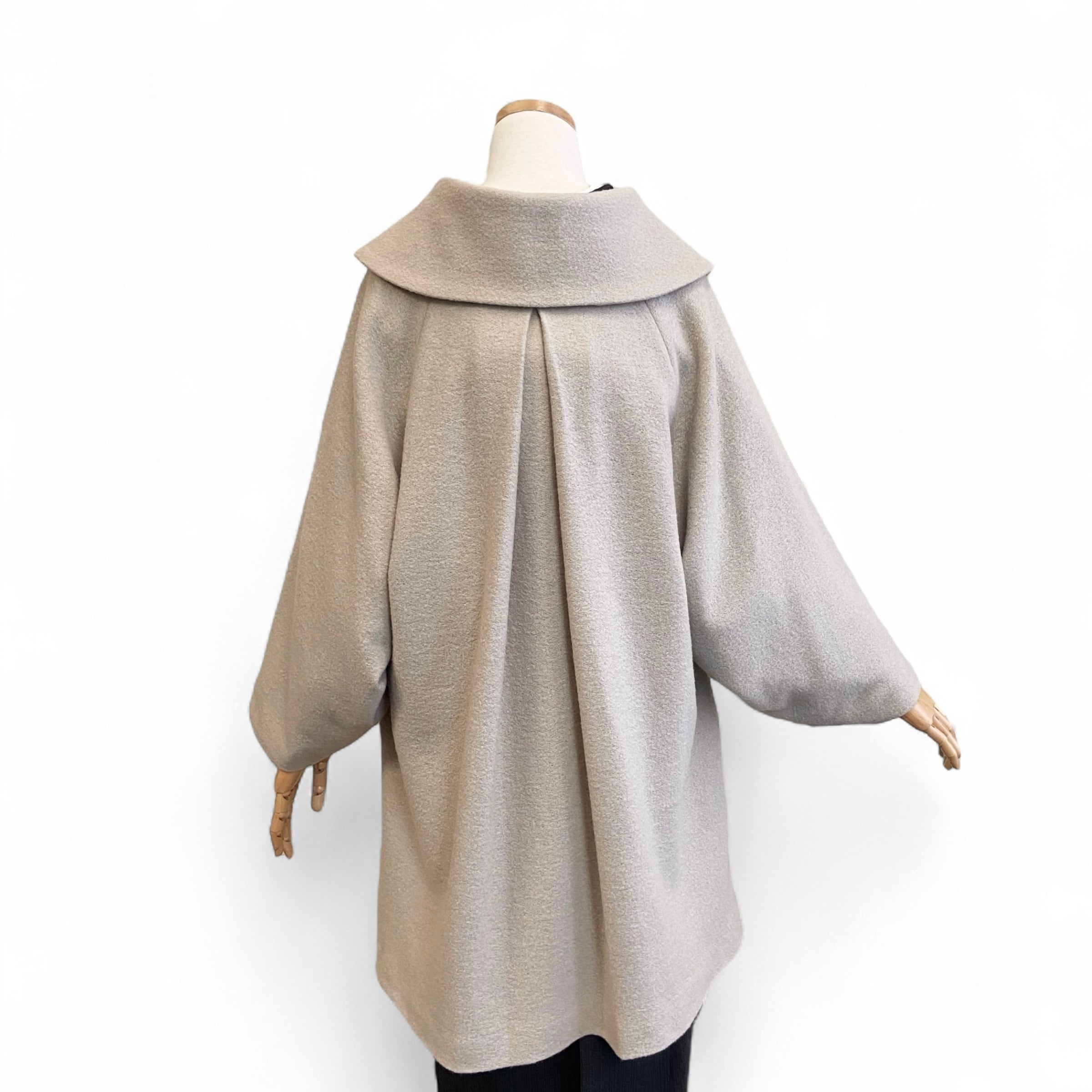 大きな衿と裾が広がるシルエットが印象的な、和洋兼用のコート。
