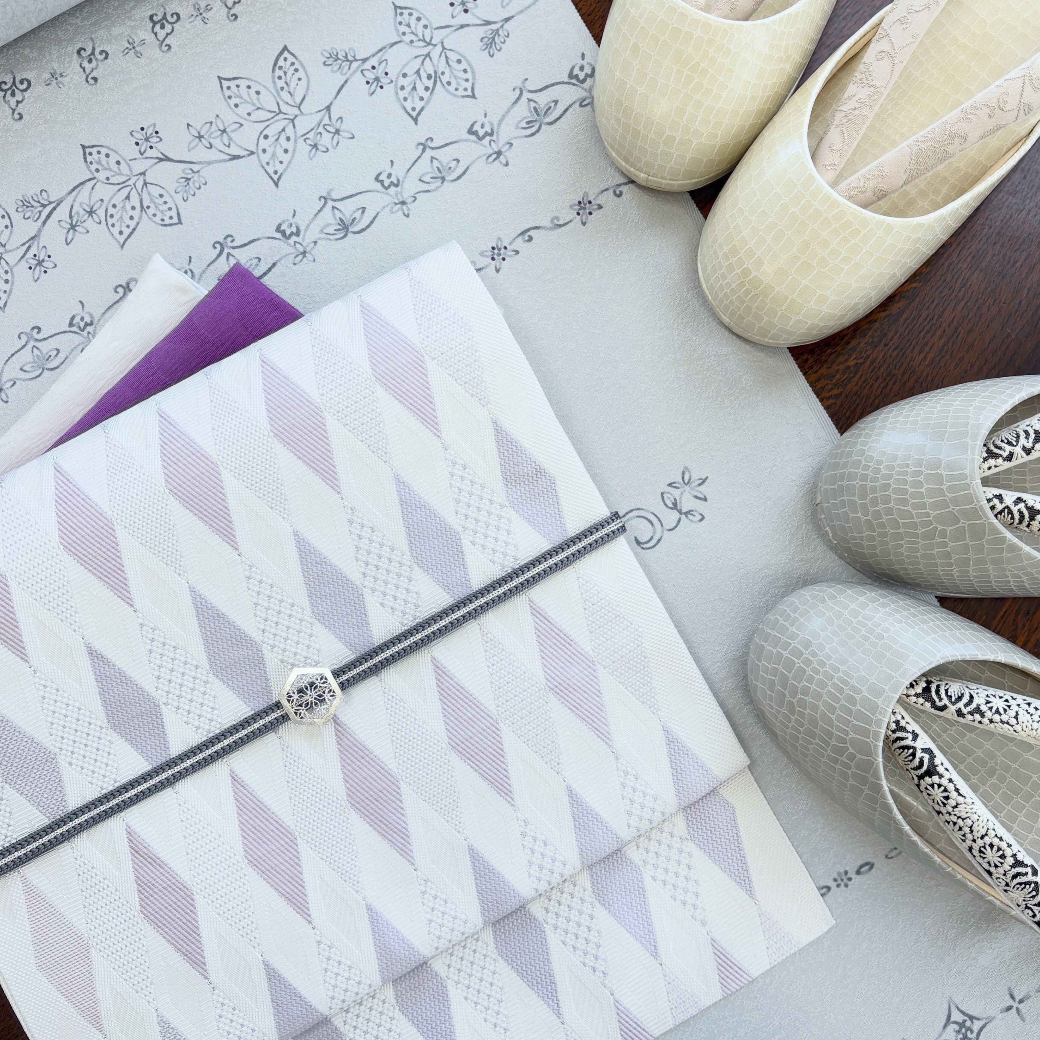 白地にラベンダーカラーの綺麗な配色、ダイヤの頂点に銀糸の点がさりげなく、モダンな幾何学模様がスタイリッシュかつ上品でコーディネートしやすい帯です。